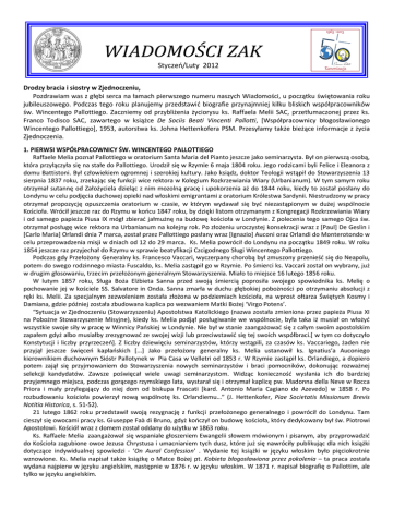 WIADOMOŚCI ZAK Styczeń/Luty 2012 Drodzy bracia i siostry w Zjednoczeniu, Pozdrawiam was z głębi serca na łamach pierwszego numeru naszych Wiadomości, u początku świętowania roku jubileuszowego. Podczas tego roku planujemy przedstawić biografie przynajmniej kilku bliskich współpracowników św. Wincentego Pallottiego. Zaczniemy od przybliżenia życiorysu ks. Raffaela Melii SAC, przetłumaczonej przez ks. Franco Todisco SAC, zawartego w książce De Sociis Beati Vincenti Pallotti, [Współpracownicy błogosławionego Wincentego Pallottiego], 1953, autorstwa ks. Johna Hettenkofera PSM. Przesyłamy także bieżące informacje z życia Zjednoczenia. 1. PIERWSI WSPÓŁPRACOWNICY ŚW. WINCENTEGO PALLOTTIEGO Raffaele Melia poznał Pallottiego w oratorium Santa Maria del Pianto jeszcze jako seminarzysta. Był on pierwszą osobą, która przyłączyła się na stałe do Pallottiego. Urodził się w Rzymie 6 maja 1804 roku. Jego rodzicami byli Felice i Eleanora z domu Battistoni. Był człowiekiem ogromnej i szerokiej kultury. Jako ksiądz, doktor Teologii wstąpił do Stowarzyszenia 13 sierpnia 1837 roku, zrzekając się funkcji wice rektora w Kolegium Rozkrzewiania Wiary (Urbanianum). W tym samym roku otrzymał sutannę od Założyciela dzieląc z nim mozolną pracę i upokorzenia aż do 1844 roku, kiedy to został posłany do Londynu w celu podjęcia duchowej opieki nad włoskimi emigrantami z oratorium Królestwa Sardynii. Niestrudzony w pracy otrzymał propozycję opuszczenia oratorium w czasie, w którym wydawał się być niezastąpionym w dużej wspólnocie Kościoła. Wrócił jeszcze raz do Rzymu w końcu 1847 roku, by dzięki listom otrzymanym z Kongregacji Rozkrzewiania Wiary i od samego papieża Piusa IX mógł zbierać jałmużnę na budowę kościoła w Londynie. Z polecenia tego samego Ojca św. otrzymał posługę wice rektora na Urbanianum na kolejny rok. Po złożeniu uroczystej konsekracji wraz z [Paul] De Geslin i [Carlo Maria] Orlandi dnia 7 marca, został przez Pallottiego posłany wraz [Ignazio] Auconi oraz Orlandi do Monterotondo w celu przeprowadzenia misji w dniach od 12 do 29 marca. Ks. Melia powrócił do Londynu na początku 1849 roku. W roku 1854 jeszcze raz przyjechał do Rzymu w sprawie beatyfikacji Czcigodnego Sługi Wincentego Pallottiego. Podczas gdy Przełożony Generalny ks. Francesco Vaccari, wyczerpany chorobą był zmuszony przenieść się do Neapolu, potem do swego rodzinnego miasta Fuscaldo, ks. Melia zastąpił go w Rzymie. Po śmierci ks. Vaccari został on wybrany, już w drugim głosowaniu, trzecim przełożonym generalnym Stowarzyszenia. Miało to miejsce 16 lutego 1856 roku. W lutym 1857 roku, Sługa Boża Elżbieta Sanna przed swoją śmiercią poprosiła swojego spowiednika ks. Melię o pochowanie jej w kościele SS. Salvatore in Onda. Sanna zmarła w duchu głębokiej pobożności po otrzymaniu absolucji z ręki ks. Melii. Za specjalnym zezwoleniem została złożona w podziemiach kościoła, na wprost ołtarza Świętych Kosmy i Damiana, gdzie później została zbudowana kaplica po wezwaniem Matki Bożej ‘Virgo Potens’. “Sytuacja w Zjednoczeniu (Stowarzyszeniu) Apostolstwa Katolickiego (nazwa została zmieniona przez papieża Piusa XI na Pobożne Stowarzyszenie Misyjne), kiedy ks. Melia podjął posługiwanie we wspólnocie, była taka iż musiał on włożyć wszystkie swoje siły w pracę w Winnicy Pańskiej w Londynie. Nie był w stanie zaangażować się z całym swoim apostolskim zapałem gdyż albo musiałby zrezygnować ze swojej wizji lub przeciwstawić się tej swoich współbraci.[ w tym co dotyczyło Konstytucji i liczby przyrzeczeń]. Z liczby dziewięciu seminarzystów, którzy wstąpili, za czasów ks. Vaccariego, żaden nie przyjął jeszcze święceń kapłańskich [...] Jako przełożony generalny ks. Melia ustanowił ks. Ignatius’a Auconiego kierownikiem duchownym Sióstr Pallotynek w Pia Casa w Velletri od 1853 r. W Rzymie zastąpił ks. Orlandiego, a dopiero potem zajął się przyjmowaniem do Stowarzyszenia nowych seminarzystów i braci pomocników, dokonując rozważnej selekcji kandydatów. Zawsze poświęcał wiele uwagi seminarzystom. Widząc konieczność wysłania ich do bardziej przyjemnego miejsca, podczas gorącego rzymskiego lata, wystarał się i otrzymał kaplicę pw. Madonna della Neve w Rocca Priora i mały przylegający do niej dom od biskupa Frascati [kard. Antonio Maria Cagiano de Azevedo] w 1858 r. Po rozbudowaniu kościoła powierzył nową wspólnotę ks. Orlandiemu…” (J. Hettenkofer, Piae Societatis Missionum Brevis Notitia Historica, s. 51-52). 21 lutego 1862 roku przedstawił swoją rezygnację z funkcji przełożonego generalnego i powrócił do Londynu. Tam cieszył się owocami pracy ks. Giuseppe Faà di Bruno, gdyż kończył on budowę kościoła, który dedykowany był św. Piotrowi Apostołowi. Kościół wraz z domem został oddany do użytku w 1863 roku. Ks. Raffaele Melia zaangażował się wspaniale głoszeniem Ewangelii słowem mówionym i pisanym, aby przyprowadzić do Kościoła zagubione owce Jezusa Chrystusa i umacnianiem tych dusz, które już się nawróciły publikując dla nich książki dotyczące indywidualnej spowiedzi - ‘On Aural Confession’ . Wydanie tej książki w języku włoskim było pięciokrotnie wznowione. Ks. Melia napisał także książkę o Matce Bożej pt. Kobieta błogosławiona przez pokolenia – ta praca została wydana najpierw w języku angielskim, następnie w 1876 r. w języku włoskim. W 1871 r. napisał biografię o Pallottim, ale tylko w języku angielskim. Wyczerpany pracą oraz z powodu wieku powrócił do Rzymu w 1876 roku. Podjął się pomocy proboszczowi kościoła Madonna della Neve w Rocca Priora. Słuchając spowiedzi w uroczystość Wszystkich Świętych oraz w dzień zaduszny ks. Melia przeziębił się i zachorował. Po powrocie do Rzymu zmarł 11 listopada 1876 roku, po przyjęciu sakramentu namaszczenia chorych