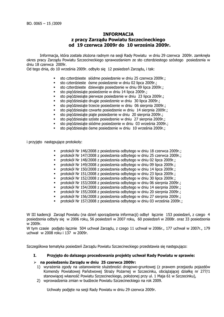 BO. 0065 – 15 /2009 INFORMACJA z pracy Zarządu Powiatu Szczecineckiego od 19 czerwca 2009r do 10 września 2009r. Informacja, która została złożona radnym na sesji Rady Powiatu w dniu 29 czerwca 2009r. zamknęła okres pracy Zarządu Powiatu Szczecineckiego sprawozdaniem ze sto czterdziestego szóstego posiedzenia w dniu 18 czerwca 2009r. Od tego dnia, do 10 września 2009r. odbyło się 12 posiedzeń Zarządu, i tak: § § § § § § § § § § § § sto sto sto sto sto sto sto sto sto sto sto sto czterdzieste siódme posiedzenie w dniu 25 czerwca 2009r.; czterdzieste ósme posiedzenie w dniu 02 lipca 2009r.; czterdzieste dziewiąte posiedzenie w dniu 09 lipca 2009r.; pięćdziesiąte posiedzenie w dniu 14 lipca 2009r.; pięćdziesiąte pierwsze posiedzenie w dniu 23 lipca 2009r.; pięćdziesiąte drugie posiedzenie w dniu 30 lipca 2009r.; pięćdziesiąte trzecie posiedzenie w dniu 06 sierpnia 2009r.; pięćdziesiąte czwarte posiedzenie w dniu 14 sierpnia 2009r.; pięćdziesiąte piąte posiedzenie w dniu 20 sierpnia 2009r.; pięćdziesiąte szóste posiedzenie w dniu 27 sierpnia 2009r.; pięćdziesiąte siódme posiedzenie w dniu 03 września 2009r.; pięćdziesiąte ósme posiedzenie w dniu 10 września 2009r.; i przyjęto następujące protokoły: § § § § § § § § § § § § protokół protokół protokół protokół protokół protokół protokół protokół protokół protokół protokół protokół Nr Nr Nr Nr Nr Nr Nr Nr Nr Nr Nr Nr 146/2008 147/2008 148/2008 149/2008 150/2008 151/2008 152/2008 153/2008 154/2008 155/2008 156/2008 157/2008 z z z z z z z z z z z z posiedzenia posiedzenia posiedzenia posiedzenia posiedzenia posiedzenia posiedzenia posiedzenia posiedzenia posiedzenia posiedzenia posiedzenia odbytego w dniu 18 odbytego w dniu 25 odbytego w dniu 02 odbytego w dniu 09 odbytego w dniu 14 odbytego w dniu 23 odbytego w dniu 30 odbytego w dniu 06 odbytego w dniu 14 odbytego w dniu 20 odbytego w dniu 27 odbytego w dniu 03 czerwca 2009r.; czerwca 2009r.; lipca 2009r.; lipca 2009r.; lipca 2009r.; lipca 2009r.; lipca 2009r.; sierpnia 2009r.; sierpnia 2009r.; sierpnia 2009r.; sierpnia 2009r.; września 2009r.; W III kadencji Zarząd Powiatu (na dzień sporządzenia informacji) odbył łącznie 153 posiedzeń, z czego 4 posiedzenia odbyły się w 2006 roku, 56 posiedzeń w 2007 roku, 60 posiedzeń w 2008r. oraz 33 posiedzenia w 2009r. W tym czasie podjęto łącznie 504 uchwał Zarządu, z czego 11 uchwał w 2006r., 177 uchwał w 2007r., 179 uchwał w 2008 roku i 137 w 2009r. Szczegółowa tematyka posiedzeń Zarządu Powiatu Szczecineckiego przedstawia się następująco: I. Przyjęto do dalszego procedowania projekty uchwał Rady Powiatu w sprawie: Ø na posiedzeniu Zarządu w dniu 25 czerwca 2009r: 1) wyrażenia zgody na ustanowienie służebności drogowo-gruntowej (z prawem przejazdu pojazdów Komendy Powiatowej Państwowej Straży Pożarnej w Szczecinku, obciążającej działkę nr 277/1 stanowiącej własność Powiatu Szczecineckiego, położonej przy ul. 1 Maja 61 w Szczecinku), 2) wprowadzenia zmian w budżecie Powiatu Szczecineckiego na rok 2009. Uchwały podjęte na sesji Rady Powiatu w dniu 29 czerwca 2009r. Ø na posiedzeniu Zarządu w dniu 09 lipca 2009r: 3) wprowadzenia zmian w budżecie Powiatu Szczecineckiego na rok 2009. Wprowadzenie zmian w wydatkach budżetu Powiatu Szczecineckiego i w planach finansowych jednostek na 2009 rok polegają na przesunięciu wydatków między paragrafami, rozdziałami i działami budżetu i mają na celu przekazanie środków do Powiatowego Urzędu Pracy w Szczecinku, jako 20 % wkładu własnego samorządu powiatu, w utworzeniu Centrum Aktywizacji Zawodowej. 4) wprowadzenia zmian do limitu wydatków Powiatu Szczecineckiego na wieloletnie programy inwestycyjne realizowane w latach 2009-2011 Zmiany w limitach wydatków inwestycyjnych wynikają z poszerzenia zakresu rzeczowego dotychczasowego zadania pn.: „Przebudowa drogi nr 1266Z Trzebiechowo – Kusowo”, przy niezmienionej wartości kosztorysowej zadania (300.000,- zł) oraz czasie realizacji (2009r.), a także z możliwości ubiegania się o pozyskanie środków unijnych – w wysokości 50 % planowanych nakładów na realizację „Budowy boiska wielofunkcyjnego z wyposażeniem przy I LO im. Ks. Elżbiety w Szczecinku”. I Liceum Ogólnokształcące im. Ks. Elżbiety w Szczecinku , jako inwestor, zmienia nazwę zadania z: „Budowa sali gimnastycznej” na „Budowa sali gimnastycznej z zapleczem i boiska wielofunkcyjnego przy I LO im. Ks. Elżbiety w Szczecinku”. 5) wyrażenia/odmowy* zgody na rozwiązanie stosunku pracy z radnym Zarządu Powiatu zgłosił wniosek w sprawie zwołania sesji Rady Powiatu w trybie art. 15 ust 7 ustawy z dnia 5 czerwca 1998r. o samorządzie powiatowym dla podjęcia rozstrzygnięcia w formie wymienionych wyżej uchwał spraw związanych z wykonywaniem zadań Powiatu. Uchwały podjęto na sesji Rady Powiatu zwołanej na dzień 10 lipca 2009r. Ø na posiedzeniu Zarządu w dniu 23 lipca 2009r: 6) wprowadzenia zmian w budżecie Powiatu Szczecineckiego na rok 2009, 7) zaciągnięcia pożyczki na dofinansowanie zadania inwestycyjnego pn. „Wykorzystanie energii słonecznej do przygotowania ciepłej wody użytkowej – kolektory słoneczne wraz z instalacją solarną w Domu Pomocy Społecznej w Bornem Sulinowie; Szacunkowy koszt realizacji inwestycji wynosi 702.993,- zł, z tego finansowanie ze środków pożyczki z Wojewódzkiego Funduszu Ochrony Środowiska i Gospodarki Wodnej w Szczecinie wyniesie 140.276,- zł. Istnieje możliwość uzyskania umorzenia pożyczki do wysokości 30 % jej kwoty. Ø na posiedzeniu Zarządu w dniu 30 lipca 2009r: 8) uchylenia uchwał w sprawie ustalenia najniższego wynagrodzenia zasadniczego w pierwszej kategorii zaszeregowania oraz uzgodnienia wartości jednego punktu dla pracowników jednostek organizacyjnych powiatu szczecineckiego, Ø na posiedzeniu Zarządu w dniu 06 sierpnia 2009r: 9) wp