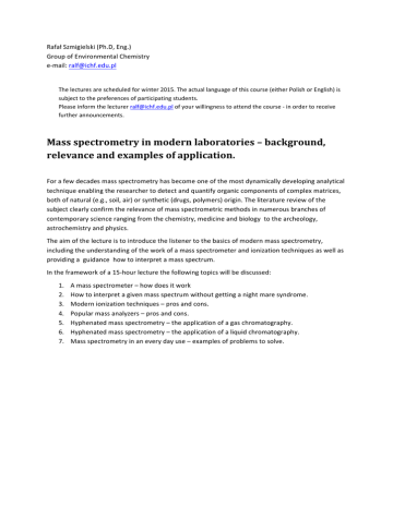 Rafał%Szmigielski%(Ph.D,%Eng.)% Group%of%Environmental%Chemistry% eAmail:%[email protected]% % The%lectures%are%scheduled%for%winter%2015.%The%actual%language%of%this%course%(either%Polish%or%English)%is% subject%to%the%preferences%of%participating%students.%% Please%inform%the%lecturer%[email protected]%of%your%willingness%to%attend%the%course%A%in%order%to%receive% further%announcements.% % Mass$spectrometry$in$modern$laboratories$–$background,$$ relevance$and$examples$of$application.$ % For%a%few%decades%mass%spectrometry%has%become%one%of%the%most%dynamically%developing%analytical% technique%enabling%the%researcher%to%detect%and%quantify%organic%components%of%complex%matrices,% both%of%natural%(e.g.,%soil,%air)%or%synthetic%(drugs,%polymers)%origin.%The%literature%review%of%the% subject%clearly%confirm%the%relevance%of%mass%spectrometric%methods%in%numerous%branches%of% contemporary%science%ranging%from%the%chemistry,%medicine%and%biology%%to%the%archeology,% astrochemistry%and%physics.%% The%aim%of%the%lecture%is%to%introduce%the%listener%to%the%basics%of%modern%mass%spectrometry,% including%the%understanding%of%the%work%of%a%mass%spectrometer%and%ionization%techniques%as%well%as%% providing%a%%guidance%%how%to%interpret%a%mass%spectrum.%% In%the%framework%of%a%15Ahour%lecture%the%following%topics%will%be%discussed:% 1. 2. 3. 4. 5. 6. 7. A%mass%spectrometer%–%how%does%it%work%%% How%to%interpret%a%given%mass%spectrum%without%getting%a%night%mare%syndrome.% Modern%ionization%techniques%–%pros%and%cons.% Popular%mass%analyzers%–%pros%and%cons.% Hyphenated%mass%spectrometry%–%the%application%of%a%gas%chromatography.% Hyphenated%mass%spectrometry%–%the%application%of%a%liquid%chromatography.% Mass%spectrometry%in%an%every%day%use%–%examples%of%problems%to%solve.% % % % Dr%inż.%Rafał%Szmigielski% Instytut%Chemii%Fizycznej%PAN,%Zespół%Chemii%Środowiska% eAmail:%[email protected]% Kurs%odbędzie%się%w%IChF%PAN%zimą%2015.%Językiem%wykładowym%będzie%polski%lub%angielski,%zależnie%od% potrzeb%słuchaczy.%%% Dalsze%%informacje%zostaną%przesłane%przez%wykładowcę%bezpośrednio%do%osób,%które%nadeślą%eNmailowe%% zgłoszenia%na%adres%[email protected]% % Spektrometria$mas$w$rękach$współczesnego$badacza$–$ podstawy,$znaczenie$$i$przykłady$zastosowań$ % Od%kilku%dekad%spektrometria%mas%jest%jedną%z%najszybciej%rozwijających%się%technik%analitycznych,% pozwalających%na%dokładną%i%jednoznaczną%analizę%jakościową%i%ilościową%związków%organicznych%w% złożonych%matrycach%pochodzenia%naturalnego%(np.%deszcz,%gleba)%oraz%syntetycznego%(np.%śladowe% zanieczyszczenie%leków).%Przegląd%piśmiennictwa%krajowego%i%zagranicznego%jednoznacznie% potwierdza%rosnące%znaczenie%tej%techniki%w%wielu%gałęziach%współczesnej%nauki,%poczynając%od% chemii,%medycyny%i%biologii%a%kończąc%na%archeologii,%geofizyce%i%astrochemii.%% Celem%wykładu%jest%przybliżenie%podstaw%działania%nowoczesnego%spektrometru%mas,%zrozumienia% istoty%pomiaru%oraz%interpretacji%otrzymanego%widma%masowego.%Przewiduje%się,%że%zaprezentowany% materiał%pozwoli%na%zwiększenie%pewności%młodego%badacza%w%zrozumieniu%i%interpretacji%danych% uzyskanych%z%pomiarów%za%pomocą%spektrometrii%mas.%% W%ramach%cyklu%15%godzinnego%wykładu%poruszone%zostaną%m.in.%następujące%zagadnienia:% 1. 2. 3. 4. 5. 6. 7. % % % % Budowa%i%zasada%działania%spektrometru%mas.% Jak%rozumieć%i%nie%bać%się%widm%masowych?% Współczesne%techniki%jonizacji%cząsteczek%chemicznych%–%podobieństwa%i%różnice.% Podstawowe%typy%analizatorów%masy%–%podobieństwa%i%różnice.% Spektrometria%mas%w%sprzężeniu%z%chromatografią%gazową.% Spektrometria%mas%w%sprzężeniu%z%chromatografią%cieczową.% Przykłady%zastosowań%spektrometrii%mas%w%rozwiązywaniu%konkretnych%problemów% badawczych.%