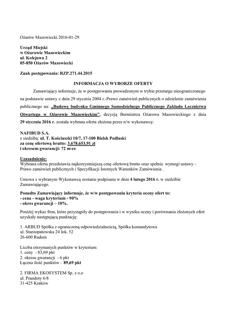 Ożarów Mazowiecki 2016-01-29 Urząd Miejski w Ożarowie Mazowieckim ul. Kolejowa 2 05-850 Ożarów Mazowiecki Znak postępowania: RZP.271.44.2015 INFORMACJA O WYBORZE OFERTY Zamawiający informuje, że w postępowaniu prowadzonym w trybie przetargu nieograniczonego na podstawie ustawy z dnia 29 stycznia 2004 r.-Prawo zamówień publicznych o udzielenie zamówienia publicznego na: „Budowę budynku Gminnego Samodzielnego Publicznego Zakładu Lecznictwa Otwartego w Ożarowie Mazowieckim”, decyzją Burmistrza Ożarowa Mazowieckiego z dnia 29 stycznia 2016 r. została wybrana oferta złożona przez n/w wykonawcę: NAFIBUD S.A. z siedzibą: ul. T. Kościuszki 10/7, 17-100 Bielsk Podlaski za cenę ofertową brutto: 3.678.653,91 zł i okresem gwarancji: 72 m-ce Uzasadnienie: Wybrana oferta przedstawia najkorzystniejszą cenę ofertową brutto oraz spełnia wymogi ustawy – Prawo zamówień publicznych i Specyfikacji Istotnych Warunków Zamówienia . Umowa z wybranym Wykonawcą zostanie podpisana w dniu 4 lutego 2016 r. w siedzibie Zamawiającego. Ponadto Zamawiający informuje, że w/w postępowaniu kryteria oceny ofert to: - cena - waga kryterium - 90% - okres gwarancji – 10%. Poniżej wykaz firm, które przystąpiły do postępowania i w wyniku oceny i porównania złożonych ofert uzyskały następującą punktację: 1. ARBUD Spółka z ograniczoną odpowiedzialnością, Spółka komandytowa ul. Staroopatowska 24 lok. 52 26-600 Radom Liczba otrzymanych punktów w kryterium: 1. ceny - 83,69 pkt 2. okresu gwarancji - 6 pkt Łączna ilość punktów – 89,69 pkt 2. FIRMA EKOSYSTEM Sp. z o.o ul. Prandoty 6/8 31-425 Kraków Liczba otrzymanych punktów w kryterium: 1. ceny - 45,25 pkt 2. okresu gwarancji - 0 pkt Łączna ilość punktów – 45,25 pkt 3. CIEPŁOWNIK® EKOINWESTYCJE Sp. z o.o sp.k. ul. Grunwaldzka 475 62-064 Plewiska Liczba otrzymanych punktów w kryterium: 1. ceny - 68,97 pkt 2. okresu gwarancji - 6 pkt Łączna ilość punktów – 74,97 pkt 4. PROJEKT-BUD Sp. z o.o FIRMA HANDLOWO-USŁUGOWA ul. Siedmiodomki 13 97-200 Tomaszów Mazowiecki Liczba otrzymanych punktów w kryterium: 1. ceny - 71,18 pkt 2. okresu gwarancji - 10 pkt Łączna ilość punktów – 81,18 pkt 5. WTM Development Sp. z o.o ul. Batalionów Chłopskich 77/7 25-671 Kielce Liczba otrzymanych punktów w kryterium: 1. ceny - 74,77 pkt 2. okresu gwarancji - 6 pkt Łączna ilość punktów – 80,77 pkt 6. PRZEDSIĘBIORSTWO ROBÓT INŻYNIERYJNYCH BUDOWNICTWA Sp. z o.o Dębno 190 32-852 Dębno Liczba otrzymanych punktów w kryterium: 1. ceny - 74,93 pkt 2. okresu gwarancji - 10 pkt Łączna ilość punktów – 84,93 pkt 7. EKOKALORIA BUDOWNICTWO PKB Spółka z o.o S.K.A. ul. Warszawska 158 25-414 Kielce Liczba otrzymanych punktów w kryterium: 1. ceny - 67,41 pkt 2. okresu gwarancji - 10 pkt Łączna ilość punktów – 77,41 pkt 8. ZAB-BUD Andrzej Zaboklicki ul. Nowosielecka 14 a lok. 3 00-466 Warszawa Liczba otrzymanych punktów w kryterium: 1. ceny - 74,88 pkt 2. okresu gwarancji - 10 pkt Łączna ilość punktów – 84,88 pkt 9. ZAKŁAD REMONTOWO-BUDOWLANY ”JANSAN” Jerzy JANUSZ ul. Korotyńskiego 48 m. 99 02-123 Warszawa Liczba otrzymanych punktów w kryterium: 1. ceny - 61,23 pkt 2. okresu gwarancji - 6 pkt Łączna ilość punktów – 67,23 pkt 10. WARMIŃSKIE PRZEDSIĘBIORSTWO BUDOWLANE S.A. ul. Dąbrowszczaków 21 10-540 Olsztyn Liczba otrzymanych punktów w kryterium: 1. ceny - 73,60 pkt 2. okresu gwarancji - 10 pkt Łączna ilość punktów – 83,60 pkt 11. MPROJEKT Polska Sp. z o.o ul. Przewodowa 29 04-874 Warszawa Liczba otrzymanych punktów w kryterium: 1. ceny - 75,48 pkt 2. okresu gwarancji - 10 pkt Łączna ilość punktów – 85,48 pkt 12. ART GLOBAL Sp. z o.o ul. Zwoleńska 60d 04-765 Warszawa Liczba otrzymanych punktów w kryterium: 1. ceny - 72,84 pkt 2. okresu gwarancji - 10 pkt Łączna ilość punktów – 82,84 pkt 13. Konsorcjum firm: 1) Lider: ELBUD Elżbieta Hińcza Otwock Wielki, ul. Polna 15 05-480 Karczew 2) Partner: WIMAKS Toczyłowski Dariusz ul. Sadowa 47 05-410 Józefów Liczba otrzymanych punktów w kryterium: 1. ceny - 71,97 pkt 2. okresu gwarancji - 10 pkt Łączna ilość punktów – 81,97 pkt 14. KORPORACJA BUDOWLANA ”DARCO” ul. Garbarska 53 26-600 Radom Liczba otrzymanych punktów w kryterium: 1. ceny - 78,71 pkt 2. okresu gwarancji - 10 pkt Łączna ilość punktów – 88,71 pkt 15. ROSA-BUD Spółka Akcyjna ul. Gazowa 5/7 26-600 Radom Liczba otrzymanych punktów w kryterium: 1. ceny - 68,23 pkt 2. okresu gwarancji - 10 pkt Łączna ilość punktów – 78,23 pkt 16. PAMAR Sp. z o.o ul. Spychowska 6 01-472 Warszawa Liczba otrzymanych punktów w kryterium: 1. ceny - 75,78 pkt 2. okresu gwarancji - 6 pkt Łączna ilość punktów – 81,78 pkt 17. NAFIBUD S.A. ul. T. Kościuszki 10/7 17-100 Bielsk Podlaski Liczba otrzymanych punktów w kryterium: 1. ceny - 90,00 pkt 2. okresu gwarancji - 10 pkt Łączna ilość punktów – 100,00 pkt 18. JP CONTRACTING pl Sp. z o.o ul. Racławicka 146 02-117 Warszawa Liczba otrzymanych punktów w kryterium: 1. ceny - 71,99 pkt 2. okresu gwarancji - 10 pkt Łączna ilość punktów – 81,99 pkt 19. Przedsiębiorstwo Usługowo-Handlowe „ELKO” s.c. Tadeusz Siekierski, Michał Siekierski ul. Staszica 68 96-500 Sochaczew Liczba otrzymanych punktów w kryterium: 1. ceny - 63,98 pkt 2. okresu gwarancji - 6 pkt Łączna ilość punktów – 69,98 pkt 20. Konsorcjum firm: 1) Lider: PRZEDSIĘBIORSTWO BUDOWLANE HOLDER-BUD Radosław Kalisz ul. Nowogrodzka 31 00-511 Warszawa 2) Partner: Przedsiębiorstwo Budowlano-Remontowe „COMPLEX BUD” Piotr Kalisz ul. Marcina z Wrocimowic 12F/28 03-145 Warszawa 21. „WALD-GLOB” Jan Radecki Sp. J. ul. Kościuszki 41 06-100 Pułtusk Liczba otrzymanych punktów w kryterium: 1. ceny - 80,10 pkt 2. okresu gwarancji - 6 pkt Łączna ilość punktów – 86,10 pkt 22. EKO-INVEST Sp. z o.o. ul. Skrajna Nr 4 25-650 Kielce Liczba otrzymanych punktów w kryterium: 1. ceny - 78,66 pkt 2. okresu gw