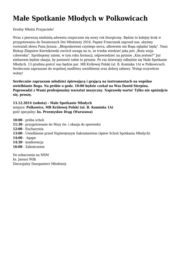 Małe Spotkanie Młodych w Polkowicach Drodzy Młodzi Przyjaciele! Wraz z pierwszą niedzielą adwentu rozpocznie się nowy rok liturgiczny. Będzie to kolejny krok w przygotowaniu do Światowych Dni Młodzieży 2016. Papież Franciszek zaprosił nas, abyśmy rozważali słowa Pana Jezusa: „Błogosławieni czystego serca, albowiem oni Boga oglądać będą”. Nasz Biskup Zbigniew Kiernikowski zwrócił uwagę na to, że trzeba wiedzieć jaka jest „Boża wizja człowieka”. Spróbujemy zatem, w tym roku formacji, odpowiedzieć na pytanie „Kim jestem?” Już niebawem będzie okazja, by postawić sobie to pytanie. Po raz dziewiąty odbędzie się Małe Spotkanie Młodych. 13 grudnia gościć nas będzie par. MB Królowej Polski (ul. B. Kominka 1A) w Polkowicach. Serdecznie zapraszam do wspólnej modlitwy uwielbienia oraz dobrej zabawy. Wstęp oczywiście wolny! Serdecznie zapraszam młodzież śpiewającą i grającą na instrumentach na wspólne uwielbianie Boga. Na próbie o godz. 10:00 będzie czekał na Was Dawid Sierpina. Poprowadzi z Wami profesjonalny warsztat muzyczny. Naprawdę warto! Tylko nie spóźnijcie się, proszę. 13.12.2014 (sobota) - Małe Spotkanie Młodych miejsce: Polkowice, MB Królowej Polski (ul. B. Kominka 1A) gość specjalny: ks. Przemysław Drąg (Warszawa) 10:00 - próba scholi 11:30 - przygotowanie do Mszy św. i okazja do spowiedzi 12:00 - Eucharystia 13:00 - Uwielbienie przed Najświętszym Sakramentem (śpiew Scholi Spotkania Młodych) 14:00 - Agape 14:30 - konferencja 16:00 - Zakończenie Do zobaczenia na MSM ks. Janusz Wilk Diecezjalny Duszpasterz Młodzieży