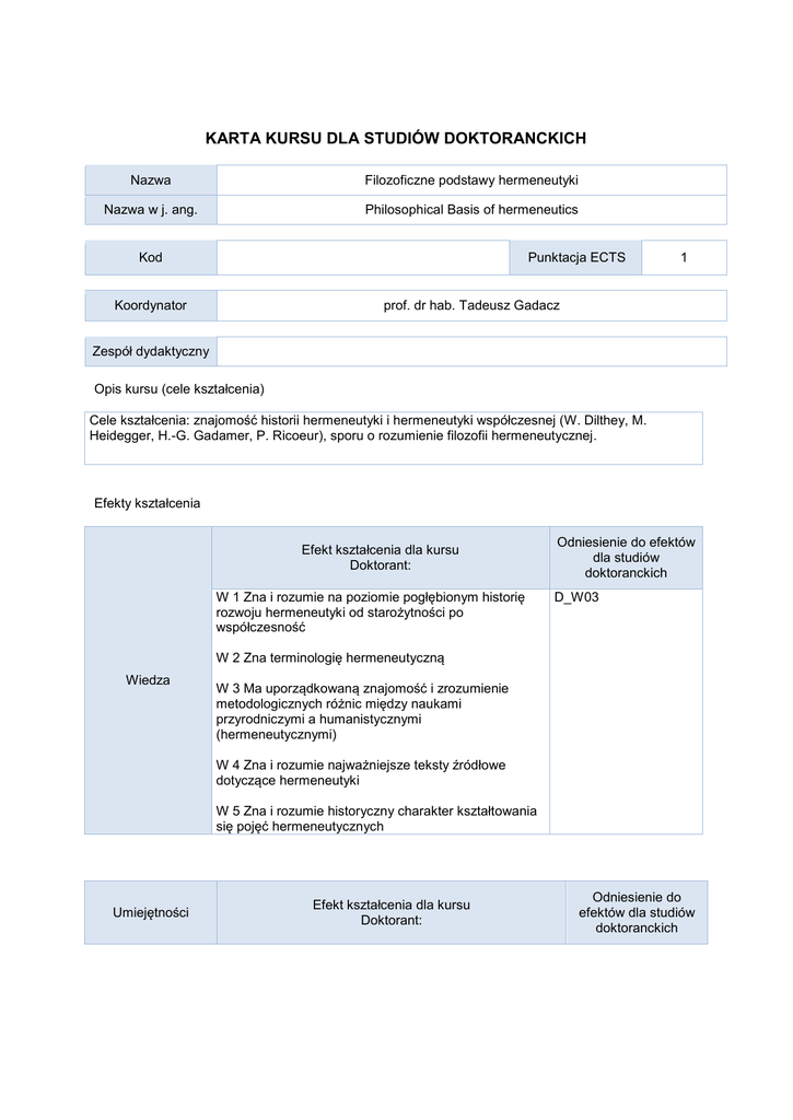 KARTA KURSU DLA STUDIÓW DOKTORANCKICH Nazwa Filozoficzne podstawy hermeneutyki Nazwa w j. ang. Philosophical Basis of hermeneutics Kod Punktacja ECTS Koordynator 1 prof. dr hab. Tadeusz Gadacz Zespół dydaktyczny Opis kursu (cele kształcenia) Cele kształcenia: znajomość historii hermeneutyki i hermeneutyki współczesnej (W. Dilthey, M. Heidegger, H.-G. Gadamer, P. Ricoeur), sporu o rozumienie filozofii hermeneutycznej. Efekty kształcenia Efekt kształcenia dla kursu Doktorant: W 1 Zna i rozumie na poziomie pogłębionym historię rozwoju hermeneutyki od starożytności po współczesność Odniesienie do efektów dla studiów doktoranckich D_W03 W 2 Zna terminologię hermeneutyczną Wiedza W 3 Ma uporządkowaną znajomość i zrozumienie metodologicznych różnic między naukami przyrodniczymi a humanistycznymi (hermeneutycznymi) W 4 Zna i rozumie najważniejsze teksty źródłowe dotyczące hermeneutyki W 5 Zna i rozumie historyczny charakter kształtowania się pojęć hermeneutycznych Umiejętności Efekt kształcenia dla kursu Doktorant: Odniesienie do efektów dla studiów doktoranckich U 1 Interpretuje teksty zgodnie z regułami hermeneutycznymi D_U01 D_U02 U 2 Poprawnie stosuje poznaną terminologię filozoficzną z zakresu hermeneutyki. U 3 Posiada umiejętność artykułowania i uzasadniania własnych poglądów dotyczących kwestii spornych w obszarze hermeneutyki U 4 Samodzielnie myśli i krytycznie ustosunkowuje się do zastanej rzeczywistości doceniając wagę i złożoność przyjmowanych założeń Odniesienie do efektów dla studiów doktoranckich DK_04 Efekt kształcenia dla kursu Doktorant: Kompetencje społeczne K2 W oparciu o perspektywizm kulturowy szanuje odmienność kultur, języków i światopoglądów. Rozumie innych i stosuje dialog rozumienia. K 3 Ma przekonanie o sensie, wartości i potrzebie podejmowania działań pedagogicznych przybliżających i rozpowszechniających dziedzictwo nauk humanistycznych. Organizacja zajęcia w grupach Forma zajęć Wykład (W) A Liczba godzin K L S P Z 12 Opis metod prowadzenia zajęć 1. 2. Wykład z elementami dyskusji Analiza i interpretacja tekstów źródłowych Forma zaliczenia kursu Egzamin Zaliczenie z oceną Zaliczenie X Kryteria oceny Uwagi Ocena na podstawie pracy pisemnej na uzgodniony z prowadzącym zajęcia temat z dziedziny hermeneutyki (10 do 12 stron standardowych) - Treści merytoryczne (wykaz tematów) 1. Hermeneutyka: pojęcie, hermeneutyki szczegółowe a hermeneutyka uniwersalna. Duch, hermeneutyka a retoryka. Historyczne początki: Platon, Arystoteles, szkoła aleksandryjska, szkoła antiocheńska, św. Augustyn, Jan Kasjan. 2. Reformacja: Marcin Luter, Filip Melanchton, Flacius Illyricus, Johann Conrad Dannhauer. Baruch Spinoza, Immanuel Kant, Kant i pietyzm, hermeneutyka romantyczna, Friedriech D.E. Schleiermacher 3. Hermeneutyka filozoficzna a filozofia hermeneutyczna: poszczególne stanowiska 4. Posthermneutyka: Gianni Vattimo, Stanleya Fischa hermeneutyka radykalnej interpretacji, Odo Marquarda hermeneutyka sceptyczna, Johna de Caputo hermeneutyka radykalna 5. Hermeneutyka a: filozofia życia (Jose Ortega y Gasset – Wierzyć czy myśleć, w; tenże, Po co wracamy do filozofii?, Warszawa 1992, s. 213-223; Jose Ortega y Gasset, Prawda jako zgodność człowieka z samym sobą, tenże, Wokół Galileusza, Warszawa 1993), pragmatyzm, neokantyzm, filozofia egzystencji, fenomenologia, filozofia dialogu (Georg Simmel – Dygresja w związku z zagadnieniem, jak możliwe jest społeczeństwo, w: tenże, Pisma socjologiczne, Warszawa 2008, s. 419-437), psychoanaliza, strukturalizm, dekonstrukcja, postmodernizm, szkoła frankfurcka, filozofia analityczna. 6. Hermeneutyka a: dialektyka, logika, epistemologia, filozofia człowieka (L. Landgrebe, Rozumienie w naukach o duchu, w: Wokół rozumienia. Studia i szkice z hermeneutyki, red. G. Sowiński, Kraków 1993), metafizyka, filozofia praktyczna 7) Wilhelm Dilthey: hermeneutyka a filozofia życia. Wilhelm Dilthey - Rozumienie innych osób i ich przejawów życia, w: tenże, Budowa świata historycznego w naukach humanistycznych, Gdańsk 2004 8) Martin Heidegger: zwrot hermeneutyczny. Rudolf Bultmann i demitologizacja. 9) Hansa Georga Gadamera hermeneutyka dialogiczna 10) Paula Ricoeura hermeneutyka narracji 11) Hermeneutyka teologiczna (biblijna). Hermeneutyka prawnicza. Pedagogika hermeneutyczna, hermeneutyka historyczna, hermeneutyka literacka Wykaz literatury podstawowej W. Dilthey - Rozumienie innych osób i ich przejawów życia, w: tenże, Budowa świata historycznego w naukach humanistycznych, Gdańsk 2004 M. Heidegger, Ontologia (hermeneutyka faktyczności), tłum. M. Bonecki, J. Duraj, Toruń 2007 H.-G. Gadamer, Język i rozumienie, Warszawa 2003 P. Ricoeur, Język, tekst, interpretacja, Warszawa 1989 J. Ortega y Gasset, Wierzyć czy myśleć, w: tenże, Po co wracamy do filozofii?, Warszawa 1992 J. Ortega y Gasset, Prawda jako zgodność człowieka z samym sobą, tenże, Wokół Galileusza, Warszawa 1993 L. Landgrebe, Rozumienie w naukach o duchu, w: Wokół rozumienia. Studia i szkice z hermeneutyki, red. G. Sowiński, Kraków 1993 Opracowania: E. Kobylińska, Hermeneutyczna wizja kultury, Warszawa - Poznań 1985 Z. Krasnodębski, Rozumienie ludzkiego zachowania, Warszawa 1986 A. Zeidler, Sztuka, mit, hermeneutyka, Warszawa 1988 J. Stelmach, Co to jest hermeneutyka?, Kraków 1989 Estetyka i hermeneutyka, red. F. Chmielowski, Kraków 1990 Fenomenologia i hermeneutyka, t. 1-3, red. P. Dybel, P. Kaczorowski, J. Rolewski, Warszawa 19901993 K. Rosner, Hermeneutyka jako krytyka kultury: Heidegger, Gadamer, Ricoeur, Warszawa 1991 M. Potępa, Dialektyka i hermeneutyka w filozofii Friedricha Daniela Schleiermachera, Łódź 1992 H. Jonas, Zmiana i trwałość. O podstawach rozumienia przeszłości, tłum P. Domański, Warszawa 1993 Wokół rozumienia. Studia i szkice z hermeneutyki, wybór i tłum. G. Sowinski, Kraków 1993 U. Eco, Lector in fabula. 