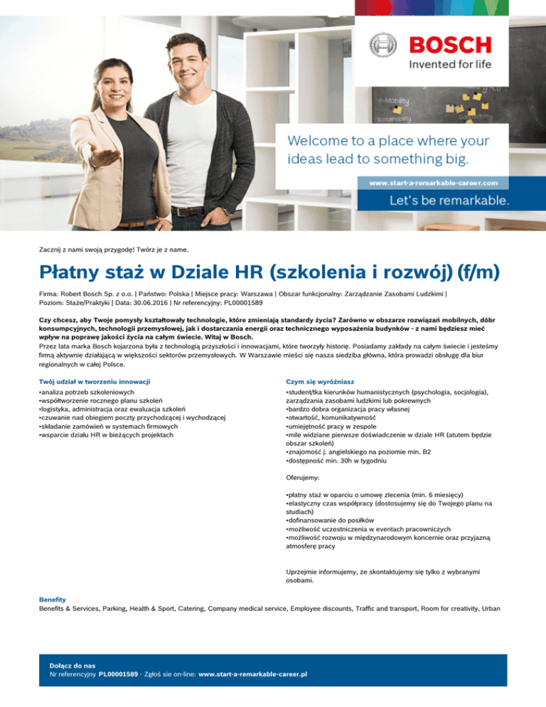 Zacznij z nami swoją przygodę! Twórz je z name. Płatny staż w Dziale HR (szkolenia i rozwój) (f/m) Firma: Robert Bosch Sp. z o.o. | Państwo: Polska | Miejsce pracy: Warszawa | Obszar funkcjonalny: Zarządzanie Zasobami Ludzkimi | Poziom: Staże/Praktyki | Data: 30.06.2016 | Nr referencyjny: PL00001589 Czy chcesz, aby Twoje pomysły kształtowały technologie, które zmieniają standardy życia? Zarówno w obszarze rozwiązań mobilnych, dóbr konsumpcyjnych, technologii przemysłowej, jak i dostarczania energii oraz technicznego wyposażenia budynków - z nami będziesz mieć wpływ na poprawę jakości życia na całym świecie. Witaj w Bosch. Przez lata marka Bosch kojarzona była z technologią przyszłości i innowacjami, które tworzyły historię. Posiadamy zakłady na całym świecie i jesteśmy firmą aktywnie działającą w większości sektorów przemysłowych. W Warszawie mieści się nasza siedziba główna, która prowadzi obsługę dla biur regionalnych w całej Polsce. Twój udział w tworzeniu innowacji Czym się wyróżniasz •analiza potrzeb szkoleniowych •współtworzenie rocznego planu szkoleń •logistyka, administracja oraz ewaluacja szkoleń •czuwanie nad obiegiem poczty przychodzącej i wychodzącej •składanie zamówień w systemach firmowych •wsparcie działu HR w bieżących projektach •student/tka kierunków humanistycznych (psychologia, socjologia), zarządzania zasobami ludzkimi lub pokrewnych •bardzo dobra organizacja pracy własnej •otwartość, komunikatywność •umiejętność pracy w zespole •mile widziane pierwsze doświadczenie w dziale HR (atutem będzie obszar szkoleń) •znajomość j. angielskiego na poziomie min. B2 •dostępność min. 30h w tygodniu Oferujemy: •płatny staż w oparciu o umowę zlecenia (min. 6 miesięcy) •elastyczny czas współpracy (dostosujemy się do Twojego planu na studiach) •dofinansowanie do posiłków •możliwość uczestniczenia w eventach pracowniczych •możliwość rozwoju w międzynarodowym koncernie oraz przyjazną atmosferę pracy Uprzejmie informujemy, że skontaktujemy się tylko z wybranymi osobami. Benefity Benefits & Services, Parking, Health & Sport, Catering, Company medical service, Employee discounts, Traffic and transport, Room for creativity, Urban Dołącz do nas Nr referencyjny PL00001589 - Zgłoś sie on-line: www.start-a-remarkable-career.pl