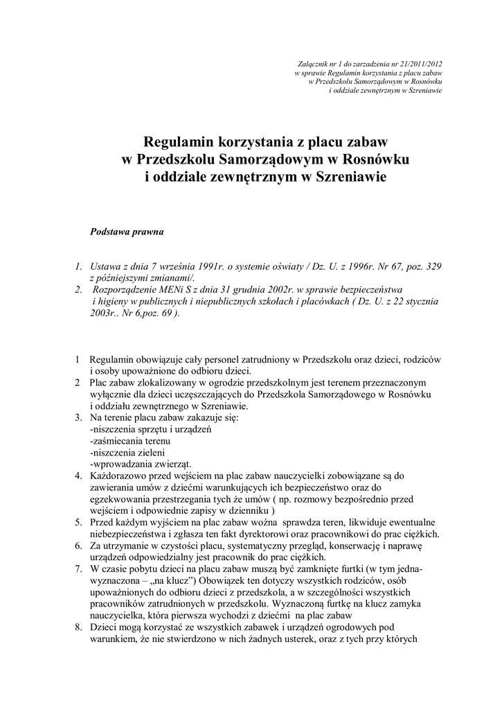 Zalącznik nr 1 do zarzadzenia nr 21/2011/2012 w sprawie Regulamin korzystania z placu zabaw w Przedszkolu Samorządowym w Rosnówku i oddziale zewnętrznym w Szreniawie Regulamin korzystania z placu zabaw w Przedszkolu Samorządowym w Rosnówku i oddziale zewnętrznym w Szreniawie Podstawa prawna 1. Ustawa z dnia 7 września 1991r. o systemie oświaty / Dz. U. z 1996r. Nr 67, poz. 329 z późniejszymi zmianami/. 2. Rozporządzenie MENi S z dnia 31 grudnia 2002r. w sprawie bezpieczeństwa i higieny w publicznych i niepublicznych szkołach i placówkach ( Dz. U. z 22 stycznia 2003r.. Nr 6,poz. 69 ). 1 Regulamin obowiązuje cały personel zatrudniony w Przedszkolu oraz dzieci, rodziców i osoby upoważnione do odbioru dzieci. 2 Plac zabaw zlokalizowany w ogrodzie przedszkolnym jest terenem przeznaczonym wyłącznie dla dzieci uczęszczających do Przedszkola Samorządowego w Rosnówku i oddziału zewnętrznego w Szreniawie. 3. Na terenie placu zabaw zakazuje się: -niszczenia sprzętu i urządzeń -zaśmiecania terenu -niszczenia zieleni -wprowadzania zwierząt. 4. Każdorazowo przed wejściem na plac zabaw nauczycielki zobowiązane są do zawierania umów z dziećmi warunkujących ich bezpieczeństwo oraz do egzekwowania przestrzegania tych że umów ( np. rozmowy bezpośrednio przed wejściem i odpowiednie zapisy w dzienniku ) 5. Przed każdym wyjściem na plac zabaw woźna sprawdza teren, likwiduje ewentualne niebezpieczeństwa i zgłasza ten fakt dyrektorowi oraz pracownikowi do prac ciężkich. 6. Za utrzymanie w czystości placu, systematyczny przegląd, konserwację i naprawę urządzeń odpowiedzialny jest pracownik do prac ciężkich. 7. W czasie pobytu dzieci na placu zabaw muszą być zamknięte furtki (w tym jednawyznaczona – „na klucz”) Obowiązek ten dotyczy wszystkich rodziców, osób upoważnionych do odbioru dzieci z przedszkola, a w szczególności wszystkich pracowników zatrudnionych w przedszkolu. Wyznaczoną furtkę na klucz zamyka nauczycielka, która pierwsza wychodzi z dziećmi na plac zabaw 8. Dzieci mogą korzystać ze wszystkich zabawek i urządzeń ogrodowych pod warunkiem, że nie stwierdzono w nich żadnych usterek, oraz z tych przy których bezpieczeństwa pilnuje osoba dorosła. Dzieci powinny korzystać ze sprzętu i zabawek w ogrodzie przedszkolnym w sposób bezpieczny i zgodnie z zasadami ich użytkowania (prawidłowy siad na huśtawkach, zabawkach sprężynowych, prawidłowe trzymanie uchwytów, nie wchodzenie na górne części urządzeń- nie przeznaczone do zabaw itp.). 9. Nauczyciel dba o stosowny ubiór dziecka, odpowiedni do pory roku i panującej temperatury. (konsultacje z rodzicami) 10. W czasie dużego nasłonecznienia dzieci powinny być zaopatrzone w odpowiednie nakrycie głowy, przebywać w zacienieniu oraz zabezpieczone kremem z filtrem ochronnym UV przeciwko promieniom słonecznym i mieć stały dostęp do napojów ( woda niegazowana, napoje owocowe ). Napoje na plac zabaw dostarczają woźne, po konsultacji z nauczycielką. 11. Podczas pobytu dzieci na placu zabaw nauczycielki organizują dzieciom gry i zabaw, zajęcia sportowe, prace badawcze, prace gospodarcze oraz zabawę swobodną. Nauczycielki i personel przedszkola nie gromadzą się w jednym miejscu lecz współdziałają z dziećmi 12. Na terenie ogrodu mogą przebywać tylko dzieci, nauczyciele, rodzice i osoby upoważnione do odbioru dzieci. 13. Na placu zabaw opiekę nad dzieckiem przejmuje rodzic lub osoba upoważniona z chwilą przywitania się z nim i nauczycielką. 14. Wszyscy przebywający na placu zabaw powinni przestrzegać porządku 15. W czasie pobytu na placu zabaw, dziecko może skorzystać z toalety znajdującej się w budynku przedszkola, udając się do niej tam i z powrotem pod opieką pomocy nauczyciela. Po godzinie 15.00 nauczycielka doprowadza dziecko do drzwi przedszkola, dzwoni i opiekę nad dzieckiem przejmuje woźna. 16. W razie wypadku nauczyciel w pierwszej kolejności udziela pomocy dziecku poszkodowanemu, po czym powiadamia dyrektora przedszkola oraz rodziców. 17. Podczas nieobecności dzieci w Przedszkolu, piaskownica jest zabezpieczona pokrowcem przed zwierzętami. Piasek w piaskownicy wymieniany jest raz do roku. Piaskownice odkrywają woźne po konsultacji z nauczycielkami. 18. Na plac zabaw może być wynoszony sprzęt sportowy i inne przybory do zabaw oraz koce do odpoczynku. Sprzęt, zabawki, koce wynoszą woźne po konsultacji z nauczycielkami. 19. Po każdym pobycie na placu zabaw, nauczycielka wraz z dziećmi porządkuje wszystkie zabawki, sprzęt gromadząc go w wyznaczonym miejsc. Do pomieszczeń gospodarczych sprzęt i zabawki chowają woźne lub pracownik do prac ciężkich. 20. Każdy pobyt w ogrodzie przedszkolnym jest związany z ogromną odpowiedzialnością osób sprawujących nadzór nad bezpieczeństwem dzieci powierzonych ich opiece. Dlatego też, osoby te powinny dołożyć wszelkiej staranności w wykonywaniu swoich obowiązków i zwracać uwagę na inne, nie ujęte w niniejszym regulaminie sytuacje i zdarzenia, mogące mieć wpływ na zapewnienie pełnego bezpieczeństwa dzieci przebywających na terenie przedszkolnego placu zabaw.
