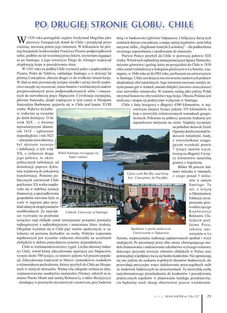 PO DRUGIEJ STRONIE GLOBU. CHILE W M. Hulicka M. Hulicka 1520 roku portugalski żeglarz Ferdynand Magellan jako pierwszy Europejczyk dotarł do Chile i przepłynął przez cieśninę, nazwaną potem jego imieniem. W kilkanaście lat później hiszpański konkwistador Francisco Pizarro podporządkował sobie, podbite sto lat wcześniej przez Inków, terytorium sięgające aż po Santiago, a jego towarzysz Diego de Almagro rozpoczął eksplorację kraju w poszukiwaniu złota. W 1541 roku na podbój Chile wyruszył jeden z popleczników Pizarra, Pedro de Valdivia, zakładając Santiago, a w dziesięć lat później Conception, obecnie drugie co do wielkości miasto kraju. W ślad za nimi powstawały kolejne ośrodki i od tej chwili osadnictwo zaczęło się rozszerzać, mimo buntów i wielokrotnych ataków przeprowadzanych przez podporządkowanych sobie i zmuszanych do niewolniczej pracy Mapuczów. Cywilizacja europejska, głównie francuska, dzięki rządzącym w tym czasie w Hiszpanii francuskim Burbonom, pojawiła się w Chile pod koniec XVIII wieku. Wpływy tej kultury widoczne są wyraźnie po dzień dzisiejszy. O ile wiek XIX – z dwiema najważniejszymi datami: rok 1818 – ogłoszenie niepodległości, i rok 1823 – zniesienie niewolnictwa, był okresem rozwoju i stabilizacji, o tyle wiek XX, a zwłaszcza druga Wokół Santiago rozciągają się bujne winnice jego połowa, to okres politycznych turbulencji; od demokracji poprzez dyktaturę wojskową do pokojowej transformacji. Pomimo politycznych zawirowań Chile pod koniec XX wieku znajdowało się w stabilnej sytuacji finansowej, a uporządkowana gospodarka stawiana była za wzór w regionie jako przykład udanych eksperymentów neoliberalnych. Za najwiękCatholic University of Santiago sze wyzwanie na przełomie tysiącleci rząd chilijski uznał zmniejszanie przepaści pomiędzy najbogatszymi a najbiedniejszymi i umacnianie klasy średniej. Oficjalnie wyróżnia się w Chile pięć warstw społecznych, w zależności od poziomu dochodów na osobę. Polityka wspierania najuboższych jest wyraźnie widoczna chociażby na uczelniach chilijskich w dobrze pomyślanym systemie stypendialnym. Chile to wielonarodowościowy tygiel. Liczba rdzennej ludności Chile, wśród której zdecydowanie najwięcej jest Mapuczów, wynosi około 700 tysięcy, co stanowi jedynie 4,6 procent populacji. Zdecydowana większość to Metysi i potomkowie osadników o różnorodnym pochodzeniu, którzy przybyli do Chile po Hiszpanach w różnych okresachu. Ważną rolę odegrało zwłaszcza dziewiętnastowieczne osadnictwo niemieckie (Niemcy założyli m.in. miasto Puerto Montt nad zatoką Reloncavi), a także Brytyjczycy – działający w przemyśle stoczniowym i azotowym, przy budowie dróg i w bankowości (głównie Valparaiso). Chilijczycy darzą tych ostatnich dużym szacunkiem, a mając opinię legalistów, sami lubią nazywać siebie „Anglikami Ameryki Łacińskiej” – dla podkreślenia swoistego usposobienia i zamiłowania do interesów. Pierwsi Polacy przybyli do Chile w pierwszej połowie XIX wieku. Wśród nich najbardziej znaną postacią jest Ignacy Domeyko, inżynier górnictwa i geolog, który po przyjeździe do Chile w 1838 roku został wykładowcą w kolegium górniczym w La Serenie, a następnie, w 1846 roku aż do1883 roku, profesorem na uniwersytecie w Santiago. Chile zawdzięcza mu stworzenie naukowych podstaw eksploatacji złóż naturalnych. Jego imieniem nazwano miedzy innymi pasmo gór w Andach, amonit chilijski (Amonites domeykanus) oraz niewielkie miasteczko. W uznaniu zasług jako jedyny Polak otrzymał honorowe obywatelstwo tego kraju. Obecna Polonia jest nieliczna i skupia się praktycznie wyłącznie w Santiago. Chile z linią brzegową o długości 4300 kilometrów, w najszerszym miejscu liczące jedynie 355 kilometrów, to kraj o niezwykle zróżnicowanych warunkach geograficznych. Położona na północy pustynia Atakama jest najsuchszym miejscem na ziemi. Najdalej wysunięty na południe skrawek Ziemi Ognistej dotyka nieomal lodowców Antarktyki. Andy, z wierzchołkami osiągającymi wysokość prawie 7 tysięcy metrów n.p.m, tworzą na długości 4 tysięcy kilometrów naturalną granicę z Argentyną. Blisko 90 procent ludności mieszka w miastach, Ujście rzeki Bio Bio, nad którą z czego ponad 5 milioleży Conception, do Pacyfiku nów w samym Santiago. Tu też, z wizytą w Ministerstwie Edukacji, na zaproszenie przewodniczącego Konferencji Rektorów Chilijskich prof. Jaime Pozo, Spotkanie w parku naukowym rektora uniUniwersytetu w Valparaiso wersytetu w La Serenie, rozpoczynamy realizację zaplanowanych spotkań i wizyt studyjnych. Po prezentacji przez obie strony obowiązującego modelu finansowania i nadzorowania szkolnictwa wyższego rozmowy dotyczące przyszłej rewizyty rektorów chilijskich w Polsce oraz potencjalnej współpracy toczą się bardzo konkretnie. Nie ograniczają się one jedynie do szukania wspólnych obszarów badawczych, ale przewidują precyzyjne wręcz dedykowanie poszczególnych osób ze środowisk badawczych na uniwersytetach. Tę niezwykłą cechę natychmiastowego przechodzenia do konkretów i poszukiwania praktycznych aspektów w planowaniu każdego przedsięwzięcia będziemy mieli okazję obserwować jeszcze wielokrotnie. ALMA MATER nr 126–127 29 M. Hulicka Obecnie Chile posiada 61 uczelni, z czego 25 zrzeszonych jest w CRUCH (Council of Rectors of Chilean Universities), resztę stanowią prywatne uniwersytety i szkoły wyższe. Liczba studentów wzrosła z 20 tysięcy w 1954 roku (kiedy to powstał CRUCH) do blisko 500 tysięcy obecnie, z czego w samym tylko okresie największego wzrostu (1990–2000) z 245 tysięcy do 435 tysięcy. Corocznie na uczelnie chilijskie wstępuje około 150 tysięcy nowych studentów. Spośród nich 27 tysięcy najlepszych studentów wyłonionych w drodze rankingu przynosi uczelniom, na które wstępują (również prywatnym), dotację, Indirect F