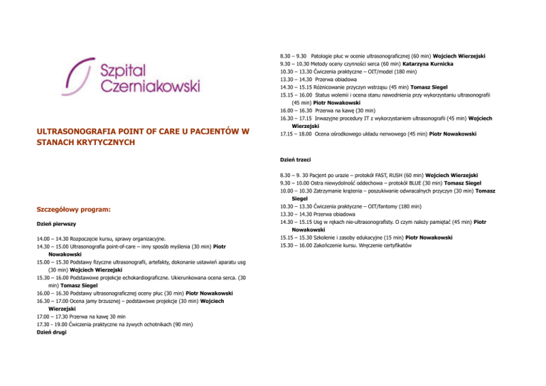 ULTRASONOGRAFIA POINT OF CARE U PACJENTÓW W STANACH KRYTYCZNYCH 8.30 – 9.30 Patologie płuc w ocenie ultrasonograficznej (60 min) Wojciech Wierzejski 9.30 – 10.30 Metody oceny czynności serca (60 min) Katarzyna Kurnicka 10.30 – 13.30 Ćwiczenia praktyczne – OIT/model (180 min) 13.30 – 14.30 Przerwa obiadowa 14.30 – 15.15 Różnicowanie przyczyn wstrząsu (45 min) Tomasz Siegel 15.15 – 16.00 Status wolemii i ocena stanu nawodnienia przy wykorzystaniu ultrasonografii (45 min) Piotr Nowakowski 16.00 – 16.30 Przerwa na kawę (30 min) 16.30 – 17.15 Inwazyjne procedury IT z wykorzystaniem ultrasonografii (45 min) Wojciech Wierzejski 17.15 – 18.00 Ocena ośrodkowego układu nerwowego (45 min) Piotr Nowakowski Dzień trzeci Szczegółowy program: Dzień pierwszy 14.00 – 14.30 Rozpoczęcie kursu, sprawy organizacyjne. 14.30 – 15.00 Ultrasonografia point-of-care – inny sposób myślenia (30 min) Piotr Nowakowski 15.00 – 15.30 Podstawy fizyczne ultrasonografii, artefakty, dokonanie ustawień aparatu usg (30 min) Wojciech Wierzejski 15.30 – 16.00 Podstawowe projekcje echokardiograficzne. Ukierunkowana ocena serca. (30 min) Tomasz Siegel 16.00 – 16.30 Podstawy ultrasonograficznej oceny płuc (30 min) Piotr Nowakowski 16.30 – 17.00 Ocena jamy brzusznej – podstawowe projekcje (30 min) Wojciech Wierzejski 17.00 – 17.30 Przerwa na kawę 30 min 17.30 - 19.00 Ćwiczenia praktyczne na żywych ochotnikach (90 min) Dzień drugi 8.30 – 9. 30 Pacjent po urazie – protokół FAST, RUSH (60 min) Wojciech Wierzejski 9.30 – 10.00 Ostra niewydolność oddechowa – protokół BLUE (30 min) Tomasz Siegel 10.00 – 10.30 Zatrzymanie krążenia – poszukiwanie odwracalnych przyczyn (30 min) Tomasz Siegel 10.30 – 13.30 Ćwiczenia praktyczne – OIT/fantomy (180 min) 13.30 – 14.30 Przerwa obiadowa 14.30 – 15.15 Usg w rękach nie-ultrasonografisty. O czym należy pamiętać (45 min) Piotr Nowakowski 15.15 – 15.30 Szkolenie i zasoby edukacyjne (15 min) Piotr Nowakowski 15.30 – 16.00 Zakończenie kursu. Wręczenie certyfikatów