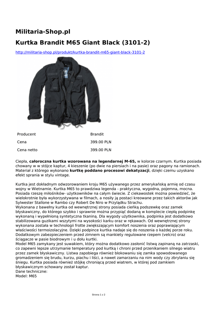 Militaria-Shop.pl Kurtka Brandit M65 Giant Black (3101-2) http://militaria-shop.pl/produkt/kurtka-brandit-m65-giant-black-3101-2 Producent Brandit Cena 399.00 PLN Cena netto 399.00 PLN Ciepła, całoroczna kurtka wzorowana na legendarnej M-65, w kolorze czarnym. Kurtka posiada chowany w w stójce kaptur, 4 kieszenie (po dwie na piersiach i na pasie) oraz pagony na ramionach. Materiał z którego wykonano kurtkę poddano procesowi dekatyzacji, dzięki czemu uzyskano efekt sprania w stylu vintage. Kurtka jest dokładnym odwzorowaniem kroju M65 używanego przez amerykańską armię od czasu wojny w Wietnamie. Kurtka M65 to prawdziwa legenda - praktyczna, wygodna, pojemna, mocna. Posiada rzeszę miłośników- użytkowników na całym świecie. Z ciekawostek można powiedzieć, że wielokrotnie była wykorzystywana w filmach, a nosiły ją postaci kreowane przez takich aktorów jak Sylwester Stallone w Rambo czy Robert De Niro w Przylądku Strachu. Wykonana z bawełny kurtka od wewnętrznej strony posiada cieńką podszewkę oraz zamek błyskawiczny, do którego szybko i sprawnie można przypiąć dodaną w komplecie ciepłą podpinkę wykonaną i wypełnioną syntetyczna tkaniną. Dla wygody użytkownika, podpinka jest dodatkowo stabilizowana guzikami wszytymi na wysokości karku oraz w rękawach. Od wewnętrznej strony wykonana została w technologii frotte zwiększającym komfort noszenia oraz poprawiającym właściwości termoizolacyjne. Dzięki podpince kurtka nadaje się do noszenia o każdej porze roku. Dodatkowym zabezpieczeniem przed zimnem są mankiety regulowane rzepem (velcro) oraz ściągacze w pasie biodrowym i u dołu kurtki. Model M65 zamykany jest suwakiem, który można dodatkowo zasłonić listwą zapinaną na zatrzaski, co zapewni lepsze utrzymanie temperatury pod kurtką i chroni przed przenikaniem silnego wiatru przez zamek błyskawiczny. Listwa zapobiega również blokowaniu się zamka spowodowanego gromadzeniem się brudu, kurzu, piachu i liści, a nawet zamarzaniu na nim wody czy zbrylaniu się śniegu. Kurtka posiada również stójkę chroniącą przed wiatrem, w której pod zamkiem błyskawicznym schowany został kaptur. Dane techniczne: Model: M65 Strona 1 z 2 Kolor: czarny Materiały: - kurtka 100% bawełna - podpinka 100% poliester Producent: Brandit, Niemcy Kurtka jest dokładnym odwzorowaniem kroju M65 używanego przez amerykańską armię od czasu wojny w Wietnamie. Kurtka M65 to prawdziwa legenda - praktyczna, wygodna, pojemna, mocna. Posiada rzeszę miłośników-użytkowników na całym świecie. Z ciekawostek można powiedzieć, że wielokrotnie była wykorzystywana w filmach, a nosiły ją postaci kreowane przez takich aktorów jak Sylwester Stallone w Rambo czy Robert De Niro w Przylądku Strachu. Wykonana z bawełny kurtka od wewnętrznej strony posiada cienką podszewkę oraz zamek błyskawiczny, do którego szybko i sprawnie można przypiąć dodaną w komplecie ciepłą podpinkę wykonaną i wypełnioną syntetyczna tkaniną. Dla wygody użytkownika, podpinka jest dodatkowo stabilizowana guzikami wszytymi na wysokości karku oraz w rękawach. Od wewnętrznej strony wykonana została w technologii frotte zwiększającym komfort noszenia oraz poprawiającym właściwości termoizolacyjne. Dzięki podpince kurtka nadaje się do noszenia o każdej porze roku. Dodatkowym zabezpieczeniem przed zimnem są mankiety regulowane rzepem (velcro) oraz ściągacze w pasie biodrowym i u dołu kurtki. Model M65 zamykany jest suwakiem, który można dodatkowo zasłonić listwą zapinaną na zatrzaski, co zapewni lepsze utrzymanie temperatury pod kurtką i chroni przed przenikaniem silnego wiatru przez zamek błyskawiczny. Listwa zapobiega również blokowaniu się zamka spowodowanego gromadzeniem się brudu, kurzu, piachu i liści, a nawet zamarzaniu na nim wody czy zbrylaniu się śniegu. Kurtka posiada również stójkę chroniącą przed wiatrem, w której pod zamkiem błyskawicznym schowany został kaptur. Dane techniczne Model: M65 Kolor: czarny Materiały: - kurtka 100% bawełna - podpinka 100% poliester Producent: Brandit, Niemcy Rozmiar Długość całkowita (cm) Długość rękawa od pachy (cm) S Obwód na wysokości klatki piersiowej (cm) 114 75 51 M 123 78 52 L 134 78 55 XL 142 79 56 XXL 148 80 57 Strona 2 z 2