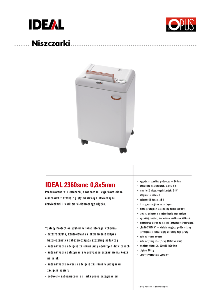 Niszczarki IDEAL 2360smc 0,8x5mm Produkowana w Niemczech, nowoczesna, wyjàtkowo cicha • wygodna szczelina podawcza – 240mm • szerokoÊç szatkowania: 0,8x5 mm • max iloÊç niszczonych kartek: 3-5* • stopieƒ tajnoÊci: 6 niszczarka z szafkà z płyty meblowej z otwieranymi • pojemnoÊç kosza: 35 l drzwiczkami i workiem wielokrotnego u˝ytku. • 1 lat gwarancji na no˝e tnàce • cicho pracujàcy, ale mocny silnik (390W) • tr wały, odporny na zabrudzenia mechanizm • wysokiej jakoÊci, drewniana szafka na kółkach • plastikowy worek na Êcinki (przyjazny Êrodowisku) * Safety Protection System w skład którego wchodzà: - przezroczysta, kontrolowana elektronicznie klapka bezpieczeƒstwa zabezpieczajàca szczelin´ podawczà - automatyczne odci´cie zasilania przy otwartych drzwiczkach - automatyczne zatrzymanie w przypadku przepełnienia kosza • „EASY-SWITCH” – wielofunkcyjny, podÊwietlany przełàcznik, wskazujàcy aktualny tr yb pracy • automatyczny rewers • automatyczny start/stop (fotokomórka) • wymiar y (WxSxG): 630x395x295mm • ci´˝ar: 20 kg • Safety Protection System** na Êcinki - automatyczny rewers i odci´cie zasilania w przypadku zaci´cia papieru - podwójne zabezpieczenie silnika przed przegrzaniem * próby wykonano na papierze 70g/m2