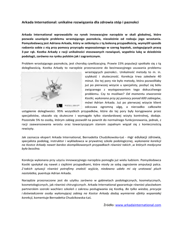 Arkada International: unikalne rozwiązania dla zdrowia stóp i paznokci Arkada International wprowadziło na rynek innowacyjne narzędzie w skali globalnej, które pozwala usunięcie problemu wrastającego paznokcia, niezależnie od rodzaju jego wrastania. Pomysłodawcą jest Adriana Arkada, który w zetknięciu z tą bolesną przypadłością, wymyślił sposób radzenia sobie z nią przy pomocy przyrządu wyposażonego w szereg łopatek, zastępujących pracę 3 par rąk. Kostka Arkady z racji unikalności stosowanych rozwiązań, wypełnia lukę w dziedzinie podologii, zarówno na rynku polskim jak i zagranicznym. Problem wrastającego paznokcia, jest chorobą cywilizacyjną. Prawie 15% populacji spotkało się z tą dolegliwością. Kostka Arkady to narzędzie przeznaczone do bezinwazyjnego usuwania problemu wrastających paznokci.. Unikalność metody to m. in. szybkość i skuteczność. Korekcja trwa zaledwie 40 minut. Do tej pory nie było metody, która pozwoliłaby już po pierwszej wizycie u specjalisty, pozbyć się bólu związanego z występowaniem tego dokuczliwego problemu. Czy to możliwe? Od momentu stworzenia Kostki, wykonano przy jej pomocy ponad 600 zabiegów, mówi Adrian Arkada. Już po pierwszej wizycie klient odczuwa ogromną ulgę, a nierzadko całkowite ustąpienie dolegliwości. 95% wszystkich przypadków, które do tej pory były korygowane przez specjalistów, okazało się skuteczne i wymagało tylko standardowej wizyty kontrolnej, dodaje. Pozostałe 5% to osoby, którym zabieg pozwolił na powrót do normalnego funkcjonowania, jednak, z racji zaawansowania wrostu oraz towarzyszącym stanom zapalnym wiązał się z koniecznością rewizyty. Jak zaznacza ekspert Arkada International, Bernadetta Chudzikowska-Łaś - mgr edukacji zdrowia, specjalista podolog, instruktor i wykładowca w prywatnej szkole podologicznej, wykonanie korekcji na Kostce Arkady nawet bardzo skomplikowanych przypadkach również takich ,w których medycyna była bezsilna. Korekcja wykonana przy użyciu innowacyjnego narzędzia pomogła już wielu ludziom. Pomysłodawca Kostki spotykał się nawet z ciężkimi przypadkami, które niosły ze sobą zagrożenie amputacji palca. Z takich sytuacji również potrafimy znaleźć wyjście, niedawno udało mi się uratować pluch nastolatka, puentuje Adrian Arkada. Narzędzie przeznaczone jest do użytku zarówno w gabinetach podologicznych, kosmetycznych, kosmetologicznych, jak również chirurgicznych. Arkada International gwarantuje również placówkom partnerskim szeroki wachlarz szkoleń z zakresu posługiwania się Kostką. Bo tylko wiedza, precyzja i doświadczenie osoby wykonującej zabieg na Kostce Arkady dadzą wymiernie efekty wspaniałej korekcji, komentuje Bernadetta Chudzikowska-Łaś. Źródło: www.arkadainternational.com