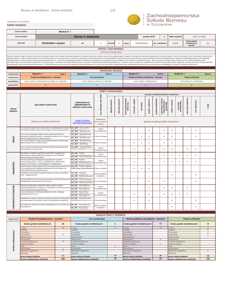 Biznes w działaniu - karta modułu 1/2 obowiązuje od: 2015/2016 karta modułu Moduł E/ 1 numer modułu Biznes w działaniu nazwa modułu EKONOMIA I stopień kierunek punkty ECTS I rok 1 semestr obligatoryjny status 18 lider modułu prof. A. Zelek liczba godzin kontaktowych łącznie polski jęz. wykładowy 56 ISTOTA I CELE MODUŁU Krótki opis i katalog celów Głównym zadaniem zajęć w ramach modułu jest symulacja zbliżonych do realnych warunków zakładania i prowadzenia biznesu. Studenci uczestniczą w aktywizujących zajęciach o charakterze warsztatów praktycznych, w ramach których "tworzą" symulowane firmy, dla których muszą stworzyć: pomysł produktu / usługi, model biznesowy, elementy biznes planu wraz z analizą rynku i konkurencji i elementami analizy opłacalności oraz przeprowadzić symulowany proces rejestracji firmy, wraz z określeniem schematu opodatkowania, wyborem niezbędnego systemu informacyjnego i zaprojektowaniem struktury organizacyjnej tworzonego podmiotu, itp. Elementem wzbogacającym zajęcia zespołowe w symulowanych warunkach jest gra strategiczna oraz spotkania z praktykami biznesu. Niemniej ważnym komponentem modułu jest jurs z zakresu podstaw prawa gospoadarczego, skoncentrowany na aspektach form organizacyjno - prawnych podmiotów gospodarczych oraz opcjach opodatkowania działalności gospodarczej. Naczelnym celem modułu jest uświadomienie studentom kluczowych kwestii związanych z realiami tworzenia nowego podmiotu gospodarczego i wdrażania pomysłów biznesowych. Tak skonstruowany moduł pozwala na wywołanie efektu doświadczenia w rozumieniu cyklu Kolba. Następstwem tego modułu będzie konsekwentny proces poznawczy przebiegający w kolejnych modułach tematycznych. STRUKTURA MODUŁU Moduł E/ 1 numer kursu kurs 1 kurs 2 Moduł E/ 1 Moduł E/ 1 kurs 3 Moduł E/ 1 kurs 4 nazwa kursu Projekt Przedsiębiorstwo - warsztat Gra symulacyjna Realne problemy zarządzania - warsztat Prawo w biznesie prowadzący prof. A. Zelek; dr J. Wiśniewski; dr K. Mądry; dr J. Poteralski prof. A. Zelek; dr J. Osuch; dr J. Poteralski prof. A. Zelek + visiting lecturers dr R. Cichórz; dr L. Grzenkowicz punkty ECTS 8 2 2 6 WIEDZA UMIEJĘTNOŚCI KOMPETENCJE SPOŁECZNE KE1_U01 Potrafi Projekt wykorzystywać podstawową KE1_U05 Potrafi analizować Przedsiębiorstwo działania i procesy zachodzące KE1_U08 Posiada Projekt umiejętność formułowania KE1_U03 Potrafi zebrać dane Przedsiębiorstwo oraz dokonać oceny zjawisk Potrafi dokonać wyboru optymalnej formy organizacyjno-prawnej oraz KE1_U12 Potrafi znajdować form opodatkowania młodego przedsięwzięcia biznesowego oraz źródła prawa i interpretować je, Prawo w biznesie przeprowadzić proces rejestracji firmy. Jest otwarty na proces poznawania i doświadczania oraz uczenia się na KE1_K01 Ma świadomość doświadczeniu. poziomu swojej wiedzy, KE1_K05 Reprezentuje postawę przedsiębiorczą i inne aktywności x uwagi case study zespołowo case study indywidualnie udział w dyskusji prezentacja zadania indywidualnego / grupowego projekt indywidualne projekt zespołowe x x x x x x x x x x x x x x x x x x x x x x x x Identyfikuje i analizuje wszystkie czynniki endo- i egzogeniczne determinujące wybór modelu biznesowego i na ich tle potrafi dokonywać optymalnego wyboru. Potrafi projektować przedsięwzięcia gospodarcze w postaci elementarnego biznes – planu, z uwzględnieniem determinant prawnych, finansowych, marketingowych i strategicznych. KE1_U09 Analizuje i przewiduje zachowania KE1_U06 Potrafi zastosować wiedzę teoretyczną w Potrafi podejmować proste decyzje biznesowe pod presją konkurencji, KE1_U05 Potrafi analizować uwzględniając uwarunkowania ekonomiczne. działania i procesy zachodzące KE1_U10 Potrafi pracować w zespole rozwiązującym Wykazuje kreatywność i otwartość wobec nowych inicjatyw, KE1_K01 Ma świadomość zachowując jednocześnie krytycyzm i racjonalizm w ocenie wariantów poziomu swojej wiedzy, KE1_K03 Myśli logicznie i nowych przedsięwzięć gospodarczych. analitycznie, jest zdolny do Jest zorientowany na realizację zakładanych celów i wykazuje KE1_K05 Reprezentuje odpowiedzialność za nie. postawę przedsiębiorczą i KE1_K03 Myśli logicznie i analitycznie, jest zdolny do Współdziała w zespole i wykazuje zdolności do pełnienia funkcji lidera KE1_K04 Potrafi pracować i merytorycznego w określonym obszarze funkcjonalnym zarządzania. współdziałać w grupie, x Sposób weryfikacji efektu kształcenia Zna i rozumie zasady konstruowania planu przedsięwzięć biznesowych KE1_W07 Zna i rozumie Projekt w kontekście wyboru modelu biznesowego, struktury organizacyjnej . podstawy tworzenia, Przedsiębiorstwo KE1_W12 Rozumie istotę przedsiębiorczości oraz zna Zna i rozumie przebieg i etapy procesu rejestrowania firmy w KE1_W09 Ma podstawową Prawo w biznesie kontekście aspektów formalno – prawnych tworzenia firm w różnych wiedzę o metodach i KE1_W12 Rozumie istotę formach organizacyjnych i własnościowych. przedsiębiorczości oraz zna Zna i rozumie główne aspekty prawa gospodarczego i podatkowego, KE1_W09 Ma podstawową Prawo w biznesie determinujące formę i model biznesu. wiedzę o metodach i KE1_W04 Identyfikuje podstawowe normy społeczne, Zna i rozumie elementarne mechanizmy analizy finansowej, analizy KE1_W09 Ma podstawową Projekt marketingowej i analizy ryzyka. wiedzę o metodach i Przedsiębiorstwo Uświadamia sobie realia prowadzenia biznesu w danych warunkach endo- i egzogenicznych. test wiedzy Adekwatny kurs w ramach modułu ćwiczenia, zadania ZOBACZ LEGENDĘ EFEKTÓW KSZTAŁCENIA praca pisemna (esej, referat, itp.) Zwarty opis efektu kształcenia obszar efektów zaliczenie pisemne odniesienie do KIERUNKOWYCH efektów kształcenia sposoby weryfikacji efektów kształcenia egzamin pisemny opis efektu kształcenia kurs realizujący dany efekt EFEKTY KSZTAŁCENIA x x x x x x x x x x x x Realne problemy zarządzania x x Gra 