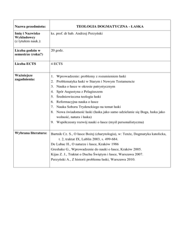 TEOLOGIA DOGMATYCZNA - ŁASKA Nazwa przedmiotu: Imię i Nazwisko Wykładowcy (z tytułem nauk.)Ś ks. prof. dr hab. Andrzej Perzyński Liczba godzin w semestrze (roku?) 20 godz. Liczba ECTS 4 ECTS Ważniejsze zagadnienia: 1. Wprowadzenie: problemy z rozumieniem łaski 2. Problematyka łaski w Starym i Nowym Testamencie 3. Nauka o łasce w okresie patrystycznym 4. 5. 6. 7. 8. Spór Augustyna z Pelagiuszem redniowieczna teologia łaski Reformacyjna nauka o łasce Nauka Soboru Trydenckiego na temat łaski Nowa wiadomo ć łaski (łaska jako samo udzielanie się Boga, łaska jako wolno ć, natura i łaska) 9. Współczesny rozwój nauki o łasce (my l personalistyczna) Wybrana literatura: Bartnik Cz. S., O łasce Bożej (charytologia), wŚ Tenże, Dogmatyka katolicka, t. 2, traktat IX, Lublin 2003, s. 499-684. De Lubac H., O naturze i łasce, Kraków 1986 Greshake G., Wprowadzenie do nauki o łasce, Kraków 2005. Kijas Z. J., Traktat o Duchu więtym i łasce, Warszawa 2007. Perzyński A., Z historii problemu łaski, Warszawa 2010.