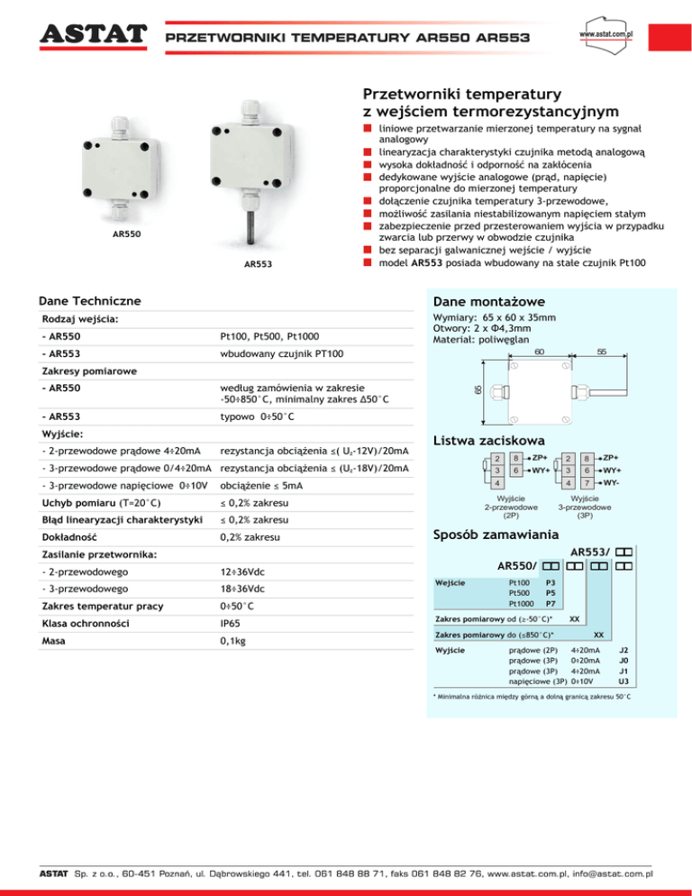 pRZETWORNIKI TEMPERATURY AR550 AR553 PRZETWORNIKI TEMPERATURY AR550 AR553 Przetworniki temperatury z wejściem termorezystancyjnym AR550 AR553 liniowe przetwarzanie mierzonej temperatury na sygnał analogowy linearyzacja charakterystyki czujnika metodą analogową wysoka dokładność i odporność na zakłócenia dedykowane wyjście analogowe (prąd, napięcie) proporcjonalne do mierzonej temperatury dołączenie czujnika temperatury 3-przewodowe, możliwość zasilania niestabilizowanym napięciem stałym zabezpieczenie przed przesterowaniem wyjścia w przypadku zwarcia lub przerwy w obwodzie czujnika bez separacji galwanicznej wejście / wyjście model AR553 posiada wbudowany na stałe czujnik Pt100 Dane Techniczne Dane montażowe Rodzaj wejścia: - AR550 Pt100, Pt500, Pt1000 - AR553 wbudowany czujnik PT100 Wymiary: 65 x 60 x 35mm Otwory: 2 x Φ4,3mm Materiał: poliwęglan 60 55 - AR550 według zamówienia w zakresie -50÷850°C, minimalny zakres ∆50°C - AR553 typowo 0÷50°C Wyjście: - 2-przewodowe prądowe 4÷20mA rezystancja obciążenia ≤( Uz-12V)/20mA 65 Zakresy pomiarowe Listwa zaciskowa 2 8 ZP+ 2 8 ZP+ - 3-przewodowe prądowe 0/4÷20mA rezystancja obciążenia ≤ (Uz-18V)/20mA 3 6 WY+ 3 6 WY+ - 3-przewodowe napięciowe 0÷10V 4 4 7 WY- obciążenie ≤ 5mA Uchyb pomiaru (T=20°C) ≤ 0,2% zakresu Błąd linearyzacji charakterystyki ≤ 0,2% zakresu Dokładność 0,2% zakresu Wyjście 2-przewodowe (2P) Wyjście 3-przewodowe (3P) Sposób zamawiania AR553/ Zasilanie przetwornika: - 2-przewodowego 12÷36Vdc - 3-przewodowego 18÷36Vdc Zakres temperatur pracy 0÷50°C Klasa ochronności IP65 Masa 0,1kg AR550/ Wejście Pt100 Pt500 Pt1000 �� �� �� �� P3 P5 P7 Zakres pomiarowy od (≥-50°C)* Zakres pomiarowy do (≤850°C)* Wyjście �� prądowe (2P) prądowe (3P) prądowe (3P) napięciowe (3P) XX XX 4÷20mA 0÷20mA 4÷20mA 0÷10V J2 J0 J1 U3 * Minimalna różnica między górną a dolną granicą zakresu 50°C 02-699 Warszawa ul. Kłobucka 8 paw. 119 tel.: 022 853-48-56, fax: 022 607-99-50, [email protected] www.apar.pl ASTAT Sp. z o.o., 60-451 Poznań, ul. Dąbrowskiego 441, tel. 061 848 88 71, faks 061 848 82 76, www.astat.com.pl, [email protected]