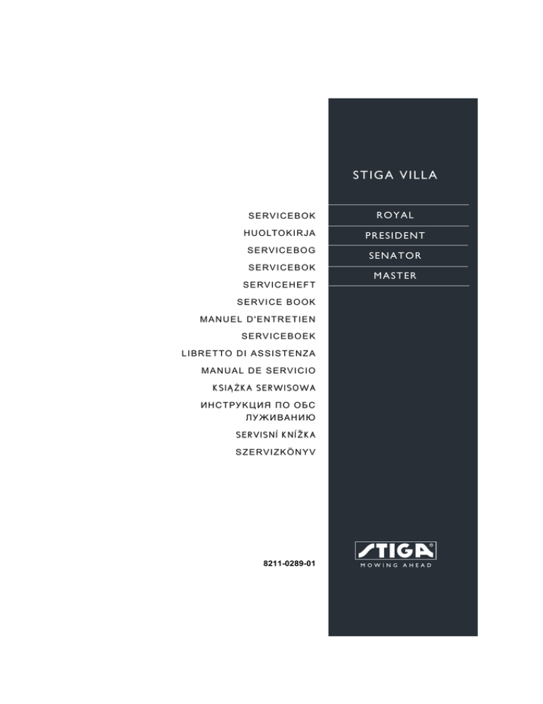 S T I G A V I LL A S E RV I C E B O K R O Y AL H U O LTO K I R JA P R E SI D E N T S E RV I C E B O G S E RV I C E B O K S E RV I C E H E F T S E RV I C E B O O K M A N U E L D ' E N TR E T I E N S E RV I C E B O E K L I B R E T TO D I A S S I S T E N Z A M A N U A L D E S E RV I C I O K SI ¡ ¯ K A S ER W I SO W A »Õ — “ – ” ÷ » fl œ Œ Œ ¡ — À”∆»¬¿Õ»fi S ER V IS N Í K N Í ® K A S Z E RV I Z K Ö N Y V 8211-0289-01 SE N A T O R M AS T ER STIGA VILLA STIGA VILLA SVENSKA ..............................................3 SUOMI ...................................................6 ROYAL DANSK...................................................9 PRESIDENT NORSK ..................................................12 SENATOR DEUTSCH..............................................15 COMFORT ENGLISH ...............................................18 MASTER FRANÇAIS.............................................21 NEDERLANDS ......................................24 ITALIANO...............................................27 ESPAÑOL ..............................................30 POLSKI ..................................................33 –”—— »… ..............................................36 ÈESKY.....................................................39 MAGYAR................................................42 2 X Y Ägare/Eigentümer/Owner/Propriétaire Ägare/Eigentümer/Owner/Propriétaire Namn/Name/Name/Nom Namn/Name/Name/Nom Adress/Adresse/Address/Adresse Adress/Adresse/Address/Adresse Serienr/Seriennr./Serial no./N° de série Serienr/Seriennr./Serial no./N° de série SE SVENSKA GARANTI STIGA VILLA SERVICEINTERVALL 10 år från inköpsdatum. Stigas förlängda garanti gäller endast om komplett Grundservice utförs av en Auktoriserad Stiga-Serviceverkstad inom de serviceintervall som specificeras nedan. FÖRUTSÄTTNING Grundservice Gäller för fel som uppstår på maskinens ram. Komplett Grundservice skall utföras minst var 12:e månad. Om det årliga antalet drifttimmar överstiger 100 timmar ska Grundservice istället utföras minst var 100:e timme. Komponentgaranti, ram GARANTITID Garantin gäller under förutsättning att föreskriven Grundservice har utförts hos en auktoriserad Stiga-Serviceverkstad de första 3 åren. Detta skall verifieras i Serviceboken. Förlängd garanti GARANTITID Garantitiden förlängs med upp till 3 år från inköpsdatum. Mellanservice Efter 50 drifttimmar skall Mellanservice utföras. Om det bara är någon månad kvar till 12-månadsintervallet när 50 drifttimmar nås, rekommenderas istället Grundservice. STÄMPELFÄLT FÖRUTSÄTTNING Garantin gäller under förutsättning att föreskriven Grundservice har utförts hos en auktoriserad Stiga-Serviceverkstad de första 3 åren. Detta skall verifieras i Serviceboken. Detta stämpelfält är endast ämnat som en beskrivning i översatt form och bör inte användas. Utnyttja istället stämpelfältssidorna i slutet av boken. Undantag Mellanservice MOTORER Ordinarie reklamationsregler gäller för motorer. TRANSMISSIONER Ordinarie reklamationsregler gäller för transmissioner. Datum Antal timmar Namnteckning ÖVRIGA KOMPONENTER Kil- och kuggremmar, knivar, batteri styrwirar och reglagewirar omfattas ej av den förlängda garantin. GARANTIN GÄLLER EJ FÖR Grundservice Stämpel • Skador som uppkommit genom olycka, oaktsamhet, normalt slitage och vid transport. • Maskiner där reparationer utförts med annat än Stiga Original-reservdelar. Antal timmar 3 SE SVENSKA GRUNDSERVICE 1. Batteri 2. Elsystem 3. Transmission 4. Remtransmissioner 5. Motorolja, byte 6. Oljefilter, byte 7. Luftfilter, byte 8. Avgassystem, Katalysator 9. Tändstift, byte 10. Varvtal 11. Reglage, pedaler 12. Kraftuttag 13. Klippaggregat parallellitet 14. Klippaggregat knivar 15. Klippaggregat lagerboxar 16. Provkörning 4 SVENSKA SE MELLANSERVICE 1. Smörjpunkter 2. Däck, lufttryck 3. Kylflänsar, rengöring 5. Luftfilter, rengöring 6. Styrning, justering 7. Säkerhetskontroll 4. Motorolja, byte 5 FI SUOMI TAKUU STIGA VILLA Komponenttitakuu, runko TAKUUAIKA 10 vuotta ostopäivästä. EDELLYTYS Koskee koneen rungon vikoja. Takuu on voimassa sillä edellytyksellä, että säännönmukainen Perushuolto on tehty valtuutetussa Stiga-huoltoliikkeessä 3 ensimmäisenä vuotena. Huoltojen on oltava merkittyinä Huoltokirjaan. Pidennetty takuu TAKUUAIKA Takuuaikaa voidaan pidentää korkeintaan 3 vuotta ostopäivästä. HUOLTOVÄLIT Stigan pidennetty takuu on voimassa vain, jos koneelle on tehty täydellinen Perushuolto valtuutetussa Stiga-huoltoliikkeessä alla määriteltyjen huoltovälien puitteissa. Perushuolto Täydellinen Perushuolto on tehtävä vähintään 12 kuukauden välein. Jos vuosittainen käyttötuntimäärä ylittää 100 tuntia, on Perushuolto tehtävä vähintään 100 käyttötunnin välein. Välihuolto Välihuolto on tehtävä 50 käyttötunnin välein. Jos 50 käyttötunnin täyttyessä 12 kuukauden käyttöajan täyttymiseen on vain muutama kuukausi, suositellaan välihuollon sijasta Perushuoltoa. EDELLYTYS Takuu on voimassa sillä edellytyksellä, että säännönmukainen Perushuolto on tehty valtuutetussa Stiga-huoltoliikkeessä 3 ensimmäisenä vuotena. Huoltojen on oltava merkittyinä Huoltokirjaan. Poikkeukset LEIMAKENTTÄ Tämä leimakenttä on tarkoitettu vain kuvaukseksi eikä sitä tule käyttää. Käytä sen sijaan kirjan lopussa olevia leimakenttäsivuja. MOOTTORIT Moottoreille ovat voimassa tavanomaiset reklamaatiosäännöt. VOIMANSIIRROT Voimansiirroille ovat voimassa tavanomaiset reklamaatiosäännöt. Välihuolto Pvm Tuntimäärä Allekirjoitus MUUT KOMPONENTIT Kiila- ja hammashihnat, terät, akku, ohjausvaijerit ja säätövaijerit eivät kuulu pidennetyn takuun piiriin. TAKUU EI KOSKE Perushuolto Leima • Vaurioita, jotka johtuvat onnettomuudesta, huolimattomuudesta, normaalista kulumisesta tai kuljetuksesta. • Koneita, joita on korjattu muilla kuin Stiga Original -