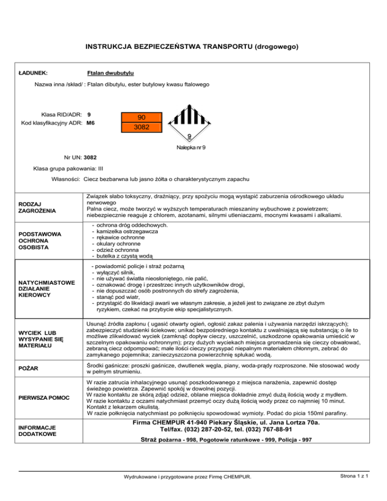 INSTRUKCJA BEZPIECZEŃSTWA TRANSPORTU (drogowego) ŁADUNEK: Ftalan dwubutylu Nazwa inna /skład/ : Ftalan dibutylu, ester butylowy kwasu ftalowego Klasa RID/ADR: 9 90 Kod klasyfikacyjny ADR: M6 3082 Nalepka nr 9 Nr UN: 3082 Klasa grupa pakowania: III Własności: Ciecz bezbarwna lub jasno żółta o charakterystycznym zapachu RODZAJ ZAGROŻENIA Związek słabo toksyczny, drażniący, przy spożyciu mogą wystąpić zaburzenia ośrodkowego układu nerwowego Palna ciecz, może tworzyć w wyższych temperaturach mieszaniny wybuchowe z powietrzem; niebezpiecznie reaguje z chlorem, azotanami, silnymi utleniaczami, mocnymi kwasami i alkaliami. PODSTAWOWA OCHRONA OSOBISTA - ochrona dróg oddechowych. kamizelka ostrzegawcza rękawice ochronne okulary ochronne odzież ochronna butelka z czystą wodą NATYCHMIASTOWE DZIAŁANIE KIEROWCY - powiadomić policje i straż pożarną - wyłączyć silnik, - nie używać światła nieosłoniętego, nie palić, - oznakować drogę i przestrzec innych użytkowników drogi, - nie dopuszczać osób postronnych do strefy zagrożenia, - stanąć pod wiatr, - przystąpić do likwidacji awarii we własnym zakresie, a jeżeli jest to związane ze zbyt dużym ryzykiem, czekać na przybycie ekip specjalistycznych. WYCIEK LUB WYSYPANIE SIĘ MATERIAŁU Usunąć źródła zapłonu ( ugasić otwarty ogień, ogłosić zakaz palenia i używania narzędzi iskrzących); zabezpieczyć studzienki ściekowe; unikać bezpośredniego kontaktu z uwalniającą się substancją; o ile to możliwe zlikwidować wyciek (zamknąć dopływ cieczy, uszczelnić, uszkodzone opakowania umieścić w szczelnym opakowaniu ochronnym); przy dużych wyciekach miejsca gromadzenia się cieczy obwałować, zebraną ciecz odpompować; małe ilości cieczy przysypać niepalnym materiałem chłonnym, zebrać do zamykanego pojemnika; zanieczyszczona powierzchnię spłukać wodą. POŻAR Środki gaśnicze: proszki gaśnicze, dwutlenek węgla, piany, woda-prądy rozproszone. Nie stosować wody w pełnym strumieniu. PIERWSZA POMOC W razie zatrucia inhalacyjnego usunąć poszkodowanego z miejsca narażenia, zapewnić dostęp świeżego powietrza. Zapewnić spokój w dowolnej pozycji. W razie kontaktu ze skórą zdjąć odzież, oblane miejsca dokładnie zmyć dużą ilością wody z mydłem. W razie kontaktu z oczami natychmiast przemyć oczy dużą ilością wody przez co najmniej 10 minut. Kontakt z lekarzem okulistą. W razie połknięcia natychmiast po połknięciu spowodować wymioty. Podać do picia 150ml parafiny. INFORMACJE DODATKOWE Firma CHEMPUR 41-940 Piekary Śląskie, ul. Jana Lortza 70a. Tel/fax. (032) 287-20-52, tel. (032) 767-88-91 Straż pożarna - 998, Pogotowie ratunkowe - 999, Policja - 997 Wydrukowane i przygotowane przez Firmę CHEMPUR. Strona 1 z 1