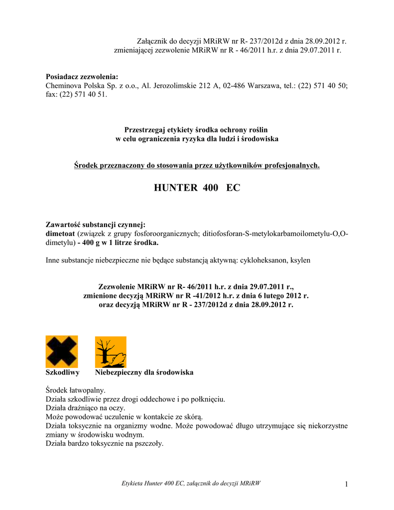 Załącznik do decyzji MRiRW nr R- 237/2012d z dnia 28.09.2012 r. zmieniającej zezwolenie MRiRW nr R - 46/2011 h.r. z dnia 29.07.2011 r. Posiadacz zezwolenia: Cheminova Polska Sp. z o.o., Al. Jerozolimskie 212 A, 02-486 Warszawa, tel.: (22) 571 40 50; fax: (22) 571 40 51. Przestrzegaj etykiety środka ochrony roślin w celu ograniczenia ryzyka dla ludzi i środowiska Środek przeznaczony do stosowania przez użytkowników profesjonalnych. HUNTER 400 EC Zawartość substancji czynnej: dimetoat (związek z grupy fosforoorganicznych; ditiofosforan-S-metylokarbamoilometylu-O,Odimetylu) - 400 g w 1 litrze środka. Inne substancje niebezpieczne nie będące substancją aktywną: cykloheksanon, ksylen Zezwolenie MRiRW nr R- 46/2011 h.r. z dnia 29.07.2011 r., zmienione decyzją MRiRW nr R -41/2012 h.r. z dnia 6 lutego 2012 r. oraz decyzją MRiRW nr R - 237/2012d z dnia 28.09.2012 r. Szkodliwy Niebezpieczny dla środowiska Środek łatwopalny. Działa szkodliwie przez drogi oddechowe i po połknięciu. Działa drażniąco na oczy. Może powodować uczulenie w kontakcie ze skórą. Działa toksycznie na organizmy wodne. Może powodować długo utrzymujące się niekorzystne zmiany w środowisku wodnym. Działa bardzo toksycznie na pszczoły. Etykieta Hunter 400 EC, załącznik do decyzji MRiRW 1 Uwaga! 1. Zabrania się stosowania środka w strefie bezpośredniej ochrony ujęć wody oraz na terenie uzdrowisk, otulin parków narodowych i rezerwatów, 2. Nie zanieczyszczać wód środkiem ochrony roślin lub jego opakowaniem. I OPIS DZIAŁANIA. Hunter 400 EC jest środkiem owadobójczym w formie koncentratu do sporządzania emulsji wodnej o działaniu żołądkowym i kontaktowym, przeznaczonym do zwalczania szkodników ssących i gryzących w roślinach rolniczych. W roślinie działa systemicznie. II ZAKRES STOSOWANIA, TERMINY I DAWKI. Pszenica ozima, jęczmień jary -mszyce. Zalecana dawka: 0,5 l/ha. Stosować po wykłoszeniu, nie później niż do okresu mlecznej dojrzałości ziarna. Wykonać jeden zabieg w sezonie. -skrzypionki. Zalecana dawka: 0,5 l/ha. Stosować od początku wylęgania się larw. Wykonać jeden zabieg w sezonie. Zalecana ilość wody: 150-400 l/ha. Zalecane opryskiwanie: średniokropliste. Burak cukrowy -mszyca burakowa. Zalecana dawka: 1 l/ha. Stosować po wystąpieniu pierwszych kolonii mszyc. Zalecana ilość wody: 150-400 l/ha. Zalecane opryskiwanie: średniokropliste. UWAGI: Środek działa najskuteczniej w temperaturze powyżej 15o C. W celu ochrony pszczół i innych owadów zapylających środka nie stosować: - na rośliny uprawne w czasie kwitnienia, - kiedy na uprawie chronionej występują kwitnące chwasty, - w miejscach gdzie pszczoły mają pożytek, a także na roślinach, których kwitnienie może rozpocząć się przed upływem okresu prewencji. Unikać znoszenia cieczy użytkowej na sąsiednie kwitnące rośliny. III OKRES KARENCJI. okres od dnia ostatniego zabiegu do dnia zbioru roślin przeznaczonych do konsumpcji: PSZENICA OZIMA, JĘCZMIEŃ JARY, BURAK CUKROWY - 21 DNI. Etykieta Hunter 400 EC, załącznik do decyzji MRiRW 2 IV OKRES PREWENCJI DLA PSZCZÓŁ. okres zapobiegający zatruciu 30 DNI. OKRES PREWENCJI DLA ZWIERZĄT okres zapobiegający zatruciu 14 DNI. OKRES PREWENCJI DLA LUDZI okres zapobiegający zatruciu NIE DOTYCZY V SPORZĄDZANIE CIECZY UŻYTKOWEJ. Przed przystąpieniem do sporządzania cieczy użytkowej dokładnie ustalić potrzebną jej ilość. Zawartością opakowania przed użyciem wstrząsnąć. Odmierzoną ilość środka wlać do zbiornika opryskiwacza napełnionego częściowo wodą (z włączonym mieszadłem) i uzupełnić wodą do potrzebnej ilości. Po wlaniu środka do zbiornika opryskiwacza nie wyposażonego w mieszadło hydrauliczne ciecz mechanicznie wymieszać. Opróżnione opakowania przepłukać trzykrotnie wodą, a popłuczyny wlać do zbiornika opryskiwacza z cieczą użytkową. Po pracy aparaturę dokładnie wymyć. VI PRZECHOWYWANIE. Przechowywać pojemnik szczelnie zamknięty. Przechowywać z dala od źródeł ciepła. Przechowywać wyłącznie w oryginalnym opakowaniu w temperaturze nie przekraczającej 0o i 30o C. Nie przechowywać razem z żywnością, napojami i paszami dla zwierząt. Przechowywać pod zamknięciem i chronić przed dziećmi. VII WARUNKI BEZPIECZNEGO STOSOWANIA ŚRODKA. Nie jeść i nie pić oraz nie palić tytoniu podczas stosowania środka. Nie wdychać rozpylonej cieczy użytkowej; Unikać zanieczyszczenia skóry i oczu; Natychmiast zdjąć całą zanieczyszczoną odzież. Nosić odpowiednią odzież ochronną, odpowiednie rękawice ochronne i okulary lub ochronę twarzy. W razie połknięcia niezwłocznie zasięgnąć porady lekarza i pokazać mu opakowanie lub etykietę. Resztki cieczy użytkowej rozcieńczyć wodą i wypryskać na powierzchni poprzednio opryskiwanej. Wodę użytą do mycia aparatury wypryskać na powierzchni uprzednio opryskiwanej, stosując te same środki ochrony osobistej. Środek i opakowanie usuwać jako odpad niebezpieczny – opróżnione opakowania po środku zwrócić do sprzedawcy, u którego środek został zakupiony. Używać odpowiednich pojemników zapobiegających skażeniu środowiska. Zabrania się spalania opakowań po środku ochrony roślin we własnym zakresie. Etykieta Hunter 400 EC, załącznik do decyzji MRiRW 3 UWAGA! ZABRANIA SIĘ WYKORZYSTYWANIA OPRÓŻNIONYCH OPAKOWAŃ PO ŚRODKACH OCHRONY ROŚLIN DO INNYCH CELÓW, W TYM TAKŻE TRAKTOWANIA ICH JAKO SUROWCE WTÓRNE. POMOC MEDYCZNA 1. OBJAWY ZATRUCIA Pocenie, bóle głowy, osłabienie, zawroty głowy, mdłości, bóle żołądka, wymioty, zwężenie źrenic, zaburzenie wzroku, drżenie mięśni. 2. PIERWSZA POMOC Jeśli wystąpiły jakiekolwiek spośród wyżej wymienionych objawów, zwłaszcza jeśli znana jest przyczyna skażenia: przerwać pracę, zdjąć zanieczyszczoną odzież, umyć zanieczyszczoną skórę i włosy, nie dopuścić do jakiegokolwiek wysiłku, natychmiast wezwać lekarza i pok