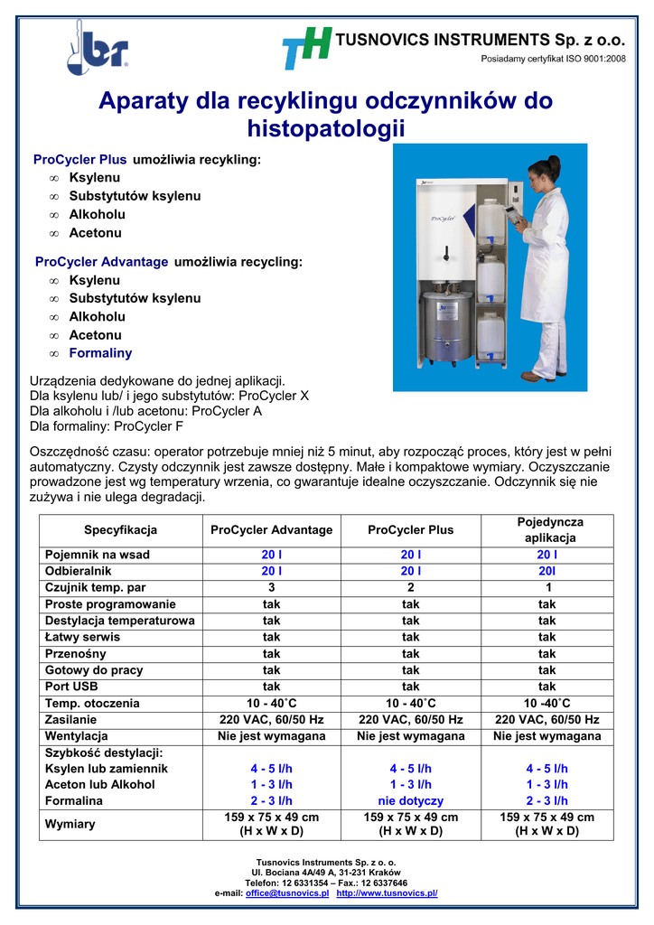 Aparaty dla recyklingu odczynników do histopatologii ProCycler Plus umożliwia recykling: • Ksylenu • Substytutów ksylenu • Alkoholu • Acetonu ProCycler Advantage umożliwia recycling: • Ksylenu • Substytutów ksylenu • Alkoholu • Acetonu • Formaliny Urządzenia dedykowane do jednej aplikacji. Dla ksylenu lub/ i jego substytutów: ProCycler X Dla alkoholu i /lub acetonu: ProCycler A Dla formaliny: ProCycler F Oszczędność czasu: operator potrzebuje mniej niż 5 minut, aby rozpocząć proces, który jest w pełni automatyczny. Czysty odczynnik jest zawsze dostępny. Małe i kompaktowe wymiary. Oczyszczanie prowadzone jest wg temperatury wrzenia, co gwarantuje idealne oczyszczanie. Odczynnik się nie zużywa i nie ulega degradacji. Specyfikacja ProCycler Advantage ProCycler Plus Pojemnik na wsad Odbieralnik Czujnik temp. par Proste programowanie Destylacja temperaturowa Łatwy serwis Przenośny Gotowy do pracy Port USB Temp. otoczenia Zasilanie Wentylacja Szybkość destylacji: Ksylen lub zamiennik Aceton lub Alkohol Formalina 20 l 20 l 3 tak tak tak tak tak tak 10 - 40˚C 220 VAC, 60/50 Hz Nie jest wymagana 20 l 20 l 2 tak tak tak tak tak tak 10 - 40˚C 220 VAC, 60/50 Hz Nie jest wymagana Pojedyncza aplikacja 20 l 20l 1 tak tak tak tak tak tak 10 -40˚C 220 VAC, 60/50 Hz Nie jest wymagana 4 - 5 l/h 1 - 3 l/h 2 - 3 l/h 159 x 75 x 49 cm (H x W x D) 4 - 5 l/h 1 - 3 l/h nie dotyczy 159 x 75 x 49 cm (H x W x D) 4 - 5 l/h 1 - 3 l/h 2 - 3 l/h 159 x 75 x 49 cm (H x W x D) Wymiary Tusnovics Instruments Sp. z o. o. Ul. Bociana 4A/49 A, 31-231 Kraków Telefon: 12 6331354 – Fax.: 12 6337646 e-mail: [email protected] http://www.tusnovics.pl/ MiniProCycler umożliwia recykling: • • • • Ksylenu Substytutów Ksylenu Alkoholu Acetonu MiniProCycler F Urządzenie Dedykowane do Recyklingu FORMALINY MiniProCycler Advantage umożliwia recykling: • • • • • Ksylen Substytuty Ksylenu Alkohol Aceton Formalina Jedno urządzenie zapewnia możliwość recyklingu wszystkich rozpuszczalników. Podwojenie wydajności, ale NIE kosztów. Recykling formaliny i jednego rozpuszczalnika jednocześnie! Oszczędności wynikające z użycia tego systemu rosną podwójnie. Specyfikacja Pojemnik na wsad Odbieralnik Czujnik temp. par Proste programowanie Destylacja temperaturowa Łatwy serwis Przenośny Gotowy do pracy Port USB Temp. otoczenia Zasilanie Wentylacja Szybkość destylacji: Ksylen lub zamiennik Aceton lub Alkohol Formalina Wymiary MiniProcycler Advantage 10 l 8l tak tak tak tak tak tak tak 10 - 40˚C 220 VAC, 60/50 Hz Nie jest wymagana MiniProcycler MiniProcycler F 10 l 8l tak tak tak tak tak tak tak 10 - 40˚C 220 VAC, 60/50 Hz Nie jest wymagana 10 l 8l tak tak tak tak tak tak tak 10 - 40˚C 220 VAC, 60/50 Hz Nie jest wymagana 3 - 4 l/h 1 - 3 l/h 1 - 2 l/h 107 x 72 x 61 cm (H x W x D) 3 - 4 l/h 1 - 3 l/h Nie dotyczy 107 x 36 x 61 cm (H x W x D) Nie dotyczy Nie dotyczy 1 - 2 l/h 107 x 36 x 61 cm (H x W x D) Tusnovics Instruments Sp. z o. o. Ul. Bociana 4A/49 A, 31-231 Kraków Telefon: 12 6331354 – Fax.: 12 6337646 e-mail: [email protected] http://www.tusnovics.pl/