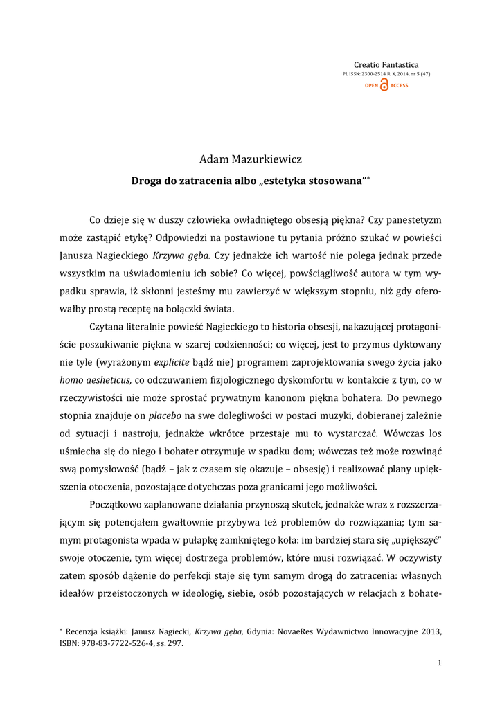 Creatio Fantastica PL ISSN: 2300-2514 R. X, 2014, nr 5 (47) Adam Mazurkiewicz Droga do zatracenia albo „estetyka stosowana” Co dzieje się w duszy człowieka owładniętego obsesją piękna? Czy panestetyzm może zastąpić etykę? Odpowiedzi na postawione tu pytania próżno szukać w powieści Janusza Nagieckiego Krzywa gęba. Czy jednakże ich wartość nie polega jednak przede wszystkim na uświadomieniu ich sobie? Co więcej, powściągliwość autora w tym wypadku sprawia, iż skłonni jesteśmy mu zawierzyć w większym stopniu, niż gdy oferowałby prostą receptę na bolączki świata. Czytana literalnie powieść Nagieckiego to historia obsesji, nakazującej protagoniście poszukiwanie piękna w szarej codzienności; co więcej, jest to przymus dyktowany nie tyle (wyrażonym explicite bądź nie) programem zaprojektowania swego życia jako homo aesheticus, co odczuwaniem fizjologicznego dyskomfortu w kontakcie z tym, co w rzeczywistości nie może sprostać prywatnym kanonom piękna bohatera. Do pewnego stopnia znajduje on placebo na swe dolegliwości w postaci muzyki, dobieranej zależnie od sytuacji i nastroju, jednakże wkrótce przestaje mu to wystarczać. Wówczas los uśmiecha się do niego i bohater otrzymuje w spadku dom; wówczas też może rozwinąć swą pomysłowość (bądź – jak z czasem się okazuje – obsesję) i realizować plany upiększenia otoczenia, pozostające dotychczas poza granicami jego możliwości. Początkowo zaplanowane działania przynoszą skutek, jednakże wraz z rozszerzającym się potencjałem gwałtownie przybywa też problemów do rozwiązania; tym samym protagonista wpada w pułapkę zamkniętego koła: im bardziej stara się „upiększyć” swoje otoczenie, tym więcej dostrzega problemów, które musi rozwiązać. W oczywisty zatem sposób dążenie do perfekcji staje się tym samym drogą do zatracenia: własnych ideałów przeistoczonych w ideologię, siebie, osób pozostających w relacjach z bohate- Recenzja książki: Janusz Nagiecki, Krzywa gęba, Gdynia: NovaeRes Wydawnictwo Innowacyjne 2013, ISBN: 978-83-7722-526-4, ss. 297. 1 rem... Z tej perspektywy dramat jednostki skazanej na niespełnienie spowodowane perfekcjonizmem zdaje się przestrogą przed doskonałością, dla osiągnięcia której bohater nie waha się popełnić zbrodni1. Spójrzmy jednak na opowieść Nagieckiego przez pryzmat ponowoczesnych projektów estetycznych i ich społeczno-obyczajowych konsekwencji. Jeśli potraktujemy fabularne zdarzenia jako anegdotę, stanowiącą zaledwie punkt wyjścia (nie zaś dojścia, jak w suponowanym wyżej odczytaniu) do eseistycznego namysłu nad kondycją postmodernistycznej estetyki, istotnym punktem odniesienia stanie się koncepcja anestetyki Wolfganga Welscha2. Tożsamy jest zresztą w obu przypadkach – tak pisarza, jak filozofia – punkt wyjścia: współczesna czytelnikowi (resp. bohaterowi) rzeczywistość jest nasycona do tego stopnia tendencjami estetyzującymi, że domaga się reakcji odbiorców komunikatów, przeistaczających się – na skutek nadmiaru – w „biały szum”. Możliwe jest przy tym obranie strategii, które rozciągają się pomiędzy dwoma biegunami przeciwieństw: albo „znieczulimy się” na owe przekazy (to postulat Weslcha, opatrującego ją mianem anestetyki), albo podążymy za sprzecznymi nierzadko sygnałami, zatracając się w kolejnych propozycjach tak, iż to, co miało stać się narzędziem, przeistoczy się w wartość nadrzędną (sytuację tę opisał Nagiecki). Odczytywanie Krzywej gęby z tej perspektywy pozwala zrozumieć osobliwości poetyki tego utworu: ograniczenie partii dialogowych, uniwersalizacja bohaterów sprowadzonych do znaków, pozbawionych wyróżników w postaci imion. również sceneria fabularnych zdarzeń, mimo pojawiających się niekiedy obszernych opisów, zdaje się bardziej umowną scenografią, niż światem przedstawionym, do którego pełni jesteśmy w prozie przyzwyczajeni. Równie co zewnętrzność, skryta w niedopowiedzeniach pozostaje psychika głównego bohatera, której stany możemy obserwować zazwyczaj pośrednio, dzięki opisom zachowań. Metoda ukazywania owych stanów, inspirowana założeniami psychologii behawioralnej, zdaje się jednak nie tyle suponować głębię i mroki psyche protagonisty, co ma za zadanie dodatkowo wzmagać poczucie wyobcowania jed- Zaproponowany tu sposób interpretacji można dostrzec w jednym z nielicznych omówień powieści; zob.: Recenzja książki „Krzywa gęba”. Janusz Nagiecki, w: http://www.kobietnik.pl/2013/05/recenzja-ksiazkikrzywa-geba-janusz.html [dostęp: 18 września 2014]. 2 Zob.: W. Welsch, Estetyka i anestetyka, przekł. M. Łukasiewicz, [w]: Postmodernizm. Antologia przekładów, red. R. Nycz, Kraków: Wydawnictwo Baran i Suszczyński 1998, ss. 520–546. Mimo iż szkic Welscha pochodzi z 1991 roku, nie tylko nie stracił na aktualności, ale – wraz z rozwojem paradygmatu cyberkultury i refleksjonujących ją nowych nurtów filozoficznych (przede wszystkim posthumanizmu) – postawione w nim tezy uległy wyostrzeniu. 1 2 nostki, której życie wewnętrzne pozostaje tajemnicą tak dla innych postaci, jak i czytelnika. Warto – zwłaszcza w dobie ekspansji kiczu wszelakiego rodzaju – pamiętać o bezimiennym bohaterze opowieści Nagieckiego: jako przestrodze, ale i pułapce, która czyha na perfekcjonistów, usiłujących sprowadzić wielowymiarowość świata do tego, co zdolni będą uznać za „ładne”. 3