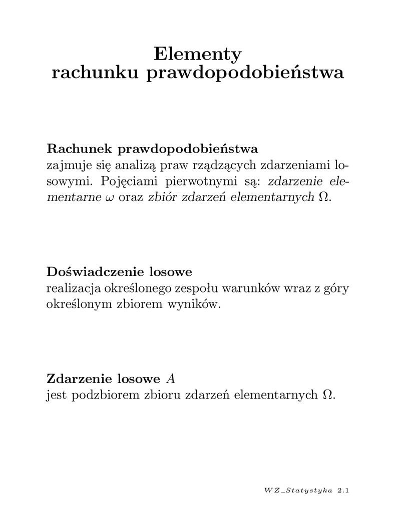 zajmuje się analizą praw rządzących zdarzeniami losowymi. Pojęciami pierwotnymi są: zdarzenie elementarne ω oraz zbiór zdarzeń elementarnych Ω.