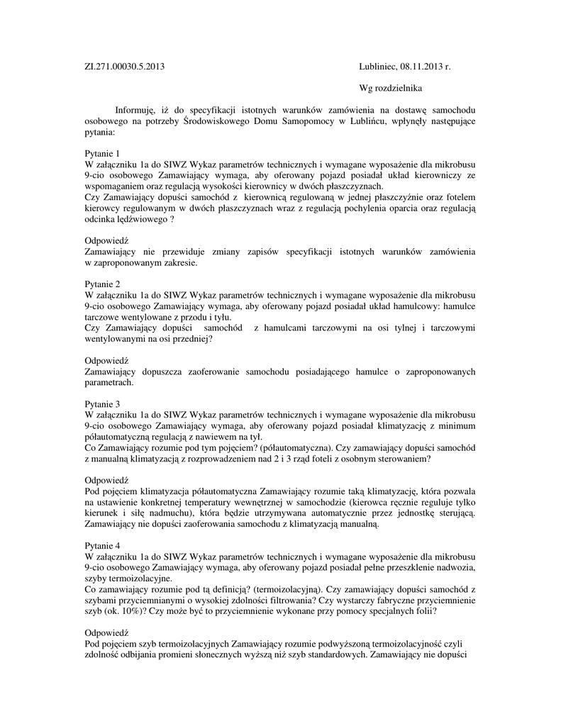 ZI.271.00030.5.2013 Lubliniec, 08.11.2013 r. Wg rozdzielnika Informuję, iż do specyfikacji istotnych warunków zamówienia na dostawę samochodu osobowego na potrzeby Środowiskowego Domu Samopomocy w Lublińcu, wpłynęły następujące pytania: Pytanie 1 W załączniku 1a do SIWZ Wykaz parametrów technicznych i wymagane wyposażenie dla mikrobusu 9-cio osobowego Zamawiający wymaga, aby oferowany pojazd posiadał układ kierowniczy ze wspomaganiem oraz regulacją wysokości kierownicy w dwóch płaszczyznach. Czy Zamawiający dopuści samochód z kierownicą regulowaną w jednej płaszczyźnie oraz fotelem kierowcy regulowanym w dwóch płaszczyznach wraz z regulacją pochylenia oparcia oraz regulacją odcinka lędźwiowego ? Odpowiedź Zamawiający nie przewiduje zmiany zapisów specyfikacji istotnych warunków zamówienia w zaproponowanym zakresie. Pytanie 2 W załączniku 1a do SIWZ Wykaz parametrów technicznych i wymagane wyposażenie dla mikrobusu 9-cio osobowego Zamawiający wymaga, aby oferowany pojazd posiadał układ hamulcowy: hamulce tarczowe wentylowane z przodu i tyłu. Czy Zamawiający dopuści samochód z hamulcami tarczowymi na osi tylnej i tarczowymi wentylowanymi na osi przedniej? Odpowiedź Zamawiający dopuszcza zaoferowanie samochodu posiadającego hamulce o zaproponowanych parametrach. Pytanie 3 W załączniku 1a do SIWZ Wykaz parametrów technicznych i wymagane wyposażenie dla mikrobusu 9-cio osobowego Zamawiający wymaga, aby oferowany pojazd posiadał klimatyzację z minimum półautomatyczną regulacją z nawiewem na tył. Co Zamawiający rozumie pod tym pojęciem? (półautomatyczna). Czy zamawiający dopuści samochód z manualną klimatyzacją z rozprowadzeniem nad 2 i 3 rząd foteli z osobnym sterowaniem? Odpowiedź Pod pojęciem klimatyzacja półautomatyczna Zamawiający rozumie taką klimatyzację, która pozwala na ustawienie konkretnej temperatury wewnętrznej w samochodzie (kierowca ręcznie reguluje tylko kierunek i siłę nadmuchu), która będzie utrzymywana automatycznie przez jednostkę sterującą. Zamawiający nie dopuści zaoferowania samochodu z klimatyzacją manualną. Pytanie 4 W załączniku 1a do SIWZ Wykaz parametrów technicznych i wymagane wyposażenie dla mikrobusu 9-cio osobowego Zamawiający wymaga, aby oferowany pojazd posiadał pełne przeszklenie nadwozia, szyby termoizolacyjne. Co zamawiający rozumie pod tą definicją? (termoizolacyjną). Czy zamawiający dopuści samochód z szybami przyciemnianymi o wysokiej zdolności filtrowania? Czy wystarczy fabryczne przyciemnienie szyb (ok. 10%)? Czy może być to przyciemnienie wykonane przy pomocy specjalnych folii? Odpowiedź Pod pojęciem szyb termoizolacyjnych Zamawiający rozumie podwyższoną termoizolacyjność czyli zdolność odbijania promieni słonecznych wyższą niż szyb standardowych. Zamawiający nie dopuści zaoferowania samochodu bez szyb o podwyższonej termoizolacyjności. Zamawiający dopuści zaoferowanie samochodu z fabrycznie przyciemnianymi szybami o wysokiej zdolności filtrowania. Pytanie 5 W załączniku 1a do SIWZ Wykaz parametrów technicznych i wymagane wyposażenie dla mikrobusu 9-cio osobowego Zamawiający wymaga, aby oferowany pojazd posiadał światła do jazdy dziennej włączane automatycznie. Czy zamawiający dopuści samochód z automatycznym włącznikiem świateł mijania zamiast świateł do jazdy dziennej? Odpowiedź Zamawiający nie dopuści zaoferowania samochodu z automatycznym włącznikiem świateł mijania zamiast świateł do jazdy dziennej. Światła do jazdy dziennej włączane automatycznie w ocenie Zamawiającego stanowią oddzielną funkcje świateł (są bardziej ekonomiczne). Pytanie 6 W załączniku 1a do SIWZ Wykaz parametrów technicznych i wymagane wyposażenie dla mikrobusu 9-cio osobowego Zamawiający wymaga, aby oferowany pojazd posiadał fotele w układzie: fotel kierowcy z podłokietnikiem, fotele obok kierowcy (2 os) dowolnego układu (dwa pojedyncze lub jeden podwójny); • rząd II – trzymiejscowy w układzie dowolnym z odchylanym fotelem zewnętrznym; • rząd III - trzy miejscowy z możliwością demontażu • Możliwość szybkiego demontażu foteli w II i III rzędzie bez użycia narzędzi. Wszystkie fotele wyposażone w zagłówki i trzy punkowe pasy bezpieczeństwa dla każdego pasażera. Czy zamawiający dopuści samochód z 3 osobową kanapą 2 rzędu foteli z odchylanym oparciem prawego skrajnego fotela? Odpowiedź Zamawiający nie dopuści zaoferowania samochodu z 3 osobową kanapą 2 rzędu foteli z odchylanym oparciem prawego skrajnego fotela. Zgodnie z zapisami SIWZ, 2 rząd trzymiejscowy w układzie dowolnym powinien posiadać możliwość z odchylania fotela zewnętrznego a nie tylko jego oparcia, celem łatwiejszego zajęcia miejsc w 3 rzędzie. Pytanie 7 Do ustalenia wysokości składki potrzebujemy następujących informacji: ( informacje dotyczą przyszłego właściciela pojazdu który będzie występował w dowodzie rejestracyjnym pojazdu); czy jesteście państwo płatnikiem VAT? (tzn. czy ubezpieczenie auta od wartości netto czy brutto?); ile obecnie posiadacie samochodów i w jakiej firmie je ubezpieczacie?; w jakiej wysokości zniżki posiadacie Państwo w ubezpieczeniach OC oraz AC?; ile szkód mieliście Państwo w ostatnich 24 miesiącach (OC oraz AC)?; jeśli tak to w jakiej wysokości odszkodowania były wypłacane z tych polis? Odpowiedź: Właścicielem pojazdu występującym w dowodzie rejestracyjnym będzie : Gmina Lubliniec natomiast użytkownikiem Środowiskowy Dom Samopomocy. Samochód należy ubezpieczyć od wartości brutto. Gmina Lubliniec zawarła ubezpieczenie komunikacyjne kompleksowe na podstawie procedury przetargowej. Kompleksowemu ubezpieczeniu komunikacyjnemu podlegają cztery jednostki organizacyjne Gminy ( Straż miejska, ŚDS, OSP ZGKLiC) z łączną liczbą osiemnastu pojazdów. Umowa ubezpieczeniowa zawarta jest z Towarzystwem Ubezpieczeń Wzajemnych TU