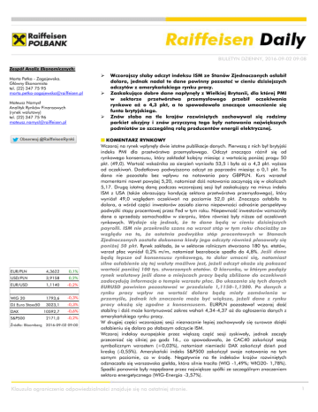BIULETYN DZIENNY, 2016-09-02 09:08 Zespół Analiz Ekonomicznych: Marta Petka - Zagajewska. Główny Ekonomista tel. (22) 347 75 95 [email protected] Mateusz Namysł Analityk Rynków Finansowych (rynek walutowy) tel. (22) 347 75 96 [email protected] 4,3622 0,1% USD/PLN 3,9158 0,2% EUR/USD 1,1140 -0,2% WIG 20 1793,6 -0,3% DAX S&P500 EUR/PLN DJ Euro Stoxx50 3023,1 -0,3% 10592,7 -0,6% 2171,0 -0,2% Źródło: Bloomberg 2016-09-02 09:00 Wczorajszy słaby odczyt indeksu ISM ze Stanów Zjednoczonych osłabił dolara, jednak nadal te dane powinny pozostać w cieniu dzisiejszych odczytów z amerykańskiego rynku pracy. Zaskakująco dobre dane napłynęły z Wielkiej Brytanii, dla której PMI w sektorze przetwórstwa przemysłowego przebił oczekiwania rynkowe aż o 4,3 pkt, a to spowodowało znaczące umocnienie się funta brytyjskiego. Znów słabo na tle krajów rozwiniętych zachowywał się rodzimy parkiet akcyjny i znów przyczyną tego były notowania największych podmiotów ze szczególną rolą producentów energii elektrycznej. KOMENTARZ RYNKOWY Wczoraj na rynek wpłynęły dwie istotne publikacje danych. Pierwszą z nich był brytyjski indeks PMI dla przetwórstwa przemysłowego. Odczyt znacząco różnił się od rynkowego konsensusu, który zakładał kolejny miesiąc z wartością poniżej progu 50 pkt. (49,0). Wartość wskaźnika za sierpień wyniosła 53,5 i była aż o 4,3 pkt. wyższa od oczekiwań. Dodatkowo podwyższono odczyt za poprzedni miesiąc o 0,1 pkt. Ta dana nie pozostała bez wpływu na notowania pary GBPPLN. Kurs wzrastał momentami nawet powyżej 5,20, natomiast dziś notowania zaczynają się w okolicach 5,17. Drugą istotną daną podczas wczorajszej sesji był zaskakujący na minus indeks ISM z USA (także obrazujący kondycję sektora przetwórstwa przemysłowego), który wyniósł 49,0 względem oczekiwań na poziomie 52,0 pkt. Znacząco osłabiło to dolara, a wśród części inwestorów zasiało ziarno niepewności odnośnie perspektywy podwyżki stopy procentowej przez Fed w tym roku. Niepewność inwestorów wzmocniły dane o sprzedaży samochodów w sierpniu, które również były niższe od oczekiwań rynkowych. Wydaje się jednak, że te dane będą w cieniu dzisiejszych payrolli. ISM nie przekreśla szans na wzrost stóp w tym roku chociażby ze względu na to, że ostatnia podwyżka stóp procentowych w Stanach Zjednoczonych została dokonana kiedy jego odczyty również plasowały się poniżej 50 pkt. Rynek zakłada, że w sektorze rolniczym stworzono 180 tys. etatów, wzrost płac wyniósł 0,2% m/m, natomiast bezrobocie spadło do 4,8%. Jeśli dane będą lepsze od konsensusu rynkowego, to dolar umocni się, natomiast silne osłabienie się tej waluty możliwe jest, jeżeli odczyt okaże się pokazać wartość poniżej 100 tys. stworzonych etatów. O kierunku, w którym podąży rynek walutowy jeśli dane o miejscach pracy będą zbliżone do oczekiwań zadecydują informacje o tempie wzrostu płac. Do ukazania się tych danych EURUSD powinien pozostawać w przedziale 1,1150-1,1200. Po danych z rynku pracy wpływ na wartość dolara będą miały zamówienia w przemyśle, jednak ich znaczenie może być większe, jeżeli dane z rynku pracy okażą się zgodne z konsensusem. EURPLN pozostawał wczoraj dość stabilny i dziś może kontynuować zakres wahań 4,34-4,37 aż do ogłoszenia danych z amerykańskiego rynku pracy. W drugiej części wczorajszej sesji nieznacznie lepiej zachowywały się surowce dzięki osłabieniu się dolara po słabszym odczycie ISM. Wczoraj indeksy europejskie przez większą część sesji zyskiwały, jednak zaczęły przeceniać się silniej po godz 16., co spowodowało, że CAC40 zakończył sesję symbolicznym wzrostem (+0,03%), natomiast niemiecki DAX zakończył dzień pod kreską (-0,55%). Amerykański indeks S&P500 zakończył swoje notowania na tym samym poziomie, co w środę. Negatywnie na tle indeksów krajów rozwiniętych odznaczała się warszawska giełda, która silnie traciła (WIG -1,49%; WIG20- 1,78%). Spadki ponownie były napędzane przez największe spółki ze szczególnym znaczeniem sektora energetycznego (WIG-Energia -3,57%). Klauzula ograniczenia odpowiedzialności znajduje się na ostatniej stronie. 1 BIULETYN DZIENNY, 2016-09-02 09:08 Klauzula ograniczenia odpowiedzialności znajduje się na ostatniej stronie. 2 BIULETYN DZIENNY, 2016-09-02 09:08 Kalendarium Godz. Kraj Wskaźnik 08:00 DE Indeks zaufania konsumentów - GfK (Sierpień, pkt.) 10:30 UK Produkt Krajowy Brutto, fin. (2 kwartał, %, k/k) 14:30 US PKB (annualizowany), rew. (2 kwartał, %, r/r) 16:00 US Indeks Uniwersytetu Michigan, fin. (Sierpień, pkt.) Ostateczna dana Prognoza Raiffeisen Średnia Poprzedni oczekiwań PIĄTEK 26 SIERPNIA 10,2 0,6 1,10 1,00 9,90 10,00 0,60 0,60 1,10 1,20 90,60 90,40 PONIEDZIAŁEK 29 SIERPNIA 14:30 US Dochody konsumentów (Lipiec, %, m/m) 0,40 0,30 0,40 0,20 14:30 US Wydatki konsumentów (Lipiec, %, m/m) 0,30 0,30 0,30 0,40 102,40 102,70 WTOREK 30 SIERPNIA 09:00 CH Indeks instytutu KOF (Sierpień, pkt.) 99,80 10:00 PL Produkt Krajowy Brutto, fin. (2 kwartał, %, k/k) 3,10 14:00 DE Inflacja konsumencka, wst. (Sierpień, %, r/r) 16:00 US Indeks zaufania konsumentów - Conference Board (Sierpień, pkt.) ŚRODA 31 SIERPNIA 08:45 FR Inflacja konsumencka, wst. (Sierpień, %, m/m) 0,30 09:55 DE Stopa bezrobocia (Sierpień, %) 6,10 11:00 EZ Inflacja, wst. (Sierpień, %, m/m) 0,20 11:00 EZ Stopa bezrobocia (Lipiec, %,) 10,10 14:00 PL Inflacja CPI (Sierpień, %, r/r) 14:15 US Raport ADP (Sierpień, tys.) 15:45 US Indeks Chicago PMI (Sierpień, pkt.) 16:00 US Indeks podpisanych umów kupna domów (Lipiec, %, m/m) 09:00 PL Indeks PMI dla przemysłu (Sierpień, pkt.) 51,50 09:15 CH Sprzedaż detaliczna (Lipiec, %, m/m) -2,20 10:00 EZ Indeks PMI dla przemysłu, fin. (Sierpień, pkt.) 51,70 51,80 51,80 10:30 13:30 UK US Indeks PMI dla przemysłu (Sierpień, pkt.) Raport Challengera (Sierpień, tys.) 53,30 32,19