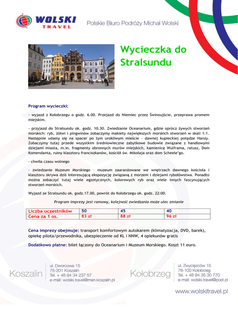 Wycieczka do Stralsundu Program wycieczki: - wyjazd z Kołobrzegu o godz. 6.00. Przejazd do Niemiec przez Świnoujście, przeprawa promem miejskim. - przyjazd do Stralsundu ok. godz. 10.30. Zwiedzanie Oceanarium, gdzie oprócz żywych stworzeń morskich: ryb, żółwi i pingwinów zobaczymy makiety największych morskich stworzeń w skali 1:1. Następnie udamy się na spacer po tym urokliwym mieście - dawnej kupieckiej potędze Hanzy. Zobaczymy tutaj przede wszystkim średniowieczne zabytkowe budowle związane z handlowymi dziejami miasta, m.in. fragmenty obronnych murów miejskich, kamienicę Wulframa, ratusz, Dom Komendanta, ruiny klasztoru franciszkanów, kościół św. Mikołaja oraz dom Scheele’go. - chwila czasu wolnego - zwiedzanie Muzeum Morskiego – muzeum zaaranżowane we wnętrzach dawnego kościoła i klasztoru skrywa dziś interesującą ekspozycję związaną z morzem i dziejami rybołówstwa. Ponadto można zobaczyć tutaj wiele egzotycznych, kolorowych ryb oraz wiele innych fascynujących stworzeń morskich. Wyjazd ze Stralsundu ok. godz.17.00, powrót do Kołobrzegu ok. godz. 22:00. Program imprezy jest ramowy, kolejność zwiedzania może ulec zmianie Liczba uczestników Cena za 1 os. 50 83 zł 45 88 zł 40 96 zł Cena imprezy obejmuje: transport komfortowym autokarem (klimatyzacja, DVD, barek), opiekę pilota/przewodnika, ubezpieczenie od KL i NNW, 4 opiekunów gratis Dodatkowo płatne: bilet łączony do Oceanarium i Muzeum Morskiego. Koszt 11 euro.