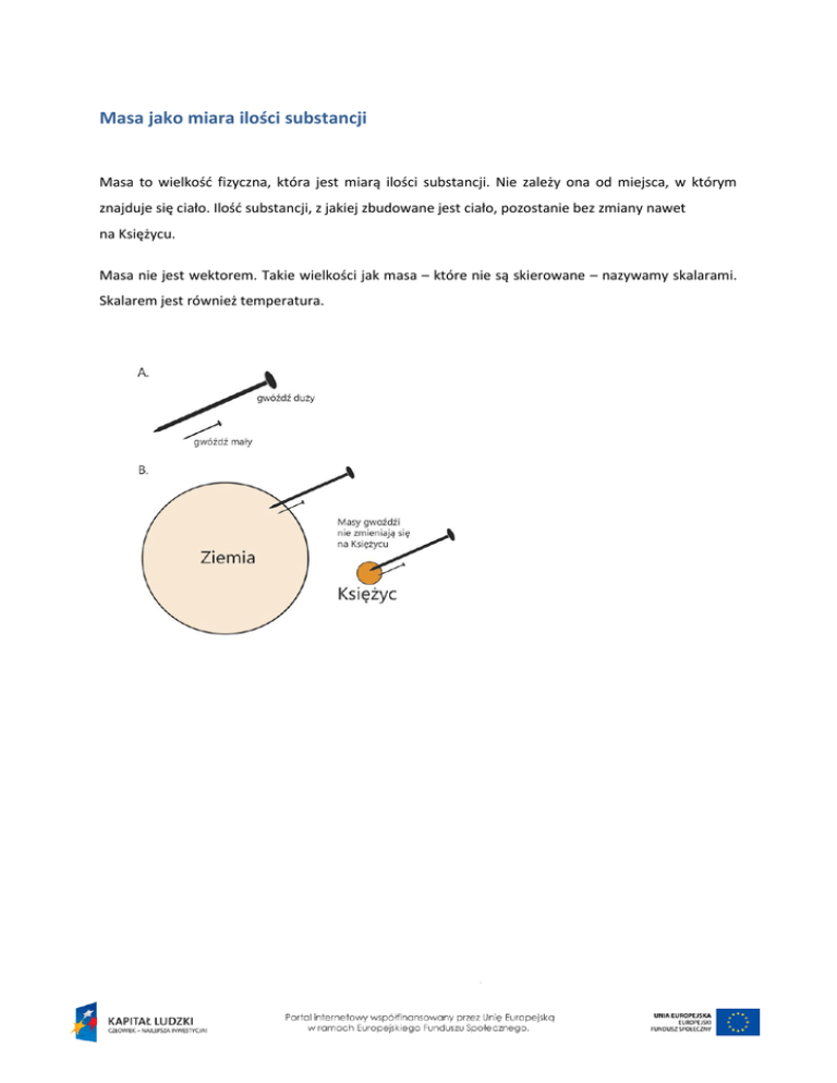 Masa jako miara ilości substancji Masa to wielkość fizyczna, która jest miarą ilości substancji. Nie zależy ona od miejsca, w którym znajduje się ciało. Ilość substancji, z jakiej zbudowane jest ciało, pozostanie bez zmiany nawet na Księżycu. Masa nie jest wektorem. Takie wielkości jak masa – które nie są skierowane – nazywamy skalarami. Skalarem jest również temperatura.