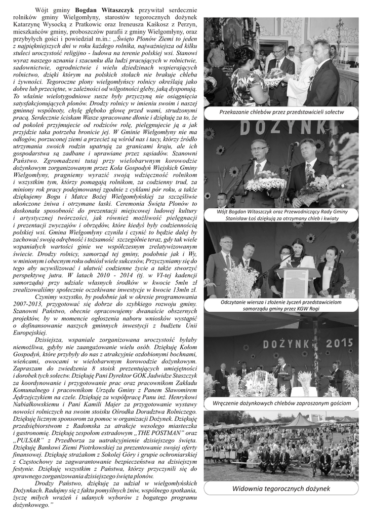 Wójt gminy Bogdan Witaszczyk przywitał serdecznie rolników gminy Wielgomłyny, starostów tegorocznych dożynek Katarzynę Wysocką z Pratkowic oraz Ireneusza Kaśkosz z Perzyn, mieszkańców gminy, proboszczów parafii z gminy Wielgomłyny, oraz przybyłych gości i powiedział m.in.: „Święto Plonów Ziemi to jeden z najpiękniejszych dni w roku każdego rolnika, najważniejsza od kilku stuleci uroczystość religijno - ludowa na terenie polskiej wsi. Stanowi wyraz naszego uznania i szacunku dla ludzi pracujących w rolnictwie, sadownictwie, ogrodnictwie i wielu dziedzinach wspierających rolnictwo, dzięki którym na polskich stołach nie brakuje chleba i żywności. Tegoroczne plony wielgomłyńscy rolnicy określają jako dobre lub przeciętne, w zależności od wilgotności gleby, jaką dysponują. To właśnie wielotygodniowe susze były przyczyną nie osiągnięcia satysfakcjonujących plonów. Drodzy rolnicy w imieniu swoim i naszej gminnej wspólnoty, chylę głęboko głowę przed wami, strudzonymi pracą. Serdecznie ściskam Wasze spracowane dłonie i dziękuję za to, że od pokoleń przyjmujecie od rodziców rolę, pielęgnujecie ją a jak przyjdzie taka potrzeba bronicie jej. W Gminie Wielgomłyny nie ma odłogów, porzuconej ziemi a przecież są wśród nas i tacy, którzy źródło utrzymania swoich rodzin upatrują za granicami kraju, ale ich gospodarstwa są zadbane i uprawiane przez sąsiadów. Szanowni Państwo. Zgromadzeni tutaj przy wielobarwnym korowodzie dożynkowym zorganizowanym przez Koła Gospodyń Wiejskich Gminy Wielgomłyny, pragniemy wyrazić swoją wdzięczność rolnikom i wszystkim tym, którzy pomagają rolnikom, za codzienny trud, za miniony rok pracy podejmowanej zgodnie z cyklami pór roku, a także dziękujemy Bogu i Matce Bożej Wielgomłyńskiej za szczęśliwie ukończone żniwa i otrzymane łaski. Ceremonia Święta Plonów to doskonała sposobność do prezentacji miejscowej ludowej kultury i artystycznej twórczości, jak również możliwość pielęgnacji i prezentacji zwyczajów i obrzędów, które kiedyś były codziennością polskiej wsi. Gmina Wielgomłyny czyniła i czynić to będzie dalej by zachować swoją odrębność i tożsamość szczególnie teraz, gdy tak wiele wspaniałych wartości ginie we współczesnym zrelatywizowanym świecie. Drodzy rolnicy, samorząd tej gminy, podobnie jak i Wy, w minionym i obecnym roku odniósł wiele sukcesów, Przyczyniamy się do tego aby ucywilizować i ułatwić codzienne życie a także stworzyć perspektywę jutra. W latach 2010 - 2014 (tj. w VI-tej kadencji samorządu) przy udziale własnych środków w kwocie 5mln zł zrealizowaliśmy społecznie oczekiwane inwestycje w kwocie 13mln zł. Czynimy wszystko, by podobnie jak w okresie programowania 2007-2013, przygotować się dobrze do szybkiego rozwoju gminy. Szanowni Państwo, obecnie opracowujemy dwanaście obszernych projektów, by w momencie ogłoszenia naboru wniosków wystąpić o dofinansowanie naszych gminnych inwestycji z budżetu Unii Europejskiej. Dzisiejsza, wspaniale zorganizowana uroczystość byłaby niemożliwa, gdyby nie zaangażowanie wielu osób. Dziękuję Kołom Gospodyń, które przybyły do nas z atrakcyjnie ozdobionymi bochnami, wieńcami, owocami w wielobarwnym korowodzie dożynkowym. Zapraszam do zwiedzenia 8 stoisk prezentujących umiejętności i dorobek tych sołectw. Dziękuję Pani Dyrektor GOK Jadwidze Staszczyk za koordynowanie i przygotowanie prac oraz pracownikom Zakładu Komunalnego i pracownikom Urzędu Gminy z Panem Sławomirem Jędrzejczykiem na czele. Dziękuję za współpracę Panu inż. Henrykowi Nabiałkowskiemu i Pani Kamili Majer za przygotowanie wystawy nowości rolniczych na swoim stoisku Ośrodka Doradztwa Rolniczego. Dziękuję licznym sponsorom za pomoc w organizacji Dożynek. Dziękuję przedsiębiorstwom z Radomska za atrakcje wesołego miasteczka i gastronomię. Dziękuję zespołom estradowym „THE POSTMAN” oraz „PULSAR” z Przedborza za uatrakcyjnienie dzisiejszego święta. Dziękuję Bankowi Ziemi Piotrkowskiej za prezentowanie swojej oferty finansowej. Dziękuję strażakom z Sokolej Góry i grupie ochroniarskiej z Częstochowy za zagwarantowanie bezpieczeństwa na dzisiejszym festynie. Dziękuję wszystkim z Państwa, którzy przyczynili się do sprawnego zorganizowania dzisiejszego święta plonów. Drodzy Państwo, dziękuję za udział w wielgomłyńskich Dożynkach. Radujmy się z faktu pomyślnych żniw, wspólnego spotkania, życzę miłych wrażeń i udanych wyborów z bogatego programu dożynkowego.” Przekazanie chlebów przez przedstawicieli sołectw Wójt Bogdan Witaszczyk oraz Przewodniczący Rady Gminy Stanisław Łoś dziękują za otrzymany chleb i kwiaty Odczytanie wiersza i złożenie życzeń przedstawicielom samorządu gminy przez KGW Rogi Wręczenie dożynkowych chlebów zaproszonym gościom Widownia tegorocznych dożynek