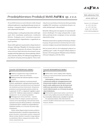 Przedsiębiorstwo Produkcji Mebli sp. z o.o. Firma JAFRA dostarcza swoim klientom meble, których riały drzewne pochodzą od dostawców, którzy posiadają - - - Rok założenia 1946 www.jafra.pl Karnice 2, 55-140 Żmigród tel. +48 71 385 2161, tel. +48 71 385 2162, tel./fax +48 71 385 3362 stancji szkodliwych. Na uwagę zasługuje fakt, że użyte wych, które zaspokajają wyrafinowane oczekiwania lakiery spełniają bardzo restrykcyjne normy i posiadają klientów. Tradycyjna praca rzemieślnicza gwarantu- odpowiednie atesty. szych wyrobów. teryzację. Naszym atutem jest natomiast łączenie nowo- - Dziś już prawie nikt nie robi tradycyjnych połączeń na można stosować litych elementów drewnianych, stosuje- zobaczyć tradycyjną, stolarską robotę. przy blatach stosujemy elementy płytowe. Nasze mate- ZASADY UŻYTKOWANIA MEBLI 1. ZASADY KONSERWACJI MEBLI Meble po rozpakowaniu mogą wydzielać tzw. 1. „zapach nowości”. Zaleca się wietrzenie. wytrzeć do sucha. - 2. Meble należy czyścić miękką, lekko wilgotną tkaniną, po czym powierzchnie czyszczone należy Informujemy, że lakiery zastosowane do znaczeniem. wykończenia mebli nie wymagają konserwacji. 3. Zastosowanie środków chemicznych, zawiera- dliwymi wpływami atmosferycznymi oraz bezpośred- jących woski, nabłyszczacze itp. do konserwacji nim działaniem promieni słonecznych. Temperatura mebli może spowodować zmiany strukturalne warstw lakierowanych, za co Gwarant nie ponosi - odpowiedzialności. 2. mniejszej niż 1 m od czynnych grzejników. 4. Powierzchnie tapicerowane należy co pewien czas oczyścić suchą miękką ściereczką lub miękką szczot- Wymagane jest równe ustawienie – wypozio- mowanie mebli. Po zakupie czynność tę powinien wykonać serwis Sprzedającego. Niewykonanie danej stosować środków chemicznych typu: rozcieńczalniki, benzyna, alkohol. działaniem zamków, za co Gwarant nie ponosi odpowiedzialności. Należy unikać długotrwałego kontaktu polakierogorące naczynia), wodą (mokre wazony), rozpuszczalnikami (rozlany alkohol). Czynniki te mogą wpłynąć na uszkodzenia lakieru, mogą powstać plamy, odbarwienia, zmatowienia, itp. e-mail: [email protected] KARTA GWARANCYJNA Rok założenia 1946 www.jafra.pl Karnice 2, 55-140 Żmigród tel. +48 71 385 2161, tel. +48 71 385 2162, tel./fax +48 71 385 3362 e-mail: [email protected] Monter {czytelny podpis}: GWARANT: Przedsiębiorstwo Produkcji Mebli JAFRA sp. z o.o., Karnice 2, 55-140 Żmigród Dawniej: Przedsiębiorstwo Produkcji Mebli JAFRA Bieniek Franciszek WŁAŚCIWOŚCI MEBLI: - 5. fabrycznych. Gwarant oświadcza, iż meble wykonane przez 7. ostatecznie decyduje przedstawiciel Gwaranta. użytkowania mebli; - – cechy charakterystyczne dla surowców natural- 8. Kupujący nie może żądać wymiany wadliwego mebla na nowy, wolny od wad, gdy: częściami, szczególnie frezowanymi lub toczonymi, – nieznaczne różnice koloru miedzy poszczególnymi bryłami tego samego typu, – mebel został zdekompletowany, – meble zostały zakupione po cenie obniżonej lub wyrób, – upłynął termin 6 miesięcy od daty dostarczenia mebla Kupującemu. - mebli wykonane przez Kupującego lub na jego 9. stąpić wypłowienia, będące naturalnym procesem zlecenie przez inny podmiot niż Gwaranta, promieni UV. lub nieostrożnego przewozu, przenoszenia, zaistnie- przez Gwaranta tylko na terenie Rzeczpospolitej Polskiej. 10. Gwarant wykonuje obowiązki wynikające nia zdarzeń losowych niezależnych od Gwaranta, - uwzględniającym rodzaj wady oraz techniczne możliwości usunięcia wady. 1. Niniejsza gwarancja obejmuje meble wyprodu- 11. kowane przez Gwaranta, który niniejszym oświad- - Uniemożliwienie gwarantowi dokonania oględzin mebli i/lub dokonanie naprawy uważa się za rezygnację z realizacji uprawnień wynikają- gwarancji na okres 24 miesięcy liczonych od daty ich wydania Kupującemu. wadach poinformowano Kupującego. cych z tytułu udzielonej gwarancji. 6. Sposób załatwienia reklamacji {a} 2. – Gwarancja na sprzedane meble nie wyłącza, nie ogranicza, ani nie zawiesza uprawnień 3. Podstawą rozpatrzenia reklamacji przez Gwa- Kupującego wynikających z przepisów ranta jest posiadanie przez Kupującego wypełnio- o rękojmi za wady rzeczy sprzedanej. nej przez Sprzedającego karty gwarancyjnej oraz {b} dokumentu finansowego potwierdzającego sprzedaż usunięcie miałoby wpływ na walory funkcjo- mebli, tj. faktury lub paragonu. nalne lub estetyczne – reklamacja załatwiana jest 4. - zany powiadomić Gwaranta niezwłocznie od chwili miesięcy od daty powstania wady. {c} meble niestandardowe, wykonane pod indy-