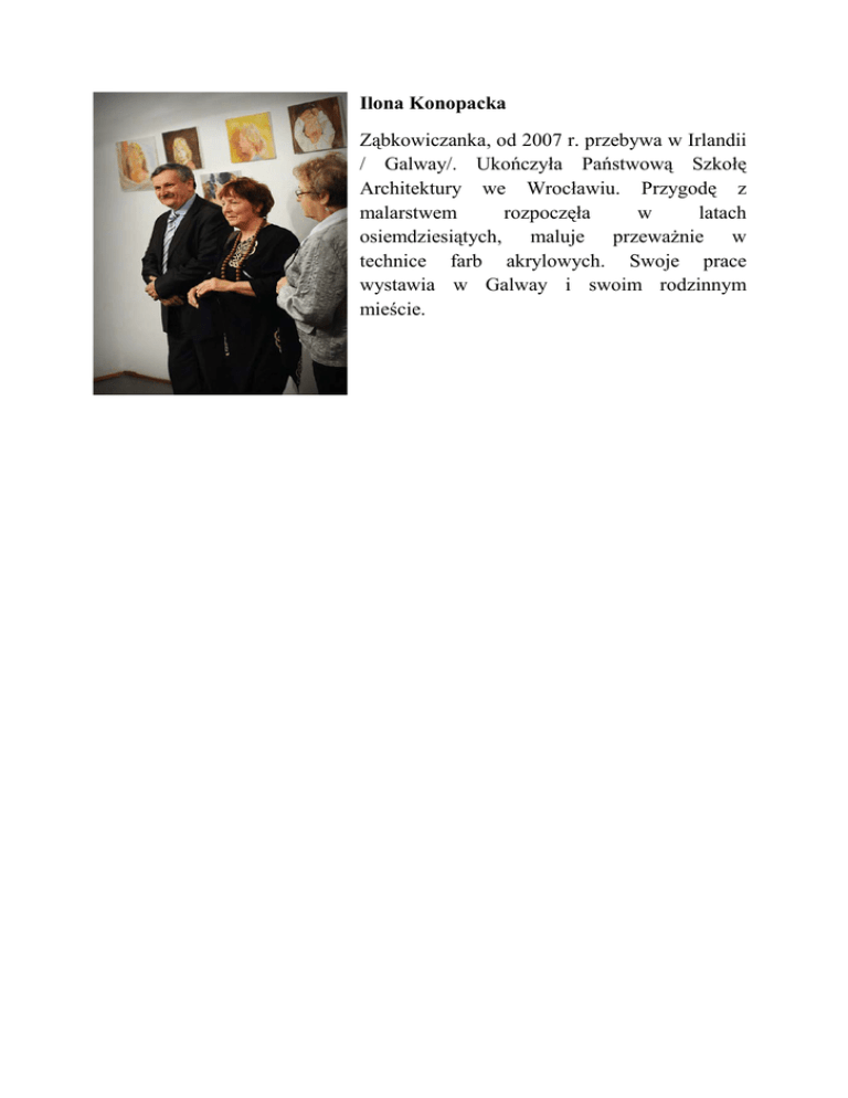 Ilona Konopacka Ząbkowiczanka, od 2007 r. przebywa w Irlandii / Galway/. Ukończyła Państwową Szkołę Architektury we Wrocławiu. Przygodę z malarstwem rozpoczęła w latach osiemdziesiątych, maluje przeważnie w technice farb akrylowych. Swoje prace wystawia w Galway i swoim rodzinnym mieście.