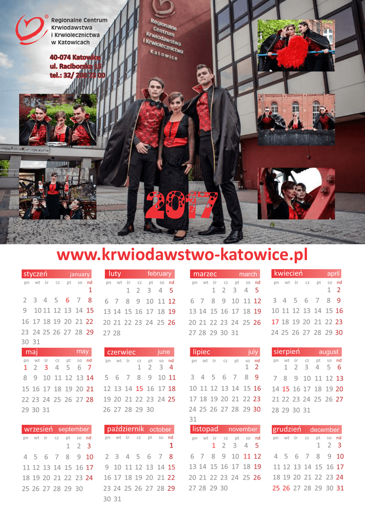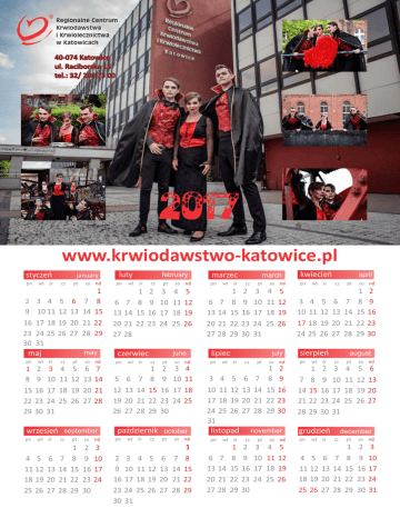 40-074 Katowice ul. Raciborska 15 tel.: 32/ 208 73 00 2017 www.krwiodawstwo-katowice.pl styczeń pn 2 9 16 23 30 wt śr january cz 3 4 5 10 11 12 17 18 19 24 25 26 31 pt 6 13 20 27 maj pn 1 8 15 22 29 3 10 17 24 31 wrzesień pn wt śr 4 5 11 12 18 19 25 26 7 14 21 28 1 8 15 22 29 may wt śr 2 9 16 23 30 so nd 6 13 20 27 cz pt so nd 4 11 18 25 5 12 19 26 6 7 13 14 20 21 27 28 september cz pt so nd 7 14 21 28 1 8 15 22 29 2 3 9 10 16 17 23 24 30 luty pn february marzec cz pt pn 2 9 16 23 3 10 17 24 wt śr 1 6 7 8 13 14 15 20 21 22 27 28 5 12 19 26 wt śr 6 13 20 27 7 14 21 28 wt śr 2 3 9 10 16 17 23 24 30 31 5 12 19 26 cz pt 1 8 15 22 29 2 9 16 23 30 3 10 17 24 31 cz pt so nd 7 14 21 28 1 2 8 9 15 16 22 23 29 30 6 7 13 14 20 21 27 28 june lipiec pt so nd pn 1 8 15 22 29 2 9 16 23 30 3 4 10 11 17 18 24 25 październik pn 4 11 18 25 cz 4 5 11 12 18 19 25 26 october pt 6 13 20 27 so nd 7 14 21 28 1 8 15 22 29 3 10 17 24 31 march wt śr cz czerwiec pn so nd wt śr 4 11 18 25 5 12 19 26 6 13 20 27 5 12 19 26 november wt śr cz pt 1 8 15 22 29 2 9 16 23 30 3 10 17 24 6 7 13 14 20 21 27 28 4 11 18 25 july listopad pn so nd so nd 4 11 18 25 5 12 19 26 kwiecień pn wt śr 3 4 10 11 17 18 24 25 5 12 19 26 april cz pt so nd 6 13 20 27 7 14 21 28 1 2 8 9 15 16 22 23 29 30 cz pt 3 10 17 24 31 4 11 18 25 sierpień pn wt śr 1 7 8 14 15 21 22 28 29 2 9 16 23 30 august grudzień pn wt śr 4 5 11 12 18 19 25 26 6 13 20 27 so nd 5 12 19 26 6 13 20 27 december cz pt so nd 7 14 21 28 1 8 15 22 29 2 3 9 10 16 17 23 24 30 31