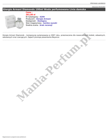 Informacje o produkcie Utworzono 04-03-2017 Giorgio Armani Diamonds 100ml Woda perfumowana Linia damska Cena : 261,00 zł Nr katalogowy : 6209 Producent : Giorgio Armani Dostępność : Dostępny Stan magazynowy : bardzo wysoki Średnia ocena : brak recenzji M an ia -P er f um .p l Giorgio Armani Diamonds – kompozycja wylansowana w 2007 roku, przeznaczona dla nowoczesnych kobiet, odważnych, seksownych oraz czarujących. Zapach promuje piosenkarka Beyonce. Wygenerowano w programie www.oscGold.com