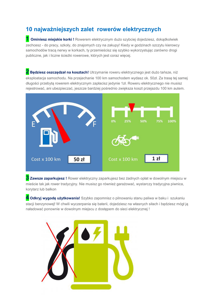 10 najważniejszych zalet rowerów elektrycznych 1 Ominiesz miejskie korki ! Rowerem elektrycznym dużo szybciej dojedziesz, dokądkolwiek zechcesz - do pracy, szkoły, do znajomych czy na zakupy! Kiedy w godzinach szczytu kierowcy samochodów tracą nerwy w korkach, ty przemieścisz się szybko wykorzystując zarówno drogi publiczne, jak i liczne ścieżki rowerowe, których jest coraz więcej. 2 Będziesz oszczędzał na kosztach! Utrzymanie roweru elektrycznego jest dużo tańsze, niż eksploatacja samochodu. Na przejechanie 100 km samochodem wydasz ok. 50zł. Za trasę tej samej długości przebytą rowerem elektrycznym zapłacisz jedynie 1zł. Roweru elektrycznego nie musisz rejestrować, ani ubezpieczać, jeszcze bardziej pośrednio zwiększa koszt przejazdu 100 km autem. 3 Zawsze zaparkujesz ! Rower elektryczny zaparkujesz bez żadnych opłat w dowolnym miejscu w mieście tak jak rower tradycyjny. Nie musisz go również garażować, wystarczy tradycyjna piwnica, korytarz lub balkon 4 Odkryj wygodę użytkowania! Szybko zapomnisz o pilnowaniu stanu paliwa w baku i szukaniu stacji benzynowej! W chwili wyczerpania się baterii, dojedziesz na własnych siłach i będziesz mógł ją naładować ponownie w dowolnym miejscu z dostępem do sieci elektrycznej ! 5 Bądź Eko! Używając pojazdu elektrycznego przyłączysz się aktywnie do walki o ochronę środowiska naturalnego, aby oddychać świeżym powietrzem ! Przyczynisz się do redukcji poziomu dwutlenku węgla i emisji szkodliwych spalin samochodowych w Twoim mieście! Żaden inny pojazd mechaniczny nie jest tak ekologiczny jak rower elektryczny!! 6 Żyj zdrowo ! Poprawisz swoją kondycję fizyczną i zdrowie dodając, do typowego siedzącego trybu życia, więcej aktywności ruchowej na świeżym powietrzu. Twój organizm szybko Ci za to podziękuję dobrym samopoczuciem i zdrowiem. 7 Dojazdy bez potu, wysiłku i przebierania ! Nawet w czasie największego upału dojedziesz do pracy, szkoły, na zakupy, bez nadmiernego potu i wysiłku ubrany jak do pracy i będziesz wyglądał, jak właściciel klimatyzowanej limuzyny. 8 Rehabilitacja ! Jazda ze wspomaganiem jest bardzo pomocna przy problemach kardiologicznych i schorzeniach układu ruchu. Może skutecznie wesprzeć procesy regeneracji i rekonwalescencji po urazach i kontuzjach, a nawet po operacjach ortopedycznych lub kardiologicznych. 9 Wspinaj się bez ograniczeń ! Dobry e-bike skutecznie spłaszcza wzgórza i podjazdy. Wspomagając silnik lekkim pedałowaniem łatwo pokonasz duże wzniesienia. Takie uczucie wsparcia jest cudowne. 10 Zadbaj o kondycję ! Badania przeprowadzone w innych krajach wykazały że korzystamy z elektrycznego roweru kilkukrotnie częściej niż przeciętny rowerzysta jeżdżący tradycyjnym rowerem. Pedałując ze wspomaganiem istotnie poprawiamy swoją kondycję. Częstsze i regularne ćwiczenia na niższym obciążeniu są zawsze zdrowsze od tych forsownych ale okazjonalnych.