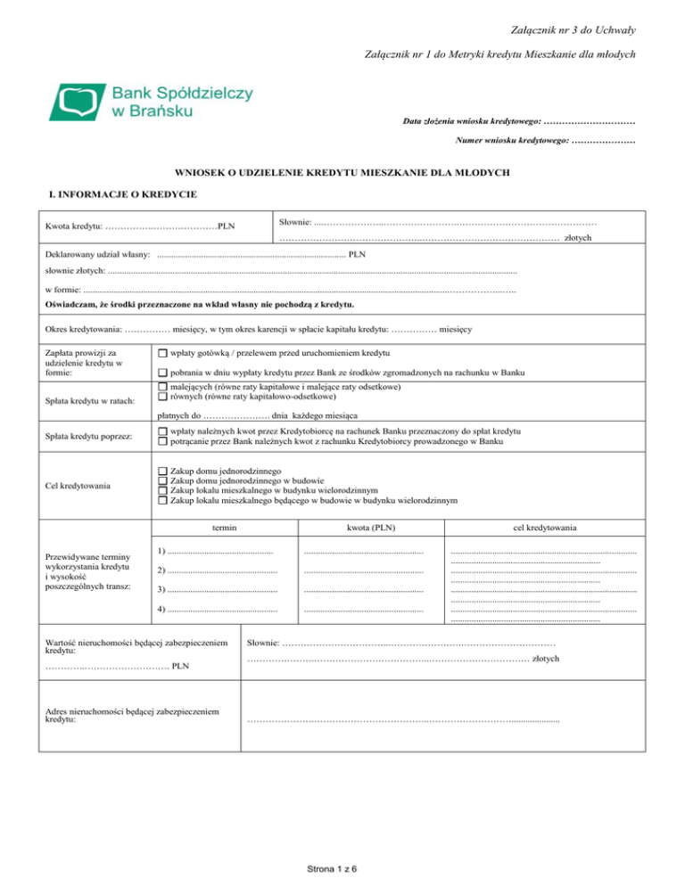 Załącznik nr 3 do Uchwały Załącznik nr 1 do Metryki kredytu Mieszkanie dla młodych Data złożenia wniosku kredytowego: ………………………… Numer wniosku kredytowego: ………………… WNIOSEK O UDZIELENIE KREDYTU MIESZKANIE DLA MŁODYCH I. INFORMACJE O KREDYCIE Słownie: ....………………..…………………….……………………………………… Kwota kredytu: …………….…………………PLN ………………………………………..……………………………………… złotych Deklarowany udział własny: .................................................................................. PLN słownie złotych: .................................................................................................................................................................................. w formie: ...............................................................................................................................................................……………...….. Oświadczam, że środki przeznaczone na wkład własny nie pochodzą z kredytu. Okres kredytowania: …………… miesięcy, w tym okres karencji w spłacie kapitału kredytu: …………… miesięcy Zapłata prowizji za udzielenie kredytu w formie: Spłata kredytu w ratach: wpłaty gotówką / przelewem przed uruchomieniem kredytu pobrania w dniu wypłaty kredytu przez Bank ze środków zgromadzonych na rachunku w Banku malejących (równe raty kapitałowe i malejące raty odsetkowe) równych (równe raty kapitałowo-odsetkowe) płatnych do …………………. dnia każdego miesiąca Spłata kredytu poprzez: wpłaty należnych kwot przez Kredytobiorcę na rachunek Banku przeznaczony do spłat kredytu potrącanie przez Bank należnych kwot z rachunku Kredytobiorcy prowadzonego w Banku Cel kredytowania Zakup domu jednorodzinnego Zakup domu jednorodzinnego w budowie Zakup lokalu mieszkalnego w budynku wielorodzinnym Zakup lokalu mieszkalnego będącego w budowie w budynku wielorodzinnym termin Przewidywane terminy wykorzystania kredytu i wysokość poszczególnych transz: kwota (PLN) 1) .............................................. .................................................... 2) ................................................ .................................................... 3) ................................................ .................................................... 4) ................................................ .................................................... Wartość nieruchomości będącej zabezpieczeniem kredytu: ………….………………………. PLN Adres nieruchomości będącej zabezpieczeniem kredytu: cel kredytowania ................................................................................. ................................................................. ................................................................................. ................................................................. ................................................................................. ................................................................. ................................................................................. ................................................................. Słownie: ……………………………..…………………….………………………… ………………….………………………………..…………………………… złotych ………………….………………………………..………………………..................... Strona 1 z 6 Prawne zabezpieczenie spłaty kredytu: pierwsza hipoteka na nieruchomości weksel in blanco wystawiony przez Kredytobiorcę na rzecz Banku wraz z deklaracją wekslową; weksel własny in blanco wystawiony przez Kredytobiorcę na rzecz BGK wraz z deklaracją wekslową; przelew praw (cesja) z umowy ubezpieczenia nieruchomości od ognia i innych zdarzeń losowych w ramach oferty dostępnej w Banku* / oferty poza Bankiem* wskazanie Banku jako uposażonego na wypadek śmierci w umowie ubezpieczenia na życie w ramach oferty dostępnej w Banku* / oferty poza Bankiem* pełnomocnictwo do dysponowania środkami na rachunku bankowym,* Do czasu ustanowienia hipoteki: poręczenie wg prawa cywilnego,* kaucja pieniężna,* blokada środków pieniężnych na rachunku bankowym,* brak – podwyższenie marży II. INFORMACJE O WNIOSKODAWCACH Wnioskodawca I Wnioskodawca II Imiona Nazwisko Imiona rodziców Nazwisko rodowe Nazwisko rodowe matki PESEL Stan cywilny zamężna/żonaty panna/kawaler separacja Małżeńska wspólnota majątkowa tak Cechy dokumentu tożsamości Adres zamieszkania Adres do korespondencji Nr telefonu (do wyboru) nie wdowa/wdowiec rozwiedziona/y nie dotyczy zamężna/żonaty panna/kawaler separacja tak nie wdowa/wdowiec rozwiedziona/y nie dotyczy Nazwa: ………………………………………. Nazwa: ……………………….………………. Seria……………………………………… Seria…………………………….………… Nr dokumentu: …………….………………… Nr dokumentu: ………….…….……………… Wydany przez: ................................................ Wydany przez: ................................................. Ulica: …………………….…………………. Ulica: ………………………………………... Nr domu: ……………….…………………….. Nr domu: ……………………………………. Nr lokalu…………….……………………… Nr lokalu: ……………….…………………… Kod: ………………………………………... Kod: ……………………….………………… Miejscowość: ……………….……………… Miejscowość………………….……………... Kraj: ………………………………………... Kraj:.……