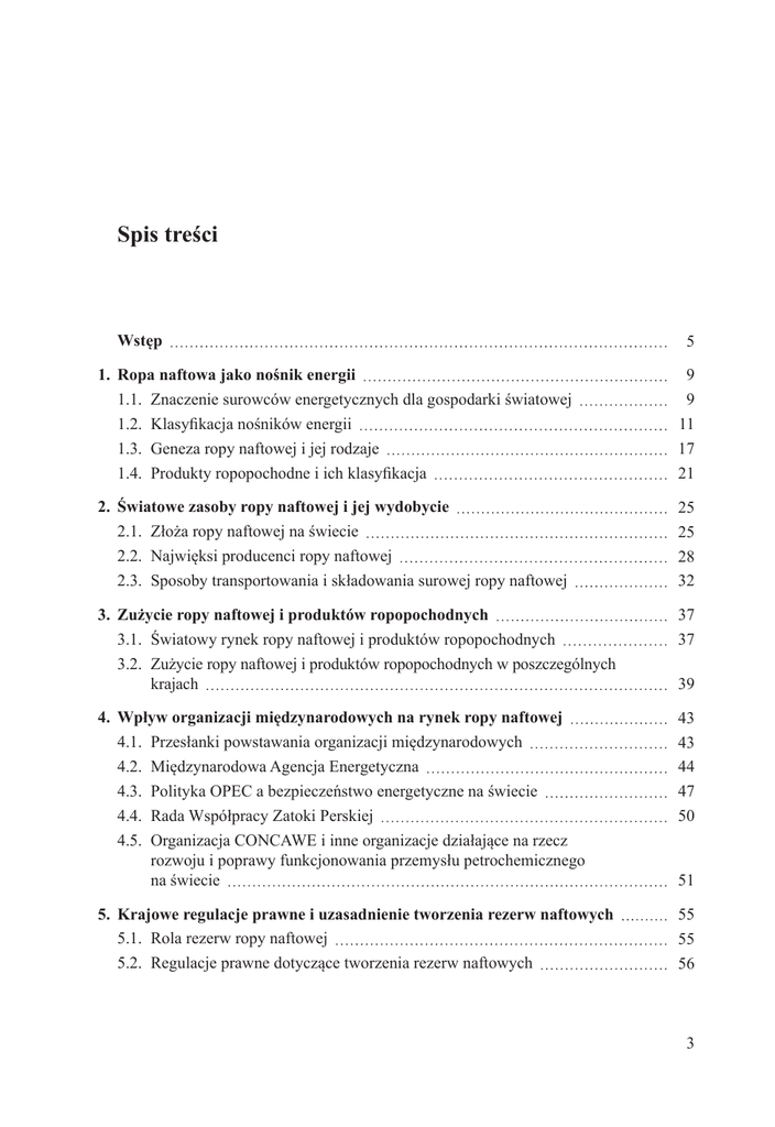 Spis treści Wstęp 5 1. Ropa naftowa jako nośnik energii 1.1. Znaczenie surowców energetycznych dla gospodarki światowej 1.2. Klasyfikacja nośników energii 1.3. Geneza ropy naftowej i jej rodzaje 1.4. Produkty ropopochodne i ich klasyfikacja 9 9 11 17 21 2. Światowe zasoby ropy naftowej i jej wydobycie 2.1. Złoża ropy naftowej na świecie 2.2. Najwięksi producenci ropy naftowej 2.3. Sposoby transportowania i składowania surowej ropy naftowej 25 25 28 32 3. Zużycie ropy naftowej i produktów ropopochodnych 3.1. Światowy rynek ropy naftowej i produktów ropopochodnych 3.2. Z użycie ropy naftowej i produktów ropopochodnych w poszczególnych krajach 37 37 4. Wpływ organizacji międzynarodowych na rynek ropy naftowej 4.1. Przesłanki powstawania organizacji międzynarodowych 4.2. Międzynarodowa Agencja Energetyczna 4.3. Polityka OPEC a bezpieczeństwo energetyczne na świecie 4.4. Rada Współpracy Zatoki Perskiej 4.5. Organizacja CONCAWE i inne organizacje działające na rzecz rozwoju i poprawy funkcjonowania przemysłu petrochemicznego na świecie 43 43 44 47 50 5. Krajowe regulacje prawne i uzasadnienie tworzenia rezerw naftowych 5.1. Rola rezerw ropy naftowej 5.2. Regulacje prawne dotyczące tworzenia rezerw naftowych 55 55 56 39 51 3 5.3. Wpływ regulacji prawnych na rozwój polityki energetycznej w Polsce 5.3.1. Regulacje prawne w polskim sektorze energetycznym i naftowym 5.3.2. Kierunek polityki energetycznej w Polsce 5.3.3. Restrukturyzacja krajowego przemysłu naftowego 57 58 60 62 6. Strategiczne rezerwy ropy naftowej i produktów ropopochodnych 6.1. Zależność energetyczna a rezerwy naftowe 6.2.Rezerwy naftowe w krajach członkowskich Międzynarodowej Agencji Energetycznej 6.2.1.Podstawy tworzenia rezerw ropy naftowej i produktów ropopochodnych 6.2.2.Przykłady wykorzystania rezerw naftowych Międzynarodowej Agencji Energetycznej 6.3. Rezerwy naftowe Unii Europejskiej 6.4. Rodzaje rezerw naftowych w krajach OECD 6.4.1. Rezerwy naftowe w regionach OECD 6.4.2. Przemysłowe rezerwy ropy i produktów naftowych 6.5. Rezerwy naftowe w poszczególnych krajach 66 66 7. Wpływ wydobycia i wykorzystania ropy na środowisko naturalne 7.1. Ropa naftowa a zagrożenia dla środowiska naturalnego 7.2.Katastrofy ekologiczne i klęski żywiołowe spowodowane przez światowy przemysł naftowy 7.3.Regulacje prawne dotyczące funkcjonowania sektora energetyczno-paliwowego a ochrona środowiska 7.4. Rynek emisji zanieczyszczeń w odniesieniu do sektora energetycznego 85 85 8. Sektor petrochemiczny w Polsce 8.1. Przedsiębiorstwa petrochemiczne w Polsce 8.2. Struktura krajowego sektora petrochemicznego 96 96 97 70 70 72 73 74 74 78 81 89 90 93 Podsumowanie 108 Bibliografia 111