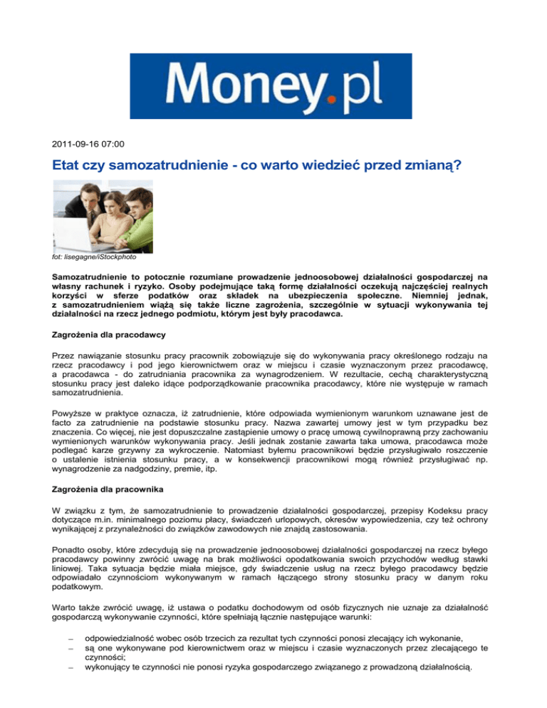 2011-09-16 07:00 Etat czy samozatrudnienie - co warto wiedzieć przed zmianą? fot: lisegagne/iStockphoto Samozatrudnienie to potocznie rozumiane prowadzenie jednoosobowej działalności gospodarczej na własny rachunek i ryzyko. Osoby podejmujące taką formę działalności oczekują najczęściej realnych korzyści w sferze podatków oraz składek na ubezpieczenia społeczne. Niemniej jednak, z samozatrudnieniem wiążą się także liczne zagrożenia, szczególnie w sytuacji wykonywania tej działalności na rzecz jednego podmiotu, którym jest były pracodawca. Zagrożenia dla pracodawcy Przez nawiązanie stosunku pracy pracownik zobowiązuje się do wykonywania pracy określonego rodzaju na rzecz pracodawcy i pod jego kierownictwem oraz w miejscu i czasie wyznaczonym przez pracodawcę, a pracodawca - do zatrudniania pracownika za wynagrodzeniem. W rezultacie, cechą charakterystyczną stosunku pracy jest daleko idące podporządkowanie pracownika pracodawcy, które nie występuje w ramach samozatrudnienia. Powyższe w praktyce oznacza, iż zatrudnienie, które odpowiada wymienionym warunkom uznawane jest de facto za zatrudnienie na podstawie stosunku pracy. Nazwa zawartej umowy jest w tym przypadku bez znaczenia. Co więcej, nie jest dopuszczalne zastąpienie umowy o pracę umową cywilnoprawną przy zachowaniu wymienionych warunków wykonywania pracy. Jeśli jednak zostanie zawarta taka umowa, pracodawca może podlegać karze grzywny za wykroczenie. Natomiast byłemu pracownikowi będzie przysługiwało roszczenie o ustalenie istnienia stosunku pracy, a w konsekwencji pracownikowi mogą również przysługiwać np. wynagrodzenie za nadgodziny, premie, itp. Zagrożenia dla pracownika W związku z tym, że samozatrudnienie to prowadzenie działalności gospodarczej, przepisy Kodeksu pracy dotyczące m.in. minimalnego poziomu płacy, świadczeń urlopowych, okresów wypowiedzenia, czy też ochrony wynikającej z przynależności do związków zawodowych nie znajdą zastosowania. Ponadto osoby, które zdecydują się na prowadzenie jednoosobowej działalności gospodarczej na rzecz byłego pracodawcy powinny zwrócić uwagę na brak możliwości opodatkowania swoich przychodów według stawki liniowej. Taka sytuacja będzie miała miejsce, gdy świadczenie usług na rzecz byłego pracodawcy będzie odpowiadało czynnościom wykonywanym w ramach łączącego strony stosunku pracy w danym roku podatkowym. Warto także zwrócić uwagę, iż ustawa o podatku dochodowym od osób fizycznych nie uznaje za działalność gospodarczą wykonywanie czynności, które spełniają łącznie następujące warunki: odpowiedzialność wobec osób trzecich za rezultat tych czynności ponosi zlecający ich wykonanie, są one wykonywane pod kierownictwem oraz w miejscu i czasie wyznaczonych przez zlecającego te czynności; wykonujący te czynności nie ponosi ryzyka gospodarczego związanego z prowadzoną działalnością. Jeśli więc stosunek prawny zawarty między samozatrudnionym a byłym pracodawcą charakteryzuje się daleko idącym podporządkowaniem, przychody osiągnięte w ramach działalności gospodarczej będą musiały być opodatkowane według skali. Ponadto, osoba taka utraci możliwości ujmowania swoich wydatków jako kosztów uzyskania przychodów. Działalność gospodarcza prowadzona na rzecz byłego pracodawcy rodzi również konsekwencje w zakresie składek na ubezpieczenia społeczne. Osoba podejmująca taką działalność nie będzie bowiem uprawniona do skorzystania z możliwości odprowadzania niższych składek w okresie pierwszych dwóch lat od jej rozpoczęcia. Ograniczenie to dotyczy wyłącznie sytuacji gdy samozatrudniony przed dniem rozpoczęcia działalności, w bieżącym lub poprzednim roku kalendarzowym, wykonywał w ramach stosunku pracy czynności wchodzące w zakres aktualnie prowadzonej działalności. Łukasz Jedynak - associate w kancelarii KSP Legal and Tax Advice