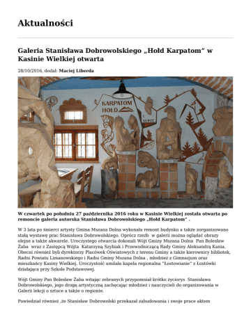 Aktualności Galeria Stanisława Dobrowolskiego „Hołd Karpatom” w Kasinie Wielkiej otwarta 28/10/2016, dodał: Maciej Liberda W czwartek po południu 27 października 2016 roku w Kasinie Wielkiej została otwarta po remoncie galeria autorska Stanisława Dobrowolskiego „Hołd Karpatom” . W 3 lata po śmierci artysty Gmina Mszana Dolna wykonała remont budynku a także zorganizowano stałą wystawę prac Stanisława Dobrowolskiego. Oprócz rzeźb w galerii można oglądać obrazy olejne a także akwarele. Uroczystego otwarcia dokonali Wójt Gminy Mszana Dolna Pan Bolesław Żaba wraz z Zastępcą Wójta Katarzyną Szybiak i Przewodniczącą Rady Gminy Aleksandrą Kania. Obecni również byli dyrektorzy Placówek Oświatowych z terenu Gminy a także kierownicy bibliotek, Radni Powiatu Limanowskiego i Radni Gminy Mszana Dolna , młodzież z Gimnazjum oraz mieszkańcy Kasiny Wielkiej. Uroczystość umilała kapela regionalna ”Łostowianie” z Łostówki działająca przy Szkole Podstawowej. Wójt Gminy Pan Bolesław Żaba witając zebranych przypomniał krótko życiorys Stanisława Dobrowolskiego, jego drogę artystyczną zachęcając młodzież i nauczycieli do organizowania w Galerii lekcji o sztuce a także o regionie. Powiedział również ,że Stanisław Dobrowolski przekazał zabudowania i swoje prace aktem notarialnym w dniu 16 października 2009 roku na rzecz Urzędu Gminy w Mszanie Dolnej. Akt notarialny zobowiązywał Gminę Mszana Dolna do prowadzenia Galerii co było życzeniem darczyńcy. Dzisiaj przeszło trzy lata po śmierci artysty udało się doprowadzić do jej otwarcia i udostępnić do zwiedzania. Mamy nadzieję ,że Galeria będzie służyć przede wszystkim młodzieży z terenu naszej Gminy, że będzie odwiedzana, a poza stałą wystawą artysty będą tutaj działy się różnego rodzaju wydarzenia artystyczne związane z twórczością nie tylko Stanisława Dobrowolskiego ale także innych naszych artystów oraz wydarzenia kulturalne promujące nasz piękny i bogaty region górali zagórzańskich. Przypominamy krótki życiorys artysty: Stanisław Dobrowolski – ur. 23 marca 1927 r. W Mszanie Dolnej- Słomce- zmarł 2 maja 2013 roku w Domu Pomocy Społecznej w Szczyrzycu. Absolwent Akademii Sztuk Pięknych w Warszawie w latach 1950-1955 r. Stanisław Dobrowolski urodził się w rodzinie chłopskiej ojciec jego był gajowym w majątku hrabiny Krasińskiej , matka osierociła go w 3 miesiącu a ojciec w 13 roku jego życia, dlatego też wychował się w bardzo trudnych warunkach w okresie II wojny światowej ,wychowywany przez starsze rodzeństwo i przyrodnich braci w sumie w domu było ich 7-mioro rodzeństwa z trzech małżeństw ojca. Już jako dziecko pasał bydło zajmując się również pracami polowymi czasem ponad swoje siły a także służył u innych gospodarzy zarabiając na swoje utrzymanie. Ciężkie czasy panujące w tym okresie tzw. “bieda galicyjska ” nie pozwoliła mu ukończyć szkoły podstawowej bo aby przeżyć musiał pracować. Od dziecka przejawiał zainteresowanie rzeźbą i rysunkiem obserwując ludzi a głównie piękno natury i zjawiska przyrody zdobywając z ich obserwacji wiele doświadczeń, które wpływają na jego postawę i osobowość a także po części dalsze jego życie. Przy użyciu prostych narzędzi scyzoryka i kredek wykonuje swoje pierwsze prace. Jego zdolności zauważa architekt z Rabki Rzepecki, który pomaga mu dostać się do Gimnazjum Rzeźbiarskiego w Zakopanym pobyt w w/w Gimnazjum zawdzięcza również prof. Leonowi Machowskiemu znanemu artyście rzeźbiarzowi a zarazem dyrektorowi tego Gimnazjum. W 1949 r, Dobrowolski zostaje przyjęty jednak jego przygoda z tą szkołą trwała tylko trzy lata. Za swoje poglądy polityczne zostaje zwolniony dyr. Machowski a wraz z nim władza ludowa usuwa siedmiu jego uczniów w tym Stanisława Dobrowolskiego, który później był wielokrotnie przesłuchiwany przez bezpiekę i nie mógł dalej kontynuować nauki. Były wychowawca i nauczyciel widząc rozwijający się talent Dobrowolskiego zabiera go do Warszawy dając mu u siebie mieszkanie i pracę. Marzeniem jego było studiować na Akademii Sztuk Pięknych co mimo braku matury udaje się mu zrealizować w 1950 roku zdając egzamin z wyróżnieniem przyjęty zostaje na wydział ogólny ASP jako wolny słuchacz ,otrzymuje stypendium co pozwala mu na utrzymanie się w Warszawie. Studiuje jako wolny słuchacz na dziennych studiach a wieczorem uzupełnia swoje średnie wykształcenie na kursach dokształcających, których jednak nie dokończył. Na studiach interesuje się szczególnie malarstwem i rzeźbą w których przejawia szczególne uzdolnienia, interesuje się również historią i historią sztuki. Mimo wielu trudności życiowych a przede wszystkim ze względu na ciężkie warunki materialne zalicza jednak wszystkie kolokwia i egzaminy z zakresu całego programu jaki uczelnia postawiła przed swoimi studentami. Jest najsłynniejszym “waletem” Warszawy podczas studiów nocując bardzo często w poczekalniach dworcowych i parkach. W 1956 roku otrzymuje dyplom ukończenia ASP z nr. 92 z tytułem Artysta -Rzeźbiarz. Po studiach pracuje w Państwowym Przedsiębiorstwie Konserwacji i Ochrony Zabytków w Warszawie , przy renowacji Łazienek, Wilanowa a także jako animator w Wytwórni Filmów Rysunkowych dla dzieci. Twarda góralska natura i uparty charakter nie pozwolił zapomnieć o swoich ukochanych górach, wielka tęsknota za nimi nie pozwoliła mu dłużej pozostawać w dużym mieście chociaż kusiło ono i dobrą pracą jak też karierą. Wraca do rodzinnych stron zamieniając wygodne życie na przepiękne krajobrazy Gorców i Beskidu Wyspowego . Z dala od zgiełku dużego miasta na nowo rozpoczyna kolejną swoją drogę artystyczną dopracowując się swojego stylu do którego inspirację czerpie z kontaktu z przyrodą i górami. Kupuje stare zabudowania w Kasinie Wielkiej gdzie po małym remo