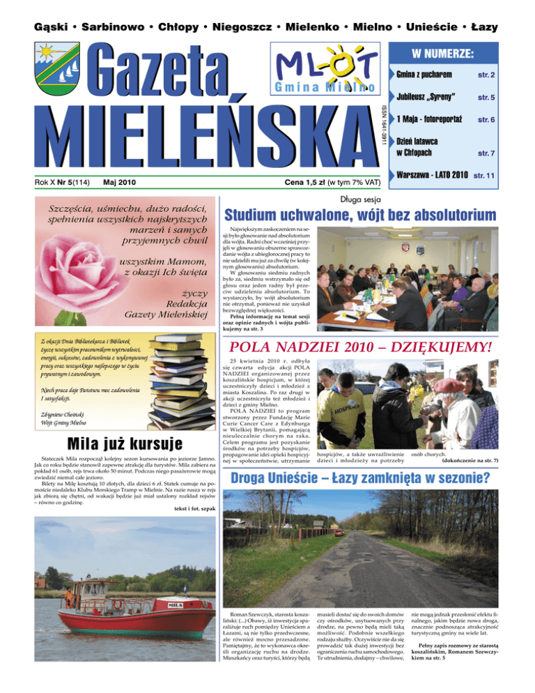 1 Maj 2010 Długa sesja Studium uchwalone, wójt bez absolutorium Największym zaskoczeniem na sesji było głosowanie nad absolutorium dla wójta. Radni choć wcześniej przyjęli w głosowaniu obszerne sprawozdanie wójta z ubiegłorocznej pracy to nie udzielili mu już za chwilę (w kolejnym głosowaniu) absolutorium. W głosowaniu siedmiu radnych było za, siedmiu wstrzymało się od głosu oraz jeden radny był przeciw udzieleniu absolutorium. To wystarczyło, by wójt absolutorium nie otrzymał, ponieważ nie uzyskał bezwzględnej większości. Pełną informację na temat sesji oraz opinie radnych i wójta publikujemy na str. 3 POLA NADZIEI 2010 – DZIĘKUJEMY! Mila już kursuje Stateczek Mila rozpoczął kolejny sezon kursowania po jeziorze Jamno. Jak co roku będzie stanowił zapewne atrakcję dla turystów. Mila zabiera na pokład 61 osób, rejs trwa około 50 minut. Podczas niego pasażerowie mogą zwiedzić niemal całe jezioro. Bilety na Milę kosztują 10 złotych, dla dzieci 6 zł. Statek cumuje na pomoście niedaleko Klubu Morskiego Tramp w Mielnie. Na razie rusza w rejs jak zbiorą się chętni, od wakacji będzie już miał ustalony rozkład rejsów – równo co godzinę. tekst i fot. szpak 25 kwietnia 2010 r. odbyła się czwarta edycja akcji POLA NADZIEI organizowanej przez koszalińskie hospicjum, w której uczestniczyły dzieci i młodzież z miasta Koszalina. Po raz drugi w akcji uczestniczyła też młodzież i dzieci z gminy Mielno. POLA NADZIEI to program stworzony przez Fundację Marie Curie Cancer Care z Edynburga w Wielkiej Brytanii, pomagającą nieuleczalnie chorym na raka. Celem programu jest pozyskanie środków na potrzeby hospicjów, propagowanie idei opieki hospicyjnej w społeczeństwie, utrzymanie osób chorych. (dokończenie na str. 7) Droga Unieście – Łazy zamknięta w sezonie? Roman Szewczyk, starosta koszaliński: (...) Obawy, iż inwestycja sparaliżuje ruch pomiędzy Unieściem a Łazami, są nie tylko przedwczesne, ale również mocno przesadzone. Pamiętajmy, że to wykonawca określi organizację ruchu na drodze. Mieszkańcy oraz turyści, którzy będą www.mielno.pl hospicjów, a także uwrażliwienie dzieci i młodzieży na potrzeby musieli dostać się do swoich domów czy ośrodków, usytuowanych przy drodze, na pewno będą mieli taką możliwość. Podobnie wszelkiego rodzaju służby. Oczywiście nie da się prowadzić tak dużej inwestycji bez ograniczenia ruchu samochodowego. Te utrudnienia, dodajmy – chwilowe, nie mogą jednak przesłonić efektu finalnego, jakim będzie nowa droga, znacznie podnosząca atrakcyjność turystyczną gminy na wiele lat. Pełny zapis rozmowy ze starostą koszalińskim, Romanem Szewczykiem na str. 5