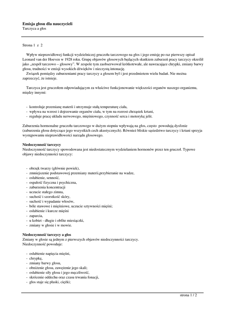 Emisja głosu dla nauczycieli Tarczyca a głos Strona 1 z 2 Wpływ nieprawidłowej funkcji wydzielniczej gruczołu tarczowego na głos i jego emisję po raz pierwszy opisał Leonard van der Hoeven w 1928 roku. Grupę objawów głosowych będących skutkiem zaburzeń pracy tarczycy określił jako „zespół tarczowo – głosowy”. W zespole tym zaobserwował krótkotrwałe, ale nawracające chrypki, zmiany barwy głosu, trudności w emisji wysokich dźwięków i nieczystą intonację. Związek pomiędzy zaburzeniami pracy tarczycy a głosem był i jest przedmiotem wielu badań. Nie można zaprzeczyć, że istnieje. Tarczyca jest gruczołem odpowiadającym za właściwe funkcjonowanie większości organów naszego organizmu, między innymi: - kontroluje przemianę materii i utrzymuje stałą temperaturę ciała, - wpływa na wzrost i dojrzewanie organów ciała, w tym na rozrost chrząstek krtani, - reguluje pracę układu nerwowego, mięśniowego, czynność serca i motorykę jelit. Zaburzenia hormonalne gruczołu tarczowego w dużym stopniu wpływają na głos, często powodują dysfonie (zaburzenia głosu dotyczące jego wszystkich cech akustycznych). Również bliskie sąsiedztwo tarczycy i krtani sprzyja występowaniu nieprawidłowości narządu głosowego. Niedoczynność tarczycy Niedoczynność tarczycy spowodowana jest niedostatecznym wydzielaniem hormonów przez ten gruczoł. Typowe objawy niedoczynności tarczycy: - obrzęk twarzy (głównie powiek), zmniejszenie podstawowej przemiany materii,przybieranie na wadze, osłabienie, senność, ospałość fizyczna i psychiczna, zaburzenia koncentracji uczucie stałego zimna, suchość i szorstkość skóry, suchość i wypadanie włosów, bóle stawowe i mięśniowe, uczucie sztywności mięśni; osłabienie i kurcze mięśni zaparcia, u kobiet - długie i obfite miesiączki, zmiany w głosie i w mowie. Niedoczynność tarczycy a głos Zmiany w głosie są jednym z pierwszych objawów niedoczynności tarczycy. Niedoczynność powoduje: - osłabienie napięcia mięśni, chrypkę, zmiany barwy głosu, obniżenie głosu, zawężenie jego skali; osłabienie siły głosu i jego męczliwość, skrócenie oddechu oraz czasu trwania fonacji, głos staje się płaski, ciężki; strona 1 / 2 Emisja głosu dla nauczycieli Tarczyca a głos - uczucie ciała obcego w krtani, suchość błon śluzowych jamy ustnej, gardła i krtani; zaburzenia w precyzji artykulacyjnej, spowolnienie mowy, zaburzenia w modulacji głosu i monotonne mówienie. W niedoczynności tarczycy mogą wystąpić także czynnościowe zaburzenia głosu (głównie dysfonia hipofunkcjonalna). W badaniu fałdów głosowych stwierdza się ich pogrubienie. Może występować również obrzęk zwiększający masę fałdów głosowych oraz zmniejszenie ich drgań, niedowłady fałdów głosowych i niedomykalność głośni. «« start « poprz. 1 2 nast. » koniec »» strona 2 / 2