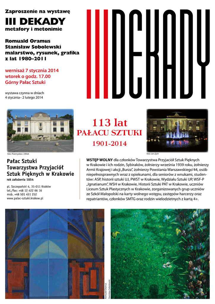 Zaproszenie na wystawę III DEKADY metafory i metonimie 112 lat PAŁACU SZTUKI 1901-2013 Romuald Oramus foto: Jan Zych foto: Przemysław J. Witek Stanisław Sobolewski malarstwo, rysunek, grafika WSTĘP WOLNY dla członków Towarzystwa Przyjaciół Sztuk Pięknych w Krakowie i ich rodzin, Sybiraków, żołnierzy września 1939 roku, żołnierzy z lat 1980–2011 wernisaż 7 stycznia 2014 wtorek o godz. 17.00 Górny Pałac Sztuki wystawa czynna w dniach 4 stycznia– 2 lutego 2014 Armii Krajowej i akcji „Burza”, żołnierzy Powstania Warszawskiego’44, osób niepełnosprawnych wraz z opiekunami, dla seniorów z wnukami, studentów: ASP, historii sztuki UJ, PWST w Krakowie, Wydziału Sztuki UP, WSF-P „Ignatianum”, WSH w Krakowie, Historii Sztuki PAT w Krakowie, uczniów Liceum Sztuk Plastycznych w Krakowie, zorganizowanych grup uczniów ze Szkół Małopolski na karty wolnego wstępu, zastępów harcerzy oraz repatriantów, członków SMTG oraz rodzin wielodzietnych z kartą 4+. 112 113 lat PAŁACU SZTUKI 1901-2013 1901-2014 foto: Jan Zych foto: Przemysław J. Witek Stanisław Sobolewski Romuald Oramus WSTĘP WOLNY dla członków Towarzystwa Przyjaciół Sztuk Pięknych w Krakowie i ich rodzin, Sybiraków, żołnierzy września 1939 roku, żołnierzy Armii Krajowej i akcji „Burza”, żołnierzy Powstania Warszawskiego’44, osób niepełnosprawnych wraz z opiekunami, dla seniorów z wnukami, studentów: ASP, historii sztuki UJ, PWST w Krakowie, Wydziału Sztuki UP, WSF-P „Ignatianum”, WSH w Krakowie, Historii Sztuki PAT w Krakowie, uczniów Liceum Sztuk Plastycznych w Krakowie, zorganizowanych grup uczniów ze Szkół Małopolski na karty wolnego wstępu, zastępów harcerzy oraz repatriantów, członków SMTG oraz rodzin wielodzietnych z kartą 4+. Zbigniew Kazimierz Witek Prezes Towarzystwa Przyjaciół Sztuk Pięknych w Krakowie Ewa Sadowska i Iwona Siwek-Front Public Relations mają zaszczyt zaprosić na wystawę wernisaż 7 stycznia 2014 wtorek o godz. 17.00 Górny Pałac Sztuki godziny otwarcia: poniedziałek – piątek 8.15–18.00; sobota – niedziela 10.00–18.00 III DEKADY metafory i metonimie Romuald Oramus, Stanisław Sobolewski malarstwo, rysunek, grafika z lat 1980–2011 Wystawa obejmuje prace z trzydziestu lat twórczości dwóch krakowskich malarzy związanych z nurtem kultury niezależnej w latach 80. ubiegłego wieku. Stylistycznie zróżnicowany dialog pokoleniowych postaw jest przypomnieniem początków ich twórczości oraz etapów kolejnych przemian indywidualnych środków wyrazu. Trzy dekady miały już swe kolejne odsłony w Miejskiej Galerii Sztuki w Częstochowie (2012) i Galerii Miejskiej bwa w Bydgoszczy (2013), za każdym razem będące różnymi pokazami prac obu artystów. Obecna jest próbą syntezy tych prezentacji. Całości towarzyszy publikacja: Trzy dekady: 1981–2011. Malarstwo wobec przemian – na przykładzie twórczości Romualda Oramusa i Stanisława Sobolewskiego, zawierająca teksty historyków sztuki: prof. Renaty Rogozińskiej (ASP Poznań), prof. Tomasza Gryglewicza (UJ Kraków) oraz Jerzego Brukwickiego, animatora Ruchu Kultury Niezależnej i kuratora wielu wystaw problemowych. Romuald Oramus urodził się w 1953 r. w Krakowie. Studiował na Wydziale Malarstwa krakowskiej Akademii Sztuk Pięknych (1974–1979). Dyplom przygotował w pracowni prof. Adama Marczyńskiego wraz z aneksem graficznym w pracowni prof. Mieczysława Wejmana. Należy do Związku Polskich Artystów Plastyków (od 1981). Uprawia malarstwo sztalugowe oraz grafikę warsztatową. Wykłada malarstwo i rysunek na Wydziale Sztuki w krakowskim Uniwersytecie Pedagogicznym. Stanisław Sobolewski urodził się w 1952 r. w Krakowie. Studiował na Wydziale Filologicznym Uniwersytetu Jagiellońskiego (1971–1976) i na Wydziale Malarstwa Akademii Sztuk Pięknych w Krakowie w pracowni prof. Zbigniewa Grzybowskiego (1974–1979). W latach 1989–1990 stażysta u prof. Stefana Gierowskiego. Uprawia malarstwo sztalugowe, członek Związku Polskich Artystów Plastyków (od 1980). Od 1979 r. związany z obecnym Uniwersytetem Pedagogicznym w Krakowie, gdzie na Wydziale Sztuki wykłada malarstwo i rysunek. patronat patronatmedialny medialny Wystawa współfinansowana przez Uniwersytet Pedagogiczny w Krakowie