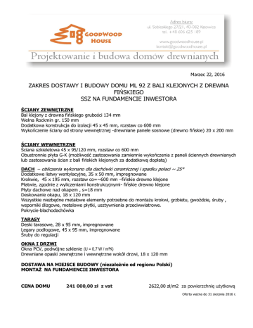 Marzec 22, 2016 ZAKRES DOSTAWY I BUDOWY DOMU ML 92 Z BALI KLEJONYCH Z DREWNA FIŃSKIEGO SSZ NA FUNDAMENCIE INWESTORA ŚCIANY ZEWNĘTRZNE Bal klejony z drewna fińskiego grubości 134 mm Wełna Rockmin gr. 150 mm Dodatkowa konstrukcja do izolacji 45 x 45 mm, rozstaw co 600 mm Wykończenie ściany od strony wewnętrznej -drewniane panele sosnowe (drewno fińskie) 20 x 200 mm ŚCIANY WEWNĘTRZNE Ściana szkieletowa 45 x 95/120 mm, rozstaw co 600 mm Obustronnie płyta G-K (możliwość zastosowania zamiennie wykończenia z paneli ściennych drewnianych lub zastosowania ścian z bali fińskich klejonych za dodatkową dopłatą) DACH – obliczenia wykonano dla dachówki ceramicznej i spadku połaci ~ 25° Dodatkowe listwy wentylacyjne, 35 x 50 mm, impregnowane Krokwie, 45 x 195 mm, rozstaw co=~600 mm –fińskie drewno klejone Płatwie, zgodnie z wyliczeniami konstrukcyjnymi- fińskie drewno klejone Płyty dachowe nad okapem , s=18 mm Deskowanie okapu, 18 x 120 mm Wszystkie niezbędne metalowe elementy potrzebne do montażu krokwi, grzbietu, gwoździe, śruby , wsporniki ślizgowe, metalowe płytki, usztywnienia przeciwwiatrowe. Pokrycie-blachodachówka TARASY Deski tarasowe, 28 x 95 mm, impregnowane Legary podłogowe, 45 x 95 mm, impregnowane Śruby do regulacji OKNA I DRZWI Okna PCV, podwójne szklenie (U = 0,7 W / m²K) Drewniane opaski zewnętrzne i wewnętrzne wokół drzwi, 18 x 120 mm DOSTAWA NA MIEJSCE BUDOWY (niezależnie od regionu Polski) MONTAŻ NA FUNDAMENCIE INWESTORA CENA DOMU 241 000,00 zł z vat 2622,00 zł/m2 za powierzchnię użytkową Oferta ważna do 31 sierpnia 2016 r.