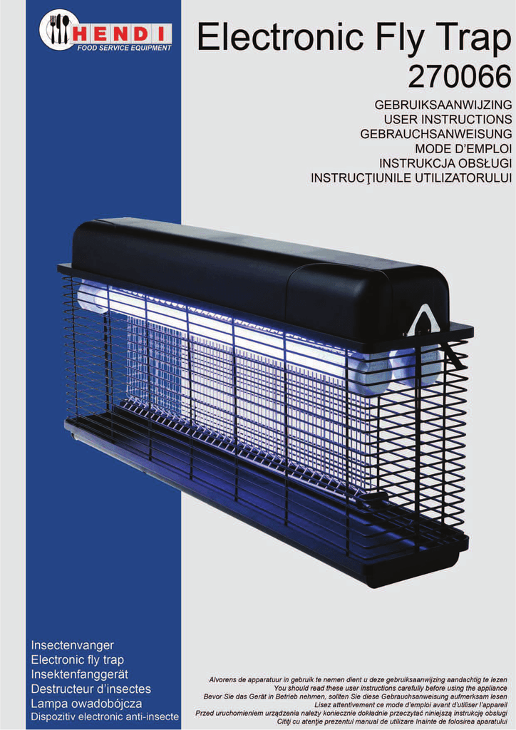 Bewaar deze handleiding bij het apparaat. Keep these instructions with the appliance. Diese Gebrauchsanweisung bitte beim Gerät aufbewahren. Gardez ces instructions avec cet appareil. =DFKRZDMLQVWUXNFMĊXU]ąG]HQLD. 3ăVWUDĠLPDXDOXOGHXWLOL]DUHDOăWXULGHDSDUDW. Voor gebruik binnenshuis en buitenshuis. For indoor and outdoor use. Zur Verwendung im Innen und Aussenbereich. Pour l'usage d'intérieur et d’extérieur. Do stosowania ZHZQąWU]LQD]HZQąWU]budynku 3HQWUXX]GHLQWHULRUúLGHH[WHULRU GEBRUIKSAANWIJZING USER INSTRUCTIONS GEBRAUCHSANWEISUNG MODE D’EMPLOI ,16758.&-$2%6à8*, ,16758&ğ,81,/(87,/,=$7258/8, Afbeeldingen / Images / Bilder / Images / =GMĊFLD/ Imagini 1 2 3 4 5 6 7 8 Nederlands Geachte klant, Hartelijk dank voor de aankoop van dit Hendi apparaat. Leest u deze gebruiksaanwijzing zorgvuldig voordat u het apparaat aansluit, dit om schade door verkeerd gebruik te voorkomen. Lees vooral de veiligheidsvoorschriften aandachtig door. Veiligheidsvoorschriften x Onjuiste bediening en verkeerd gebruik van het apparaat kan ernstige schade aan het apparaat en verwonding van personen tot gevolg hebben. x Het apparaat mag alleen worden gebruikt voor het doel waarvoor het werd ontworpen. De fabrikant aanvaardt geen enkele aansprakelijkheid voor schade als gevolg van onjuiste bediening en verkeerd gebruik. x Zorg dat het apparaat en de stekker niet met water of een andere vloeistof in aanraking komt. Mocht het apparaat onverhoopt in het water vallen, trek dan onmiddellijk de stekker uit het stopcontact en laat het apparaat controleren door een erkend vakman. Niet-naleving hiervan kan levensgevaar opleveren. x Probeer nooit zelf de behuizing van het apparaat te openen. x Steek geen voorwerpen in de behuizing van het apparaat. x Raak de stekker niet met natte of vochtige handen aan. x Controleer stekker en snoer regelmatig op eventuele beschadiging. Indien stekker of snoer beschadigd is, laat het bij een erkend reparatiebedrijf repareren. x Gebruik het apparaat niet nadat het is gevallen of op andere wijze beschadigd is. Laat het bij een erkend reparatiebedrijf controleren en zo nodig repareren. x Probeer het apparaat niet zelf te repareren. Dit kan levensgevaar opleveren. x Zorg dat het snoer niet met scherpe of hete voorwerpen in aanraking komt en houd het uit de buurt van open vuur. Als u de stekker uit het stopcontact wilt trekken, pak dan altijd de stekker zelf beet en trek nooit aan het snoer. x Zorg dat niemand het snoer (of verlengsnoer) abusievelijk kan lostrekken of erover kan struikelen. x Houd het apparaat als u het gebruikt steeds in de gaten. x Kinderen zien de gevaren van onjuist gebruik van elektrische apparaten niet. Laat kinderen daarom nooit zonder toezicht met elektrische apparatuur werken. x Trek altijd de stekker uit het stopcontact als het apparaat niet wordt gebruikt en telkens voordat het wordt schoongemaakt. x Gevaar! Zo lang de stekker in het stopcontact zit, staat het apparaat onder de netspanning. x Schakel het apparaat uit voordat u de stekker uit het stopcontact trekt. x Draag het apparaat nooit aan het snoer. x Gebruik geen extra hulpmiddelen die niet bij het apparaat zijn meegeleverd. x Sluit het apparaat alleen aan op een stopcontact met de op het typeplaatje aangegeven spanning en frequentie. x Vermijd overbelasting. x Schakel de apparatuur na gebruik uit door de stekker uit het stopcontact te verwijderen. x Tijdens het bijvullen of schoonmaken altijd de stekker uit het stopcontact verwijderen. x De elektrische installatie dient te voldoen aan de nationale en plaatselijk geldende voorschriften. x Dit apparaat is niet geschikt voor gebruik door personen (inclusief kinderen) met een verminderd fysiek, sensorisch of geestelijk vermogen, of gebrek aan ervaring en kennis, tenzij supervisie of instructie is gegeven betreffende het gebruik van het apparaat door een persoon welke verantwoordelijk is voor hun veiligheid. Speciale veiligheidsvoorschriften (fig.7) LET OP!! Dit toestel maakt gebruik van hoogspanning (meer dan 1000 Volt). Raak nooit de onder spanning staande delen aan. Bij schoonmaak en/of onderhoudswerkzaamheden ALTIJD de stekker uit het stopcontact halen en daarna het toestel ontladen (ontladen door middel van het kortsluiten van de hoogspanningsroosters met een metalen voorwerp met een geïsoleerde greep). Niet gebruiken in de nabijheid van vluchtige stoffen , EXPLOSIEGEVAAR ! Ingebruikname x Controleer of het apparaat niet beschadigd is. Neem in geval van beschadiging x x x x x onmiddellijk contact op met uw leverancier en gebruik het apparaat NIET. Verwijder al het verpakkingsmateriaal en de eventueel aanwezige beschermfolie. Reinig het apparaat met handwarm water en een zachte doek. Plaats het apparaat waterpas op een stabiele ondergrond, tenzij anders aangegeven. Zorg ervoor dat, bij toestellen met ventilatiesleuven, er rondom het apparaat genoeg ruimte vrij blijft voor de afvoer van warmte. Plaats het apparaat zo dat de stekker te allen tijde bereikbaar is. Gebruikersinstructies Plaats het toestel zoals aangegeven bij ‘Beste plaats van bevestiging’. Steek de stekker in een stopcontact. De tl-buizen moeten nu gaan branden. Na verloop van tijd zal de lade van de insectenvanger vol raken en dient dan geleegd te worden. Trek de stekker uit het stopcontact en verwijder de lade (fig.8) om deze te legen. Ö Geschikt voor een ruimte met een oppervlak van 60m2. In de verpakking vindt u de volgende onderdelen: x Het toestel compleet met buizen en lade. x Een ketting om het toestel op te hangen. x De gebruiksaanwijzing. Beste plaats van bevestiging x Niet in de directe omgeving van ramen en deuren in verband met tocht en daglicht. x Niet in de nabijheid van plaatsen waar voedsel verwerkt of gepresenteerd wordt. x Nabij de plek waar vliegen binnenkomen maar buiten bereik van tocht en wind. x Daar waar het apparaat 24 uur per dag aan kan staan. x Boven ooghoogte en zodanig dat men zich niet kan stoten aan het apparaat. x Buiten bereik van brandbare obje