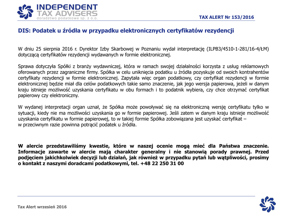 TAX ALERT Nr 153/2016 DIS: Podatek u źródła w przypadku elektronicznych certyfikatów rezydencji W dniu 25 sierpnia 2016 r. Dyrektor Izby Skarbowej w Poznaniu wydał interpretację (ILPB3/4510-1-281/16-4/ŁM) dotyczącą certyfikatów rezydencji wydawanych w formie elektronicznej. Sprawa dotyczyła Spółki z branży wydawniczej, która w ramach swojej działalności korzysta z usług reklamowych oferowanych przez zagraniczne firmy. Spółka w celu uniknięcia podatku u źródła pozyskuje od swoich kontrahentów certyfikaty rezydencji w formie elektronicznej. Zapytała więc organ podatkowy, czy certyfikat rezydencji w formie elektronicznej będzie miał dla celów podatkowych takie samo znaczenie, jak jego wersja papierowa, jeżeli w danym kraju istnieje możliwość uzyskania certyfikatu w obu formach i to podatnik wybiera, czy chce otrzymać certyfikat papierowy czy elektroniczny. W wydanej interpretacji organ uznał, że Spółka może powoływać się na elektroniczną wersję certyfikatu tylko w sytuacji, kiedy nie ma możliwości uzyskania go w formie papierowej. Jeśli zatem w danym kraju istnieje możliwość uzyskania certyfikatu w formie papierowej, to w takiej formie Spółka zobowiązana jest uzyskać certyfikat – w przeciwnym razie powinna potrącić podatek u źródła. W alercie przedstawiliśmy kwestie, które w naszej ocenie mogą mieć dla Państwa znaczenie. Informacje zawarte w alercie mają charakter generalny i nie stanowią porady prawnej. Przed podjęciem jakichkolwiek decyzji lub działań, jak również w przypadku pytań lub wątpliwości, prosimy o kontakt z naszymi doradcami podatkowymi, tel. +48 22 250 31 00 Tax Alert wrzesień 2016