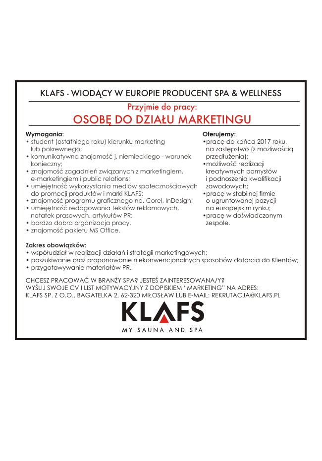 KLAFS - WIOD¥CY W EUROPIE PRODUCENT SPA & WELLNESS Przyjmie do pracy: OSOBÊ DO DZIA£U MARKETINGU Wymagania: • student (ostatniego roku) kierunku marketing lub pokrewnego; • komunikatywna znajomoœæ j. niemieckiego - warunek konieczny; • znajomoœæ zagadnieñ zwi¹zanych z marketingiem, e-marketingiem i public relations; • umiejêtnoœæ wykorzystania mediów spo³ecznoœciowych do promocji produktów i marki KLAFS; • znajomoœæ programu graficznego np. Corel, InDesign; • umiejêtnoœæ redagowania tekstów reklamowych, notatek prasowych, artyku³ów PR; • bardzo dobra organizacja pracy, • znajomoœæ pakietu MS Office. Oferujemy: •pracê do koñca 2017 roku, na zastêpstwo (z mo¿liwoœci¹ przed³u¿enia); •mo¿liwoœæ realizacji kreatywnych pomys³ów i podnoszenia kwalifikacji zawodowych; •pracê w stabilnej firmie o ugruntowanej pozycji na europejskim rynku; •pracê w doœwiadczonym zespole. Zakres obowi¹zków: • wspó³udzia³ w realizacji dzia³añ i strategii marketingowych; • poszukiwanie oraz proponowanie niekonwencjonalnych sposobów dotarcia do Klientów; • przygotowywanie materia³ów PR. CHCESZ PRACOWAÆ W BRAN¯Y SPA? JESTEŒ ZAINTERESOWANA/Y? WYŒLIJ SWOJE CV I LIST MOTYWACYJNY Z DOPISKIEM “MARKETING” NA ADRES: KLAFS SP. Z O.O., BAGATELKA 2, 62-320 MI£OS£AW LUB E-MAIL: [email protected]