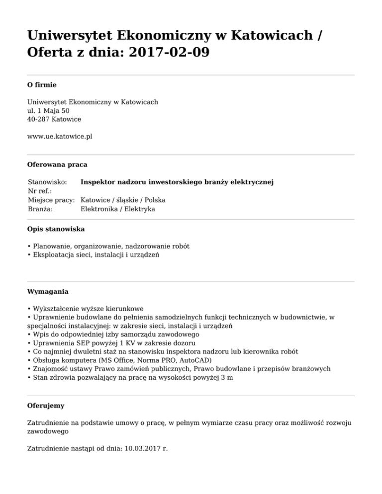 Uniwersytet Ekonomiczny w Katowicach / Oferta z dnia: 2017-02-09 O firmie Uniwersytet Ekonomiczny w Katowicach ul. 1 Maja 50 40-287 Katowice www.ue.katowice.pl Oferowana praca Stanowisko: Inspektor nadzoru inwestorskiego branży elektrycznej Nr ref.: Miejsce pracy: Katowice / śląskie / Polska Branża: Elektronika / Elektryka Opis stanowiska • Planowanie, organizowanie, nadzorowanie robót • Eksploatacja sieci, instalacji i urządzeń Wymagania • Wykształcenie wyższe kierunkowe • Uprawnienie budowlane do pełnienia samodzielnych funkcji technicznych w budownictwie, w specjalności instalacyjnej: w zakresie sieci, instalacji i urządzeń • Wpis do odpowiedniej izby samorządu zawodowego • Uprawnienia SEP powyżej 1 KV w zakresie dozoru • Co najmniej dwuletni staż na stanowisku inspektora nadzoru lub kierownika robót • Obsługa komputera (MS Office, Norma PRO, AutoCAD) • Znajomość ustawy Prawo zamówień publicznych, Prawo budowlane i przepisów branżowych • Stan zdrowia pozwalający na pracę na wysokości powyżej 3 m Oferujemy Zatrudnienie na podstawie umowy o pracę, w pełnym wymiarze czasu pracy oraz możliwość rozwoju zawodowego Zatrudnienie nastąpi od dnia: 10.03.2017 r. Forma kontaktu Wymagane dokumenty: • CV • list motywacyjny • skany odpisów/kopii dokumentów potwierdzających wykształcenie, kwalifikacje i doświadczenie Pliki/skany dokumentów należy przesłać pocztą mailową na adres: [email protected] (w tytule wiadomości należy wpisać: „Ogłoszenie nr 01/GTE/2017”), Termin składania dokumentów upływa w dniu: 28.02.2017 r. Po wstępnej weryfikacji złożonych ofert, w dniach od 1 do 3 marca 2017 r., zostaną przeprowadzone rozmowy kwalifikacyjne z wybranymi kandydatami. Rozstrzygnięcie i ogłoszenie wyników konkursu nastąpi do dnia: 06.03.2017 r. Dane firmowe Uniwersytet Ekonomiczny w Katowicach 1 Maja 50 40-287 Katowice Email: [email protected] / WWW: www.ue.katowice.pl