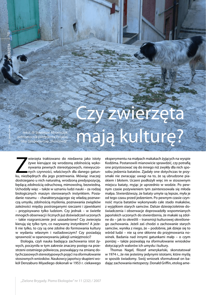 10 ZWIERZĘTA fot. www.sxc.hu tekst: dr Stanisław Abramczyk pełnomocnik prezydenta Polskiej Izby Gospodarczej „Ekorozwój” Czy zwierzęta mają kulturę? Z wierzęta traktowano do niedawna jako istoty żywe kierujące się wrodzoną zdolnością wykonywania pewnych stereotypowych, niewyuczonych czynności, właściwych dla danego gatunku, niezbędnych dla jego przetrwania. Mówiąc inaczej: dostrzegano u nich naturalną, wrodzoną predyspozycję, będącą zdolnością odruchową, mimowolną, bezwiedną. Uchodziły więc – także w uznaniu ludzi nauki – za rodzaj biologicznych maszyn sterowanych instynktem. Posiadanie rozumu – charakteryzującego się władzą poznawczą umysłu, zdolnością myślenia, poznawania związków zależności między postrzeganymi rzeczami i zjawiskami – przypisywano tylko ludziom. Czy jednak – w świetle mnogich obserwacji i licznych już doświadczeń uczonych – takie rozgraniczenie jest uzasadnione? Czy zwierzęta kierują się tylko tym, co nazywamy instynktem? A jeżeli nie tylko, to czy są one zdolne do formowania kultury w wydaniu własnym i naśladowczym? Czy posiadają sprawność w opanowywaniu jakiejś umiejętności? Etologia, czyli nauka badająca zachowania istot żywych, poczyniła w tym zakresie znaczny postęp na przestrzeni ostatniego półwiecza, pozwalający na zmianę dotychczasowych stereotypowych pojęć i na sformułowanie stosownych wniosków. Naukowcy japońscy skupieni wokół Denzaburo Miyadiego dokonali w 1953 r. ciekawego „Zielone Brygady. Pismo Ekologów” nr 11 (232) / 2007 eksperymentu na małpach makakach żyjących na wyspie Kodżima. Postanowili mianowicie sprawdzić, czy potrafią one przystosować się do innego niż zwykły dla nich sposobu jedzenia batatów. Zjadały one dotychczas te przysmaki nie zwracając uwagi na to, że są ubrudzone piaskiem i błotem. Uczeni podłożyli więc im w stosownym miejscu bataty, myjąc je uprzednio w wodzie. Po pewnym czasie pożywieniem tym zainteresowała się młoda małpa. Stwierdziwszy, że bataty umyte są lepsze, myła je od tego czasu przed jedzeniem. Po pewnym czasie czynność mycia batatów wykonywało całe stado makaków, z wyjątkiem starych samców. Dalsze dziesięcioletnie doświadczenia i obserwacje doprowadziły wspomnianych japońskich uczonych do stwierdzenia, że makaki są zdolne do – jak to określili – transmisji kulturowej określonego zachowania. Jeżeli zaś chodzi o zachowanie starych samców, wynika z niego, że – podobnie, jak dzieje się to wśród ludzi – nie są one skłonne do przyjmowania nowinek. Badania nad innymi gatunkami małp – o czym poniżej – także pozwalają na sformułowanie wniosków dotyczących walorów ich umysłu i kultury. Thomas Nagel, filozof amerykański, skonstatował w 1974 r., że nie jesteśmy jedynymi istotami, które myślą w sposób świadomy. Swój wniosek sformułował on badając zachowania nietoperzy. Donald Griffin, etolog ame- Wnioski wynikające nieodparcie z naszkicowanego tu dorobku uczonych, obserwacji potocznych i z obecnego stanu środowiska naturalnego powinny przyczynić się do znacznie większego niż dotychczas uczłowieczenia homo sapiens. Powinny też stać się impulsem do budowy nowej, opartej na ekosocjologicznym systemie wartości, cywilizacji równowagi, charakteryzującej się harmonią w stosunkach między ludźmi i w relacjach ludzi z przyrodą. Troszczmy się więc nie tylko o siebie, ale i o upodmiotowionych rozumowo i kulturowo w różnych zakresach naszych „braci mniejszych” jak określił zwierzęta św. Franciszek z Asyżu. „Zielone Brygady. Pismo Ekologów” nr 11 (232) / 2007 11 ZWIERZĘTA To wszystko dowodzi, że zwierzęta mają swój rozum, subiektywną świadomość, życie społeczne, zdolności adaptacyjne, a więc kulturę. Nic przeto dziwnego, że Dominique Lestel, filozof i etolog, w wyniku analizy tego rodzaju obserwacji i doświadczeń, napisał: Niewielu ludzi zdaje sobie sprawę, do jakiego stopnia nasze wyobrażenia na temat zwierząt zostały wywrócone w ciągu minionych 30 lat, w tym także przez samych etologów. Jest to zmiana o takim samym charakterze jak rewolucja kwantowa w fizyce w pierwszej połowie XX wieku czy narodziny biologii molekularnej w drugiej połowie ubiegłego stulecia. Zwierzę stało się podmiotem – i to nie dlatego, że nasze popularne sentymentalne wyobrażenia nakazują tak je postrzegać, lecz dlatego, że najnowsze prace naukowe nie pozostawiają nam wyboru. Niestety, znaczna ilość gatunków zwierząt – ze względu na swój ustrój organiczny, rodzaj niezbędnego pożywienia i przyrodniczego środowiska życia – nie może przystosować się do warunków cywilizacji formowanej przez ludzi, głównie w pogoni za maksymalizacją doraźnych korzyści materialnych. Ginie więc bezpowrotnie z nieodwracalną szkodą dla różnorodności biologicznej świata i dla ludzi. fot. www.sxc.hu rykański, pod koniec lat 1970. doszedł do analogicznych ustaleń w oparciu o obserwacje ciem, siewek, sikorek i innych istot żywych. Na przykład ćmy zrywają się nagle do lotu we wszystkie strony, dostrzegłszy zbliżającego się nietoperza, gdyż w rozproszeniu trudno je pochwycić, a w razie udanego łowu tego drapieżnika szkoda w rozproszonym stadzie ciem byłaby mniejsza niż wtedy, gdyby znajdowały się one w skupieniu. Siewki, podobnie jak inne ptaki opiekujące się potomstwem, udają ranne i kalekie po to, aby odwieść drapieżnika od swojego gniazda. Sikorki, aby raczyć się smaczną śmietanką, nauczyły się w latach 1930. przebijać kapsle na butelkach z mlekiem zostawianych przed drzwiami domów. Inni podają przykłady: rozbijania przez papugi orzechów i innych owoców celem zjedzenia ich zawartości; posługiwania się przez małpy patykiem lub innym elementem roślinnym w celu wydobycia z kryjówek pożywnych termitów lub miodu pszczelego. Niektóre sępy dobierają się do smacznego dla nic