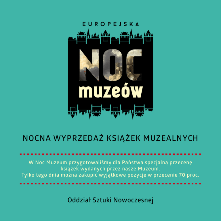Nocna wyprzedaż książek muzealnych W Noc Muzeum przygotowaliśmy dla Państwa specjalną przecenę książek wydanych przez nasze Muzeum. Tylko tego dnia można zakupić wyjątkowe pozycje w przecenie 70 proc. Oddział Sztuki Nowoczesnej Londyńska kolekcja Halimy Nałęcz w Muzeum Narodowym w Gdańsku katalog zbiorów, 2013 Bogato ilustrowany, obszerny katalog z 2013 roku, towarzyszący wystawie pod tym samym tytułem. Dokumentuje kolekcję malarstwa zachodnioeuropejskiego i polskiego drugiej połowy XX wieku., gromadzoną przez Halimę Nałęcz, właścicielkę Drian Galeries w Londynie. Kolekcja została podarowana Muzeum Narodowemu w Gdańsku w 1983 roku. Cena: 76,00 PLN Cena obowiązująca w Noc Muzeów: 22,80 PLN Teresa Miszkin. Malarstwo Wybitni Twórcy Wybrzeża Katalog wystawy katalog wystawy czasowej 2006 Wojciech Zmorzyński (red.) Bogato ilustrowany katalog wystawy monograficznej gromadzącej największy do tej pory dorobek artystki. W publikacji znalazły się także: nota biograficzna, wykaz wystaw indywidualnych i zbiorowych, nagród oraz obrazów w zbiorach muzealnych. Cena: 37 PLN Cena obowiązująca w Noc Muzeów 11,10 PLN Erwin Elster. Malarstwo Wybitni Twórcy Wybrzeża Katalog wystawy czasowej, 2010 Wojciech Zmorzyński (red.) Katalog przybliża postać, jego twórczość w okresie 20-lecia międzywojennego oraz opowiada o malarstwie artysty. W drugiej części przedstawia 49 obrazów olejnych, 83 akwarele i 16 rysunków (tusz lawowany). Jako organizator i członek Grupy Artystów Plastyków „Świt” w latach 1921– –1927 Erwin Elster brał udział w ekspozycjach w najbardziej prestiżowych ówczesnych galeriach, a jego twórczość była omawiana przez opiniotwórczą krytykę. W tym okresie był także wykładowcą w Państwowej Szkole Sztuk Zdobniczych i Przemysłu Artystycznego w Poznaniu. Na początku lat 20. zbliżył się w swojej twórczości do malarstwa formistów, poszukując jednocześnie własnej formuły – tworzył obrazy bardzo ekspresyjne, o mocnej konstrukcji. Akwarela stała się dla Elstera niezwykle ważnym medium. Właśnie w 2. poł. lat 20. artysta rozpoczął wakacyjne wędrówki wzdłuż Wisły, a także na Podolu, których szlak odnajdujemy dzisiaj w szeregu wedut. W latach 30., które przyniosły w Polsce swoistą modę na malarstwo wywodzące się z tradycji impresjonizmu i postimpresjonizmu, oparte na czystej grze kolorystycznej, walczące o autonomię obrazu, Elster dał się unieść tej fali koloryzmu. Po II wojnie włączył się aktywnie w odbudowę życia artystycznego w Poznaniu, podjął pracę w szkolnictwie, w tym w Państwowej Wyższej Szkole Sztuk Plastycznych w Poznaniu. Kiedy w 1954 r. został zlikwidowany Wydział Architektury Poznańskiej Szkoły Inżynierskiej zaproponowano mu przeniesienie do kilku ośrodków politechnicznych – wybrał Gdańsk. Cena: 53 PLN Cena obowiązująca w Noc Muzeów 15,90 PLN Alfons Kułakowski ... stamtąd i stąd ... (katalog wystawy czasowej, 2011) „Jako artysta wygnania, niezakorzenienia, niewoli i tułactwa Alfons Kułakowski włada wieloma malarskimi językami. Słońca maluje jak francuski mistyk. Rozproszona mgiełka, często pojawiająca na jego płótnach, gasząca żywość barw, kiedyś rozpoznawana była u kapistów jako ślad ich wschodniej i północnej genealogii. Biegły w tworzeniu grubo nakładanych, mięsistych rysunków pędzlem, Kułakowski zdaje się niekiedy krewnym Matisse’a. Fuzja rosyjsko-francuskiej baśniowości ukrywa jego więzi z Chagallem. Abstrakcja rodzi się u niego z samej konstrukcji obrazów, powielającej realne formy rzeczy aż do ich odrealnienia, do porzucenia treści na rzecz samego kształtu. Bywa pejzażystą postimpresjonistą, bywa ekspresjonistą śmiało i pewnie nakładającym farby na płótno. W ostatnim okresie Kułakowski, kiedy nad polskim polem zawiesza mięsisty, krwawy obłok, zdawać się może malarzem melancholii [...]” Z eseju Kazimiery Szczuki, zamieszczonego w katalogu Cena: 35 PLN Cena obowiązująca w Noc Muzeów 10,50 PLN Barbara Yoshida. 80 portretów (katalog wystawy czasowej, 2010) Barbara Yoshida, Mariola Balinska, Malgorztata Taraszkiewicz-Zwolicka Malgorztata Taraszkiewicz-Zwolicka (red.) Wystawa oraz towarzyszący jej katalog „80 portretów” realizowana w ramach projektu „Uwaga! Kobiety” prezentuje rozpoczęty w 1990 r. cykl klasycznych czarno – białych portretów kobiet artystek wykonanych przez nowojorską fotografkę Barbarę Yoshidę. Cena: 13 PLN Cena obowiązująca w Noc Muzeów 3,90 PLN Marian Kołodziej. Theatrum vitae Książka jest zbiorem artykułów, składających się na wszechstronną refleksję nad twórczością wybitnego go artysty i scenografa Mariana Kołodzieja, m.in. autora ołtarza papieskiego na Zaspie. Jest ona częścią projektu Marian Kołodziej. Teatr życia, w ramach którego odbyła się wystawa w Centrum św. Jana oraz dwudniowa konferencja, przybliżająca sylwetkę i twórczość artysty. Rok wydania 2013 Cena: 28,00 PLN Cena obowiązująca w Noc Muzeów: 8,40 zł Pani scenograf. Jadwiga Pożakowska na scenach polskich Kazimierz Braun Książka Pani scenograf. Jadwiga Pożakowska na scenach polskich opowiada historię jej twórczego życia. Przedstawia opisy wielu jej dzieł i jej własne wypowiedzi oraz obszerną, ścisłą dokumentację jej prac scenograficznych. Książka jest bogato ilustrowana – zawiera reprodukcje projektów scenograficznych i fotografie przestawień. Rok wydania 2010 Cena: 38 PLN Cena obowiązująca w Noc Muzeów 11,40 PLN Pół wieku z teatrem. Wystawa scenografii Jadwiga Pożakowska katalog wystawy czasowej, 2002 Katalog omawia i pokazuje projekty scenograficzne Jadwigi Pożakowskiej z podziałem na dramaturgię polską, festiwale (scenografie nagrodzone), sceny teatrów wielkich i kameralnych, sceny operowe (Gdańsk) i widowiska bajkowe. Cena: 9 PLN Cena obowiązująca w Noc Muzeów 2,70 PLN Wesele Stanisława Wyspiańskiego. Na te