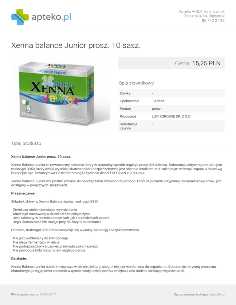 Apteka VIOLA Halina wiluk Żelazna 9/14, Białystok 85 742 27 35 Xenna balance Junior prosz. 10 sasz. Cena: 15,25 PLN Opis słownikowy Dawka - Opakowanie 10 sasz. Postać prosz. Producent USP ZDROWIE SP. Z O.O Substancja czynna - Opis produktu Xenna balance Junior prosz. 10 sasz. Xenna Balance Junior to nowoczesny preparat, który w naturalny sposób reguluje pracę jelit dziecka. Substancją aktywną produktu jest makrogol 3350, który dzięki wysokiej skuteczności i bezpieczeństwie jest obecnie środkiem nr 1 zalecanym w terapii zaparć u dzieci wg. Europejskiego Towarzystwa Gastroenterologii i żywienia dzieci ESPGHAN z 2014 roku. Xenna Balance Junior ma postać proszku do sporządzania roztworu doustnego. Produkt posiada przyjemny pomarańczowy smak, jest dostępny w poręcznych saszetkach. Przeznaczenie: Składnik aktywny Xenny Balance Junior, makrogol 3350: Zmiękcza stolec ułatwiając wypróżnianie Może być stosowany u dzieci od 6 miesiąca życia Jest zalecany w leczeniu doraźnych, jak i przewlekłych zaparć Jego skuteczność nie maleje przy dłuższym stosowaniu Ponadto, makrogol 3350 charakteryzuje się wysoką tolerancją i bezpieczeństwem Nie jest wchłaniany do krwioobiegu Nie ulega fermentacji w jelicie Nie podrażnia błony śluzowej przewodu pokarmowego Nie powoduje bólu brzucha ani nagłego parcia Działanie: Xenna Balance Junior działa miejscowo w obrębie jelita grubego i nie jest wchłaniana do organizmu. Substancję aktywną preparatu charakteryzuje wyjątkowa zdolność wiązania wody, dzięki czemu zmiękcza ona stolec ułatwiając wypróżnianie. Plik wygenerowano: 04-03-2017 Oprogramowanie sklepu: AptusShop Apteka VIOLA Halina wiluk Żelazna 9/14, Białystok 85 742 27 35 Przywrócenie prawidłowego stopnia nawodnienia mas kałowych prowadzi do pobudzenia naturalnych ruchów jelit, a w konsekwencji do wypróżnienia. Stosowanie: Zawartość saszetki należy rozpuścić w ¼ szklanki wody, soku lub herbaty (62,5 ml) i dobrze wymieszać, a następnie wypić. Dawkowanie: Dzieci od 6 miesiąca życia do 2 lat (o masie ciała do 12 kg) 1-2 saszetki (5 g każda) na dzień Dzieci od 2 do 11 roku życia (o masie ciała od 12 kg do 20 kg) 2-4 saszetki (5 g każda) na dzień Dzieci powyżej 11 roku życia (lub o masie ciała powyżej> 20 kg) 2-6 saszetek (5 g każda) na dzień Plik wygenerowano: 04-03-2017 Powered by TCPDF (www.tcpdf.org) Oprogramowanie sklepu: AptusShop