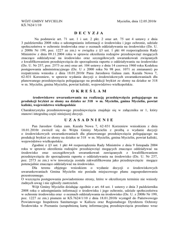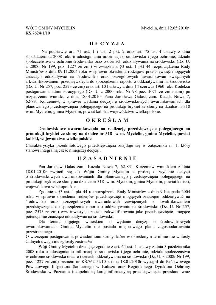WÓJT GMINY MYCIELIN KŚ.7624/1/10 Mycielin, dnia 12.05.2010r DECYZJA Na podstawie art. 71 ust. 1 i ust. 2 pkt. 2 oraz art. 75 ust 4 ustawy z dnia 3 października 2008 roku o udostępnianiu informacji o środowisku i jego ochronie, udziale społeczeństwa w ochronie środowiska oraz o ocenach oddziaływania na środowisko (Dz. U. z 2008r Nr 199, poz. 1227 ze zm.) w związku z §3 ust. 1 pkt 44 rozporządzenia Rady Ministrów z dnia 09.11.2004 roku w sprawie określenia rodzajów przedsięwzięć mogących znacząco oddziaływać na środowisko oraz szczegółowych uwarunkowań związanych z kwalifikowaniem przedsięwzięcia do sporządzenia raportu o oddziaływaniu na środowisko (Dz. U. Nr 257, poz. 2573 ze zm) oraz art. 104 ustawy z dnia 14 czerwca 1960 roku Kodeksu postępowania administracyjnego (Dz. U z 2000 roku Nr 98 poz. 1071 ze zmianami) po rozpatrzeniu wniosku z dnia 18.01.2010r Pana Jarosława Galasa zam. Kazala Nowa 7, 62-831 Korzeniew, w sprawie wydania decyzji o środowiskowych uwarunkowaniach dla planowanego przedsięwzięcia polegającego na produkcji brykiet ze słomy na działce nr 318 w m. Mycielin, gmina Mycielin, powiat kaliski, województwo wielkopolskie. OKREŚLAM środowiskowe uwarunkowania na realizację przedsięwzięcia polegającego na produkcji brykiet ze słomy na działce nr 318 w m. Mycielin, gmina Mycielin, powiat kaliski, województwo wielkopolskie Charakterystyka przedmiotowego przedsięwzięcia znajduje się w załączniku nr 1, który stanowi integralną część niniejszej decyzji. UZASADNIENIE Pan Jarosław Galas zam. Kazala Nowa 7, 62-831 Korzeniew wnioskiem z dnia 18.01.2010r zwrócił się do Wójta Gminy Mycielin z prośbą o wydanie decyzji o środowiskowych uwarunkowaniach dla planowanego przedsięwzięcia polegającego na produkcji brykiet ze słomy na działce nr 318 w m. Mycielin, gmina Mycielin, powiat kaliski, województwo wielkopolskie. Zgodnie z §3 ust. 1 pkt 44 rozporządzenia Rady Ministrów z dnia 9 listopada 2004 roku w sprawie określenia rodzajów przedsięwzięć mogących znacząco oddziaływać na środowisko oraz szczegółowych uwarunkowań zawiązanych z kwalifikowaniem przedsięwzięcia do sporządzenia raportu o oddziaływaniu na środowisko (Dz. U. Nr 257, poz. 2573 ze zm.) w/w inwestycja została zakwalifikowana jako przedsięwzięcie mogące potencjalnie znacząco oddziaływać na środowisko. Dla terenu objętego wnioskiem o wydanie decyzji o środowiskowych uwarunkowaniach Gmina Mycielin nie posiada miejscowego planu zagospodarowania przestrzennego. O wszczęciu postępowania powiadomiono strony, które w określonym terminie nie wniosły żadnych uwag i nie zgłosiły zastrzeżeń. Wójt Gminy Mycielin działając zgodnie z art. 64 ust. 1 ustawy z dnia 3 października 2008 roku o udostępnianiu informacji o środowisku i jego ochronie, udziale społeczeństwa w ochronie środowiska oraz o ocenach oddziaływania na środowisko (Dz. U. z 2008r Nr 199, poz. 1227 ze zm.) pismem nr KŚ.7624/1/10 z dnia 18.01.2010r wystąpił do Państwowego Powiatowego Inspektora Sanitarnego w Kaliszu oraz Regionalnego Dyrektora Ochrony Środowiska w Poznaniu (uzupełnioną kartę informacyjną przedsięwzięcia przesłano wraz z pismem z dnia 29.03.2010r) z prośbą o wydanie opinii w sprawie obowiązku przeprowadzenia oceny oddziaływania na środowisko dla w/w przedsięwzięcia. Państwowy Powiatowy Inspektor Sanitarny w Kaliszu pismem nr ON-NS-72/3-8(1)/10 z dnia 03.02.2010r (data wpływu 16.02.2010r) wydał opinię sanitarną, iż planowana inwestycja może potencjalnie znacząco wpływać na środowisko i zasadne jest sporządzenie raportu o oddziaływaniu przedsięwzięcia na środowisko. Regionalny Dyrektor Ochrony Środowiska w Poznaniu pismem nr RDOŚ-30-OO.I-66190-449/10/akr z dnia 15.04.2010r (data wpływu 19.04.2010r) uznał, iż dla przedmiotowej inwestycji nie zachodzi potrzeba przeprowadzenia oceny oddziaływania na środowisko a co za tym idzie sporządzenia raportu o oddziaływaniu na środowisko. Po uzyskaniu powyższych opinii Wójt Gminy Mycielin działając na podstawie art. 63 ust. 1 w/w ustawy wydał postanowienie nr KŚ.7624/1/10 z dnia 30.04.2010r w którym stwierdził brak obowiązku przeprowadzenia oceny oddziaływania na środowisko dla przedmiotowego przedsięwzięcia. Brak obowiązku przeprowadzenia oceny oddziaływania przedsięwzięcia na środowisko stwierdzono, uwzględniając następujące uwarunkowania, o których mowa w art. 63 ust. 1 ustawy o udostępnianiu informacji o środowisku i jego ochronie, udziale społeczeństwa w ochronie środowiska oraz o ocenach oddziaływania na środowisko: 1) rodzaj i charakterystykę przedsięwzięcia: Projektowana instalacja do produkcji brykietów ze słomy zlokalizowana zostanie w miejscowości Mycielin na działce nr 318, na terenie istniejącego gospodarstwa rolnego w dawnym budynku garażowym. Słoma dostarczana będzie w postaci balotów przy pomocy ciągników rolniczych raz dziennie. Inwestor przewiduje zainstalowanie urządzeń (brykieciarka i rozdrabniacz słomy) w murowanym budynku garażowym. Odbiór produktu prowadzony będzie przy użyciu samochodów ciężarowych z częstotliwością raz w tygodniu. Planowana wielkość produkcji brykietów na rok wyniesie 780 Mg. Instalacja do produkcji brykietów będzie pracowała wyłącznie w porze dziennej przez 8 godzin (maksymalnie 10 godzin) dziennie, z wyłączeniem dni wolnych od pracy. 2) usytuowanie przedsięwzięcia z uwzględnieniem możliwego zagrożenia dla środowiska, w szczególności przy istniejącym użytkowaniu terenu, zdolności samooczyszczania się środowiska i odnawiania się zasobów naturalnych, walorów przyrodniczych i krajobrazowych oraz uwarunkowań miejscowych planów zagospodarowania przestrzennego: Planowana inwestycja zlokalizowana zostanie na działce nr 318 w m. Mycielin, która nie posiada ustalonego przeznaczenia pod względem zagospodarowania przestrzennego Gminy Mycielin 