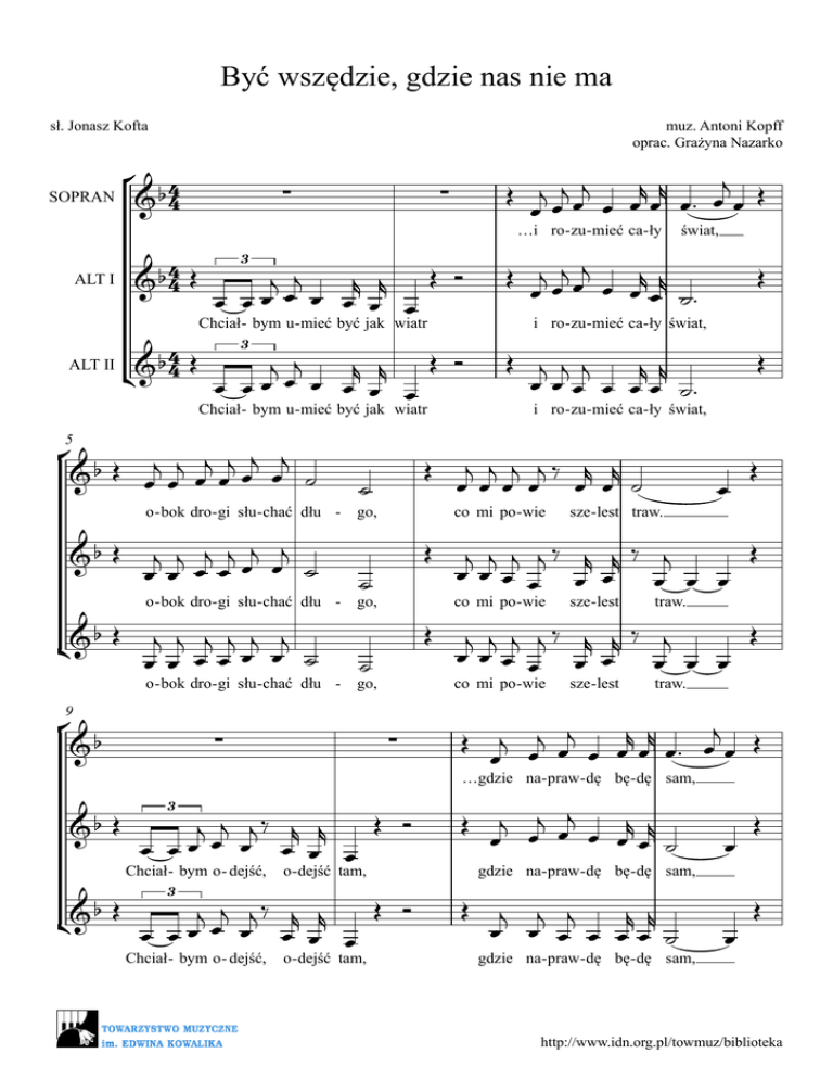 Być wszędzie, gdzie nas nie ma sł. Jonasz Kofta SOPRAN ° 4 & b4 4 & b4 Œ ALT I ALT II muz. Antoni Kopff oprac. Grażyna Nazarko ¢ 4 & b4 Œ ∑ …i ro - zu- mieć ca - ły Œ j j œj r r œ œ œ œ œ ˙™ Œ Œ Ó j j r r œ œ œœ œ œ œ œ Œ j j j r r œ œ œ œ œ œ ˙™ Œ Chciał- bym u - mieć być jak wiatr 3 Chciał- bym u - mieć być jak wiatr 5 o - bok dro- gi słu - chać dłu - ¢& bŒ ° b & j j j j œj œj ˙ œ œ œ œ &b Œ ¢& b Œ go, j j j j j j œ œ œ œ œ œ ˙ ˙ Œ Œ go, ∑ i ro - zu- mieć ca - ły świat, i ro - zu- mieć ca - ły świat, j j j j‰ r r œ œ œ œ œ œ ˙ co mi po - wie ˙ go, o - bok dro- gi słu - chać dłu - Œ ˙ o - bok dro- gi słu - chać dłu - 9 świat, Œ Ó j j r r œ œœ œ œ œ œ œ 3 ° j j j j & b Œ œj œj œ œ œ œ ˙ &b Œ Œ j j œj œr œr œ™ œj œ Œ œœ œ ∑ ∑ sze - lest traw. œ Œ Œ j j j j‰ r r ‰ j œ œ œ œ œ œ œ œ œ co mi po - wie sze - lest traw. co mi po - wie sze - lest traw. Œ j j j j‰ r r ‰ j œ œ œ œ œ œ œ œ œ Œ j Œ r r j j œj œ œ œ œ œ™ œ œ œ …gdzie na- praw- dę bę- dę sam, Œ Ó j j j‰ r r œ œœ œ œ œ œ œ Œ Œ Ó j j j‰ r r œ œ œœ œ œ œ œ Œ 3 Chciał- bym o - dejść, o - dejść tam, 3 Chciał- bym o - dejść, o - dejść tam, j j œj r œ œ œr ˙ œ œ gdzie na- praw- dę bę- dę sam, j j j r r œ œ œ œ œœ ˙ gdzie na- praw- dę bę- dę sam, œ œ Œ Œ http://www.idn.org.pl/towmuz/biblioteka ° j j j j & b Œ œj œj œ œ œ œ ˙ 2 13 ˙ Œ nad pły- ną - cą wol - no stru - gą &b Œ ¢& j j œj œj œj œj ˙ œ œ ˙ nad pły- ną - cą wol - no stru - gą bŒ j j j j j j œ œ œ œ œ œ ˙ ˙ nad pły- ną - cą wol - no stru - gą j j j Ó j ‰ j œ œ œ ™ œr œj œ œ œ swo - ich dni ob - my - śleć Œ Œ plan. Ó j j j r j j ‰ j œ œ œ™ œ œ œ œ œ swo - ich dni ob - my - śleć plan. swo - ich dni ob - my - śleć plan. Ó j j j r j j ‰ j œ œ œ™ œ œ œ œ œ ° j j j œ œ œ j j j j j r j j ‰ œj œj œj œ œ ‰ œ œr b ‰ ‰ œ œ œ œ & œ œ œ œ™ œ œ œ J J J J J R 17 Być wszę- dzie, gdzie nas nie ma to te-mat na po - e- mat. Tam gdzie nas nie ma, sta - je j j j j j j j j j j j j r & b ‰ œ œ œ œ œ œ œ ‰ œj œj œj j™ r j j ‰ œ œ œ œ œ ‰ œ œr œ œœ œ Być wszę- dzie, gdzie nas nie ma ¢& Tam gdzie nas nie ma, sta - je b ‰ j j j j j j j ‰ j j j j r j j ‰ j j j j j‰ r r œ œ œ œ œ œ œ œ œ œ œ œ œœ œ œ œ œ™ œ œ œ Być wszę- dzie, gdzie nas nie ma ° b & ˙™ Œ & b ˙™ Œ 20 czas. b ˙™ czas. to te-mat na po - e- mat. sta - je tę - skno- ta jest jak tre - ma, ‰ œj œj œj œj œj œj j ‰ j r r j ‰ j j j œ œ œ œ œ œ œ œ Być wszę- dzie, gdzie nas nie ma, Œ Tam gdzie nas nie ma, ‰ œj œj œj œ œ œ œj ‰ œj œr œr œj ‰ œj œj j J J J œ Być wszę- dzie, gdzie nas nie ma, czas. ¢& to te-mat na po - e- mat. ‰ tę - skno- ta jest jak tre - ma, j j j j j ‰ j r r j ‰ j j j œ œ œ œ œ œj œj œ œ œ œ œ œ œ Być wszę- dzie, gdzie nas nie ma, tę - skno- ta jest jak tre - ma, http://www.idn.org.pl/towmuz/biblioteka ° &b ‰ 3 23 j œ j œ j œ j œ j œ j œ j œ j œ j œ Œ j j j j j œ œ œ œ œ œ œ œ œœœ œ œ œ Œ wpi - su - je &b ‰ ¢& wpi - su - je b‰ wpi - su - je ° &b Ó 25 j œ j œ ‰ j œ j œ ‰ j œ j œ ‰ w sche - mat ¢& Œ j j j‰ r r œ œœ œ œ œ œ œ Œ Chciał- bym u - mieć Œ świat, Œ Œ świat, ˙™ świat, Œ wiatr. Œ ˙™ wiatr. Ó Œ Œ i ro - j j œj r r œœ œ œœ i ro - zu- mieć ca - ły Ó Œ j j j r r œœœ œ œœ i ro - zu- mieć ca - ły j j j j œj œj œ œ œ œ ˙ ˙ o - bok dro - gi słu - chać dłu j j j j œj œj œ œ œ œ œ dłu œ œœ ˙ j j j j j j œ œ œ œ œ œ œ œ œœ˙ o - bok dro - gi słu - chać Œ j j œœ Œ wiatr być jak wiatr 28 b wiatr. być jak wiatr ° b œ œ œ j œ 3 œ œ œ & J J J œ ¢& u - mieć być jak 3 ˙™ wol - ny Œ œ 3 Chciał- bym u - mieć &b ˙™ r r œ œ j j j‰ r r œ œœ œ œ œ œ œ zu- mieć ca - ły r r œ œ wol - ny w sche - mat 3 bŒ ˙ wol - ny w sche - mat Chciał- bym &b Œ r r œ œ o - bok dro - gi słu - chać dłu - go, - - go, go, http://www.idn.org.pl/towmuz/biblioteka ° & b Œ œj œj j j ‰ r r ‰ œj œ œ Œ œ œ #œ œ 4 31 co mi po - wie &b Œ ¢& sze - lest traw, Œ Œ j j j j‰ r r ‰ j œ œ œ œ œ œ œ œ œ Œ sze - lest co mi po - wie ° œ &b Œ 35 U ˙ - traw, sze - lest - ˙ j j œj œj œj œj ˙ œ œ ˙ j j j j j j œ œ œ œ œ œ ˙ ˙ nad pły - ną - cą wol - no stru - gą traw, nad pły - ną - cą wol - no stru - gą w u j j j j œj œj ˙ œ œ œ œ nad pły - ną - cą wol - no stru - gą. Œ j j j j‰ r r ‰ j œ œ œ œ œ œ œ œ œ co mi po - wie bŒ Œ w u - - ˙ u - Ó & b Œ œj œj j ≈ r j j ‰ j œ œ œ œ œ œ ¢& swo - ich dni bŒ ob - my - śleć ob - my - śleć ° b & 40 &b Œ ¢ u. ∑ ∑ ∑ ∑ ∑ ∑ plan. ∑ ∑ Ó Œ j j œ œ Do stra - j j r r‰ ‰ œ œ œ œ Gdzie mnie nie ma, &b Ó ∑ plan. ‰ j j j ≈ r j j ‰ j œ œ œ œ œ œ œ œ œ swo - ich dni Ó Œ r r œ œ œ Œ Ó Œ pój - dę tam. j j œ œ Gdzie mnie j j œj œ œ œ Do stra-ce - nia 3 j j j j œ œ œ œ œœ œœ nie ma,pój - dę tam. Œ j j j œ œ œ œ Do stra-ce - nia r r œ œ wie- le r r œ œ wie- le http://www.idn.org.pl/towmuz/biblioteka ° j j j j j 3j j b & œ œ œ œ œ œ œ œ 5 43 ce - nia wie - le &b ¢& Œ mam: swą bez - sen - ność w wiel - kim Ó ˙ Œ mam: b Ó Œ mam: 46 r r j j œ œ œ œ &b Œ ¢& j j j œœœ œ sza-ry bez - sens bŒ œ œœ˙ j j j œœœ œ sza-ry bez - sens j j œ œ œ œ swo - ich r r ‰ j œ œ œ œ swo - ich spraw. r r ‰ j œ œ œ œ swo - ich ° b j j j j 3 & œ œ œ œ œ œœœ Ó &b ¢& ˙ próg, Ó próg, b ˙ próg, - blo ku, - Ó ku, ‰ œr œr Œ spraw. œ Œ Kie- dyś Œ ‰ r 