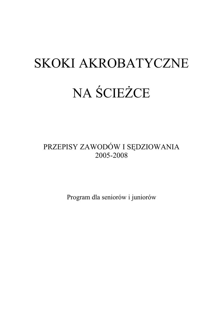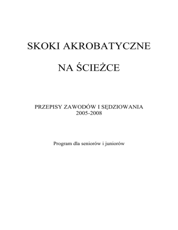 SKOKI AKROBATYCZNE NA ŚCIEŻCE PRZEPISY ZAWODÓW I SĘDZIOWANIA 2005-2008 Program dla seniorów i juniorów PRZEPISY ZAWODÓW FIG Obowiązują od luty 2005. Niniejsze przepisy obowiązują na wszystkich zawodach i mistrzostwach Międzynarodowej Federacji Gimnastyki (FIG) i jej członków. Są one przeznaczone do stosowania jako podstawa na zawodach na wszystkich poziomach. Tam gdzie stosuje się dodatkowe lub różne przepisy na specjalnych zawodach (np. Mistrzostwa Świata) to odpowiednie wyjątki/zmiany są uwidocznione kursywą (pismo pochyłe). Łącznie z tymi przepisami powinny zostać przeczytane następne dokumenty: - Przepisy Techniczne FIG - Techniczne Przepisy, Paragraf 4 - Normy FIG dla trampoliny, skoków, double mini-trampoliny - Przewodnik do sędziowania i interpretacji bieżących Przepisów - Przepisy Sędziowskie W wypadku jakichkolwiek sprzeczności pomiędzy tymi Przepisami i Technicznymi Przepisami – te ostatnie są decydujące. SKOKI A.PRZEPISY OGÓLNE 1. ZAWODY INDYWIDUALNE 1.1 Zawody w skokach na ścieżce składają się z 4 układów (3 układy w zawodach drużynowych). Każdy układ zawiera 8 elementów. 1.1.1.Skoki na ścieżce charakteryzują się stałą szybkością, elementami skokowymi z rytmiczną rotacją z rąk na stopy i ze stóp na stopy, bez zatrzymań lub kroków pośrednich. 1.1.2.Układ powinien być tak zaplanowany, aby pokazać różnorodność elementów w przód, w tył i bokiem. Układ powinien pokazać dobrą kontrolę, formę, wykonanie i utrzymanie tempa. 1.2. ELIMINACJE 1.2.1. Eliminacje składają się z dwóch układów dowolnych bez powtarzania elementów, za wyjątkiem elementów dozwolonych (patrz 15.1.). 1.2.1.1. Na zawodach przeprowadzonych pod kierunkiem narodowych Federacji można wykonywać układ obowiązkowy zamiast układu pierwszego lub w dwóch dowolnych układach wykonywać wymagania specjalne. 1.2.2 Kolejność startu w eliminacjach ustala się na drodze losowania zgodnie z § 1.2.2. Trampoliny i przepisem 4.4.1.1. Przepisów Technicznych, par. 4. 1.3 FINAŁY 1.3.1. Finał indywidualny składa się z dwóch układów dowolnych bez powtarzania elementów, za wyjątkiem elementów dozwolonych i jednego układu dowolnego w finale drużynowym (patrz 15.2.). 1.3.2. Zawodnicy z 8 najlepszymi ocenami z eliminacji kwalifikują się do finału. Patrz § 1.3.2. Trampoliny. 1.3.3. Kolejność startu w finale zależy od wyniku eliminacji, patrz § 1.3.3. Trampoliny. 2. ZAWODY DRUŻYNOWE 2.1 Zawody drużynowe – patrz § 2.1. Trampoliny. 2.2 Każdy członek drużyny wykonuje dwa układy dowolne wg § 1.2.1. i jeden układ dowolny wg § 1.3.1. 2.3 System oceny 2.3.1. Patrz § 2.3.1. Trampoliny 2.3.2.Na Mistrzostwach Świata i Kontynentalnych patrz § 2.3.2. Trampoliny i przepis 4.4.2.2. Przepisów Technicznych 4.ZWYCIĘZCY 4.1.Zwycięzcą jest zawodnik lub drużyna z najwyższą ilością wszystkich punktów. Na Mistrzostwach świata, Mistrzostwach Kontynentalnych Pucharach świata zwycięzcą jest zawodnik lub drużyna z najwyższą ilością punktów w finale. 4.2. Medale i miejsca będą nagradzane zgodnie z Przepisami 10.3. Przepisów Technicznych. 5. UKŁADY 5.1.Każdy układ składa się z 8 elementów. 5.2.Pierwszy i drugi układ dowolny w eliminacjach musi być wykonany bez powtórzenia elementu w każdym z układów zgodnie z § 15.1. 5.3.Układy w finale muszą być wykonane bez powtórzenia elementu w każdym z układów zgodnie z § 15.2. 5.4.W finale zawodnik może powtórzyć elementy lub układ z eliminacji. 5.5.Na Mistrzostwach Świata, Mistrzostwach Kontynentalnych Pucharach Świata dodatkowo do §1.2., 1.3.1., 5.1., 5.2., 5.3. i 5.4. w układach dowolnych muszą być wykonane następujące wymagania specjalne: 5.5.1. Układ pierwszy w eliminacjach (układ saltowy): 5.5.1.1. W układzie muszą być wykonane minimum 3 salta z nie więcej niż 180°, z których jedno musi być wykonane jako ostatnie (8-y element). Każde naruszenie tego wymagania będzie ukarane odjęciem 1,0 pkt. Z oceny każdego sędziego wykonania zgodnie z instrukcją Kierownika Komisji Sędziowskiej. 5.5.1.2. Żaden element nie może zawierać więcej niż 180° śruby. Każde naruszenie spowoduje niezaliczenie do trudności elementów nieliczących się. 5.5.2. Drugi układ w eliminacjach (układ śrubowy): 5.5.2.1. W układzie muszą być wykonane minimum dwa salta z co najmniej 360° śruby, z których jedno musi być wykonane jako ostatnie (8-y element). W tymże układzie musi być jeszcze wykonane dodatkowe salto z lub bez śruby. Każde naruszenie tego wymagania będzie ukarane odjęciem 1,0 pkt. z oceny każdego sędziego wykonania zgodnie z instrukcją Kierownika Komisji Sędziowskiej wg 21.4.5. 5.5.2.2. Ósmy element nie będzie liczony do trudności jeżeli nie będzie śrubowy (360° -obrotu). 5.5.3. Finał (dwa układy dowolne – 8 elementów) indywidualnie i 1 układ dowolny w finale drużynowym. 5.5.3.1. W układzie muszą być wykonane minimum trzy salta z lub bez śruby, jedno salto musi być wykonane jako ostatnie (8-y element). Każde naruszenie tego wymagania będzie ukarane odjęciem 1,0 pkt. z oceny każdego sędziego wykonania zgodnie z instrukcją Kierownika Komisji Sędziowskiej wg 21.4.5. 5.6.Układy zawierające mniej niż 3 elementy będą oceniane na zero. 5.7.Układ wykonuje się w jednym kierunku, jednak pojedynczy element w przeciwny kierunku jest dozwolony na końcu układu (8-y element). 5.8.Wszystkie kompletne układy muszą kończyć się saltem, zgodnie z §17.1 5.9.Jeżeli ostatni element nie jest wykonany w przeciwnym kierunku, to musi się on rozpoczynać ze ścieżki, a lądowanie musi być wykonane w obszarze lądowania. W przeciwnym wypadku nastąpi ukaranie odjęciem 0,2 pkt. przez każdego sędziego wykonania zgodnie z 21.4.6. 5.10. Nie zezwala się na wykonanie układu. 5.10.1. Jeżeli zawodnikowi w sposób oczywisty przeszkadzano w wykonywaniu układu (wada sprzętu lub istotny czynnik zewnętrzn